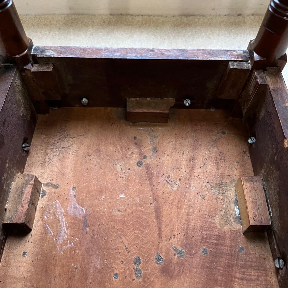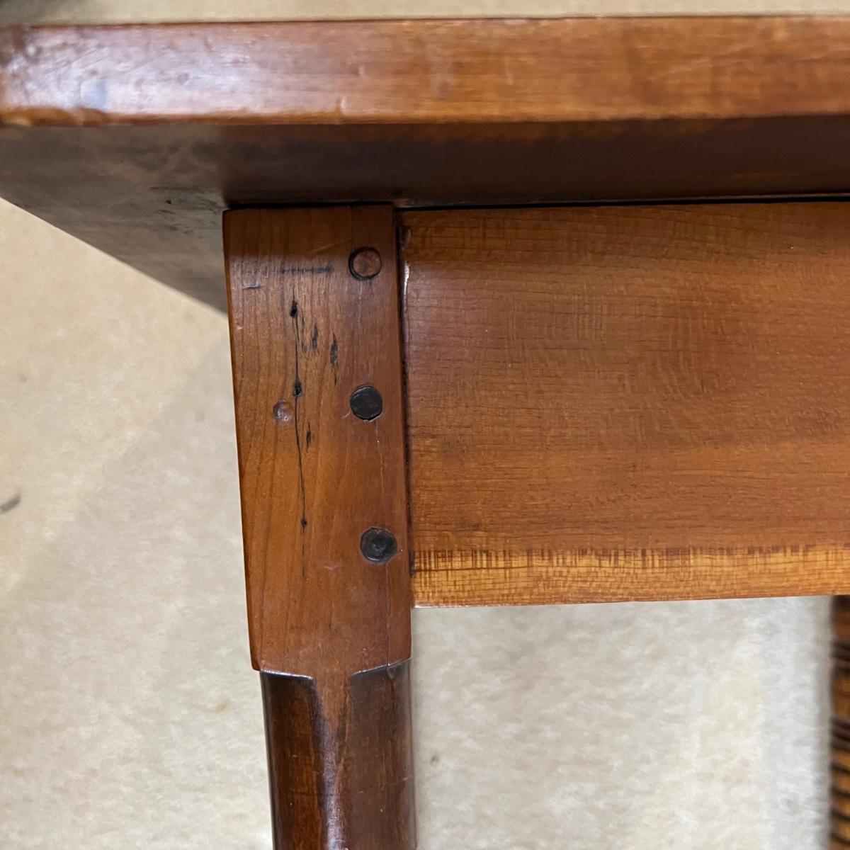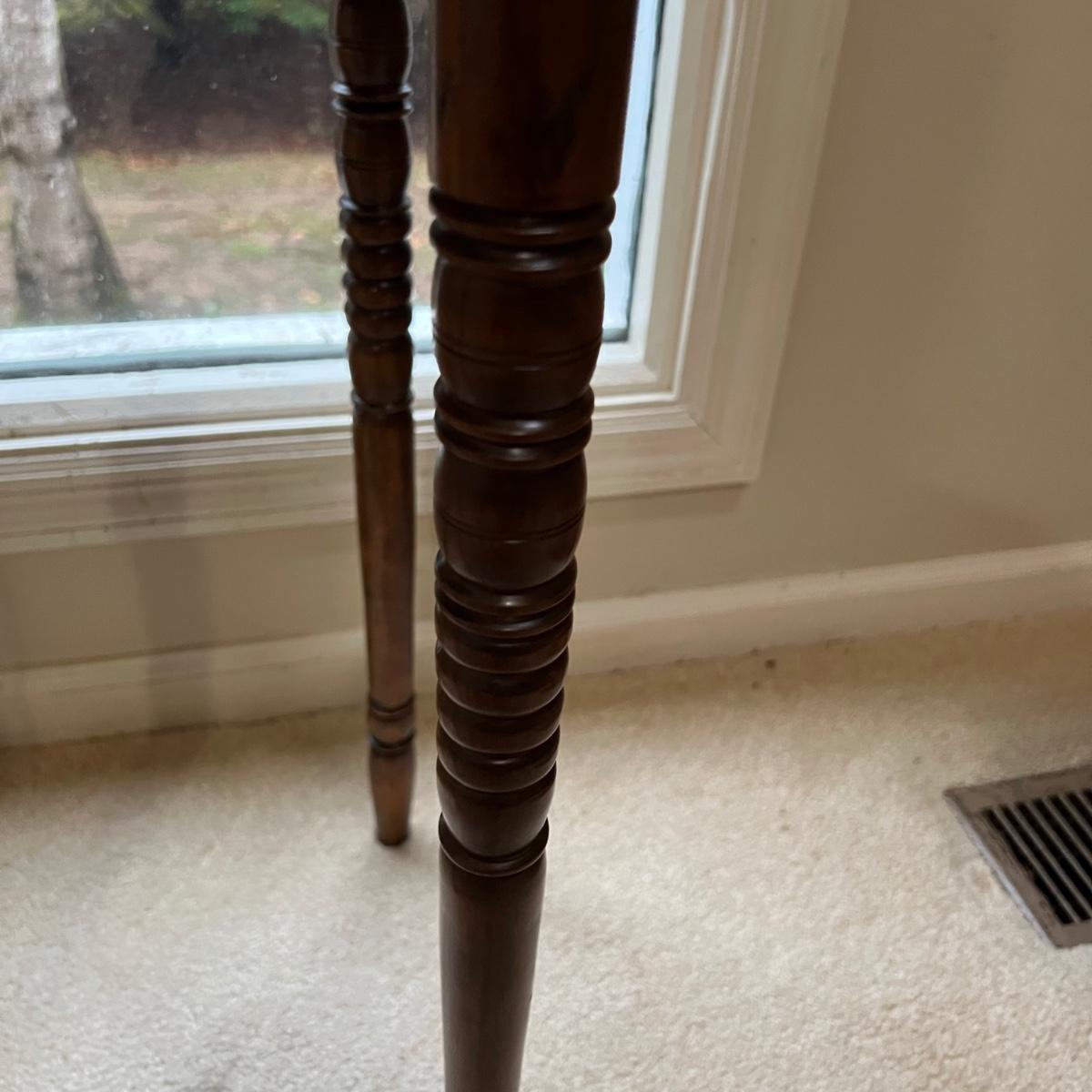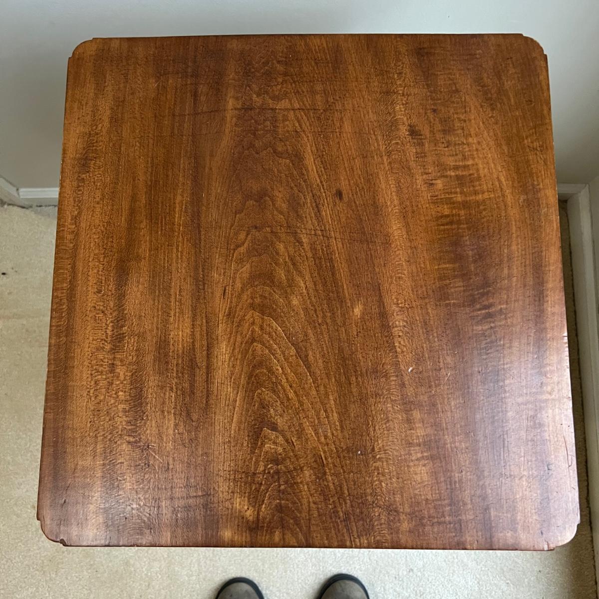 Graceful table 16.5” square, 26” tall with turned wood legs. Perfect anywhere. Stable, wood dowel-like joins on the corners give this piece a traditional, old-world feel. See images, local pick up only.