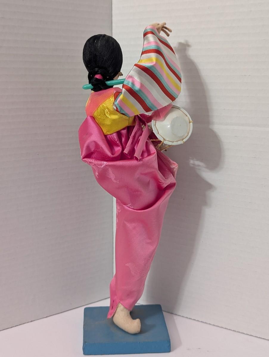 Decorative figure depicting a traditional Korean folk dancer wearing a pink hanbok style costume with multicolor striped sleeves and posed mid dance while holding a traditional drum. Features detailed facial painting, fabric clothing, articulated pose, and a painted base for display. Cultural decorative piece suitable for display, collection, or international folk art decor. No visible maker markings noted.