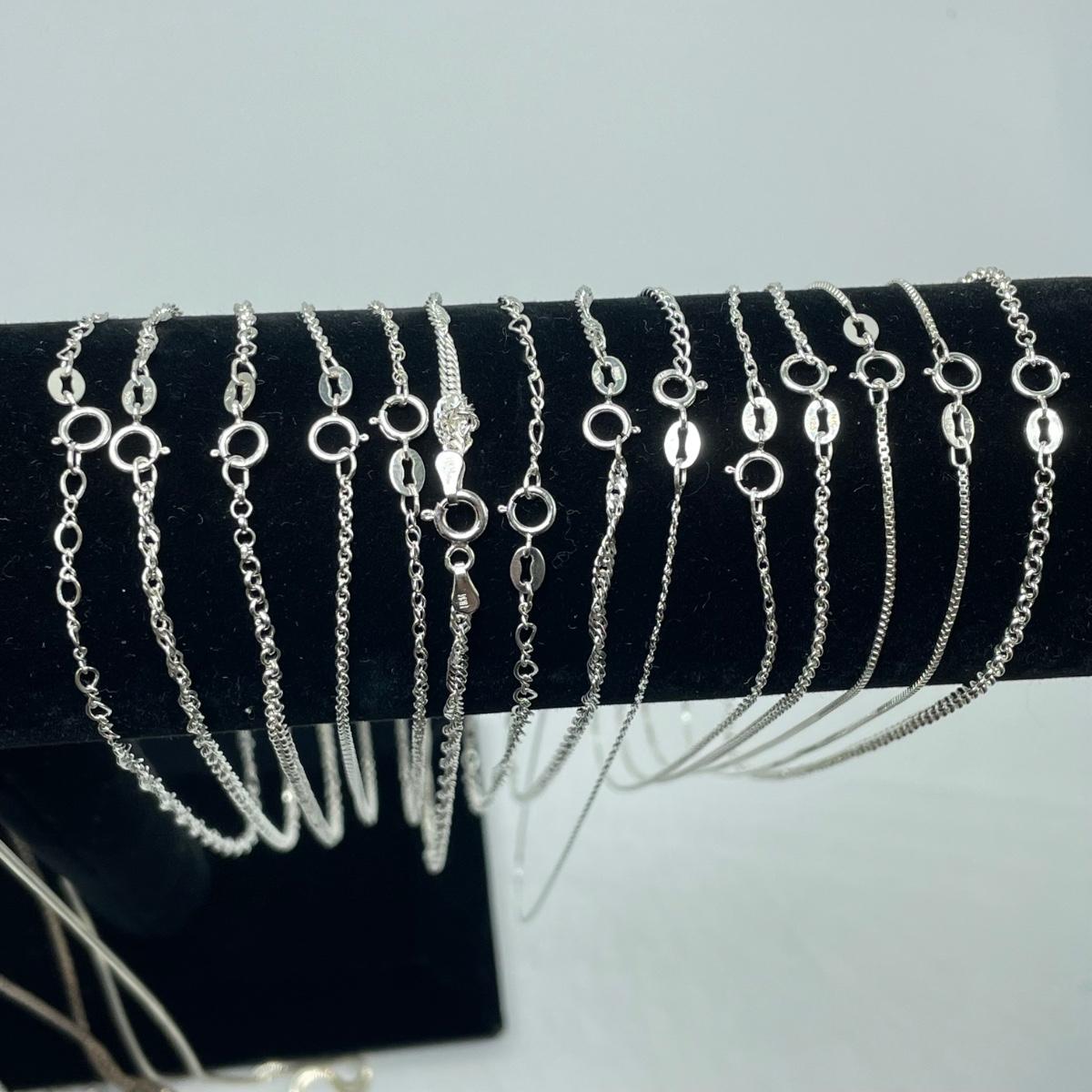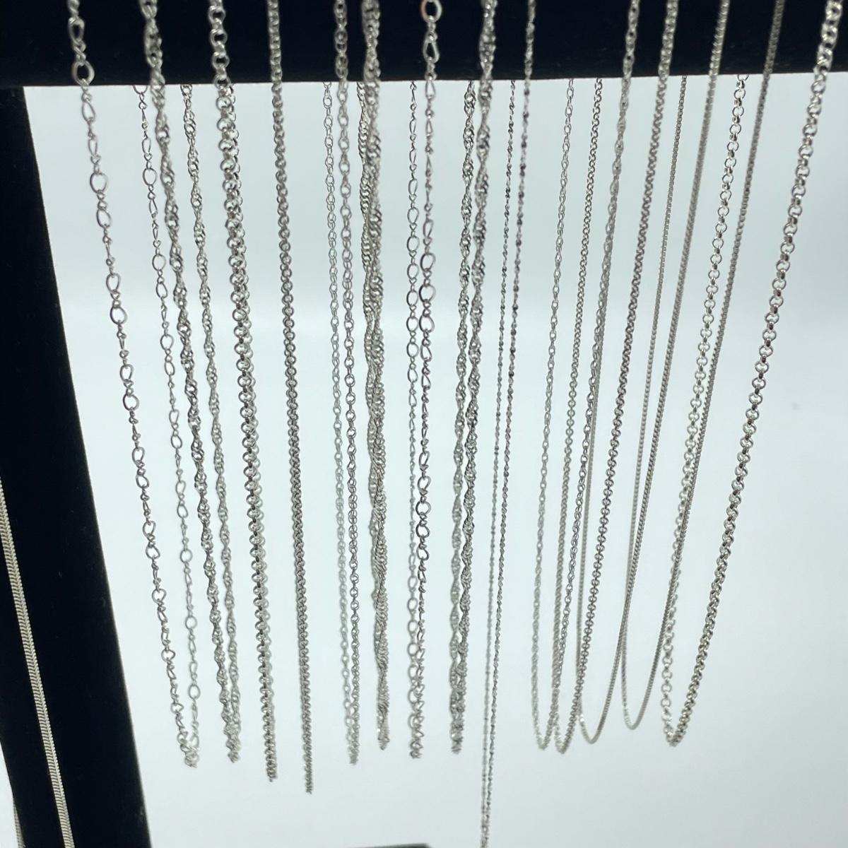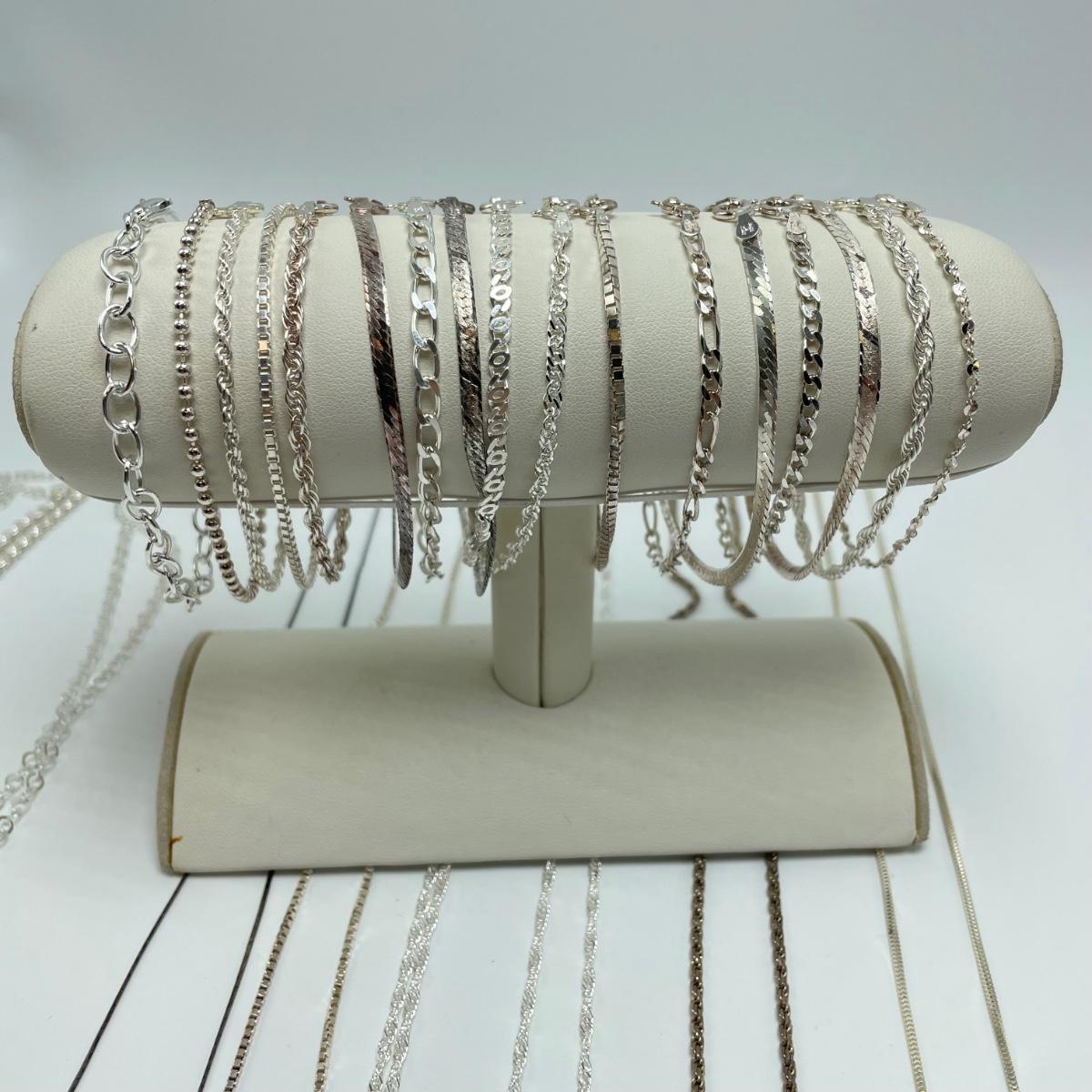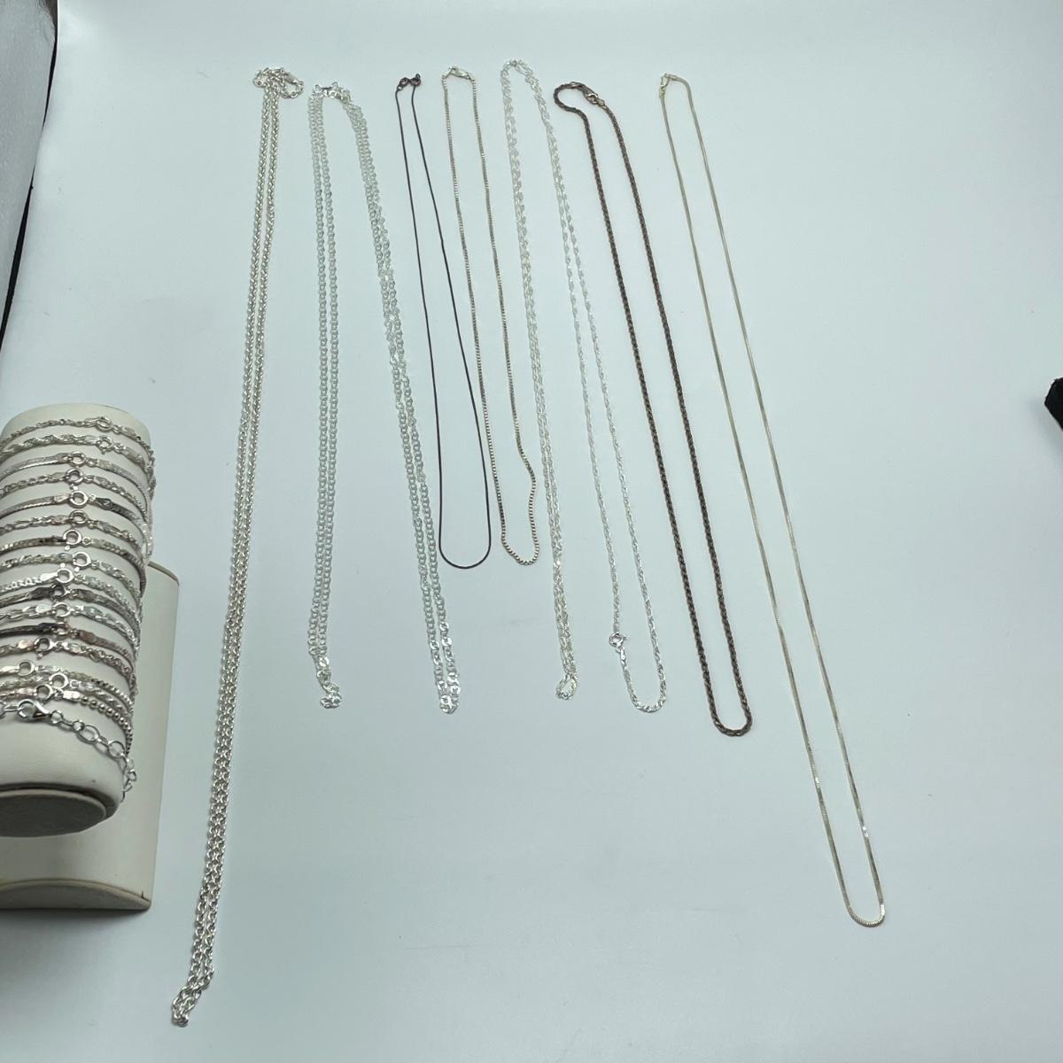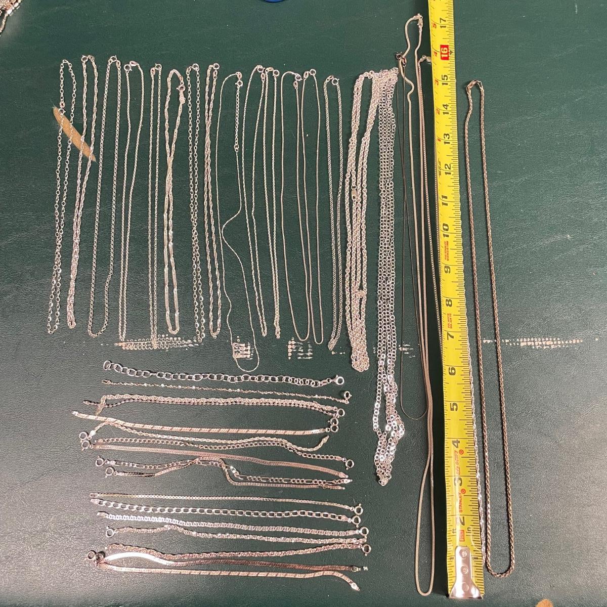 21 traditional chain necklaces and 17 bracelets with clasps marked 925. The longest necklace is 59”, shown doubled up in photos. Please see photos for all markings found. Starting bid is at or near melt value. All sales are final. No returns or refunds. Please bid accordingly.