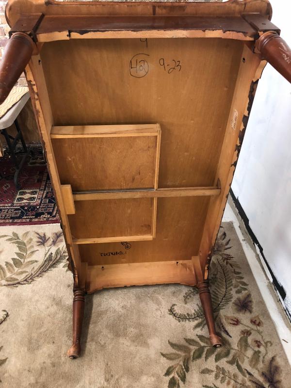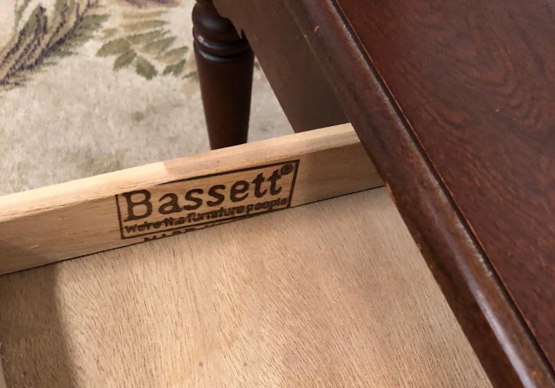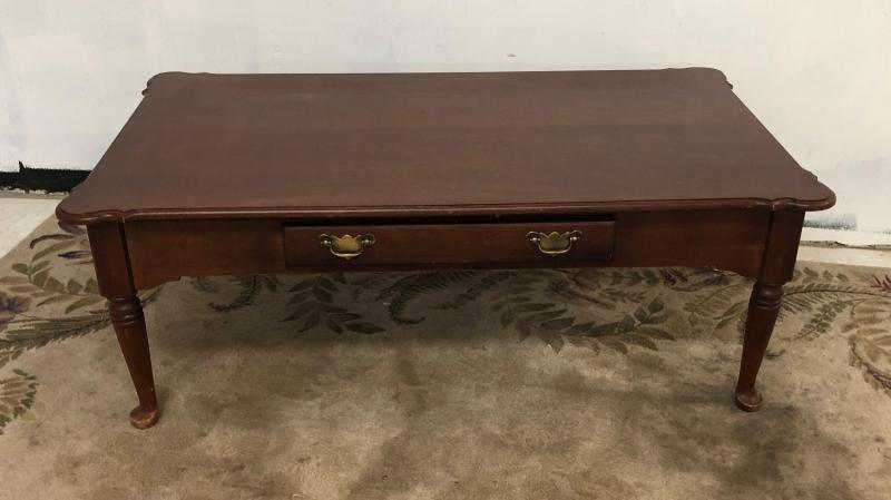 With a sliding drawer here is a Bassett Cherry Wood Coffee table in used condition...The bottom feet show the most use wear...48 x 28 x 18"...