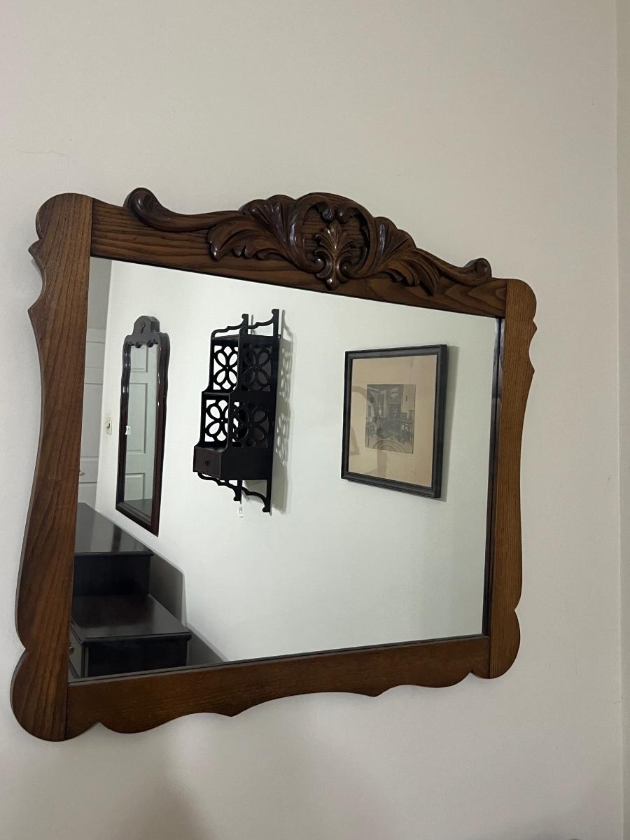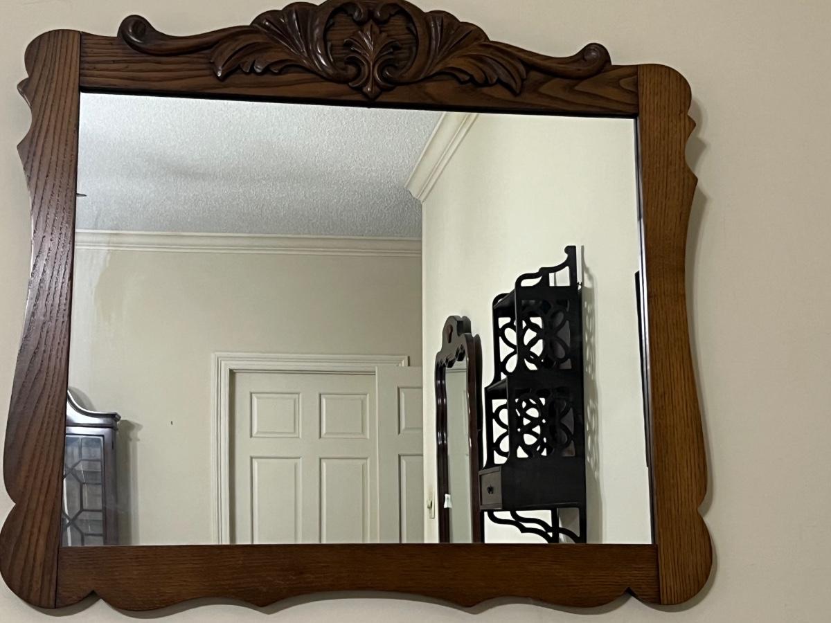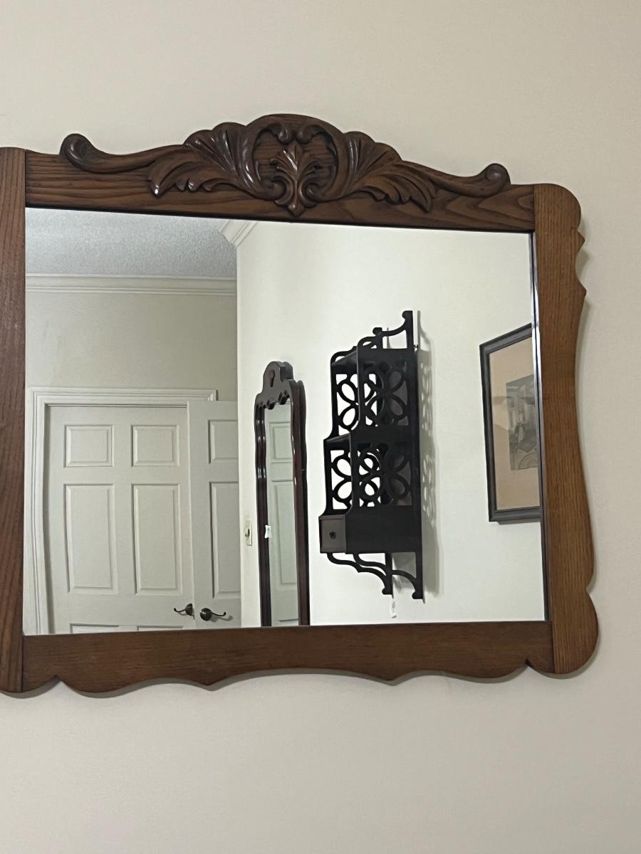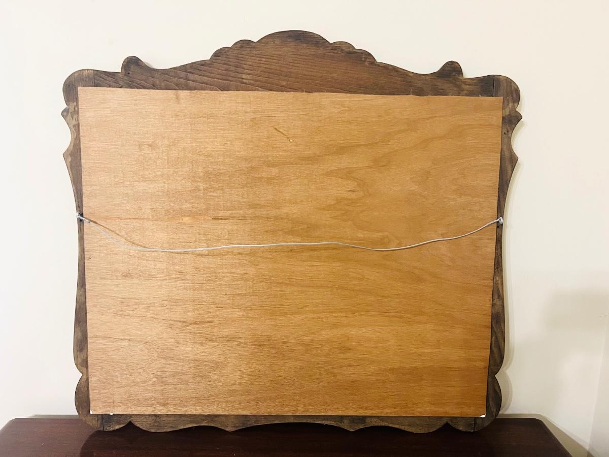 Traditional Wood Wall Mirror Measures 28 inches tall, 32 inches wide and 1 inch deep.