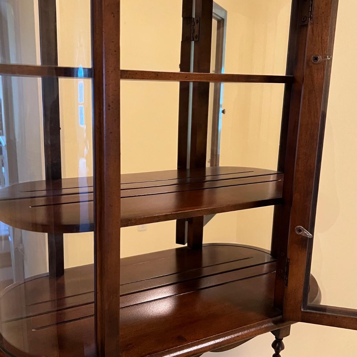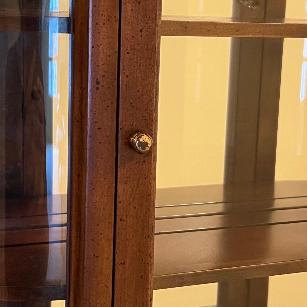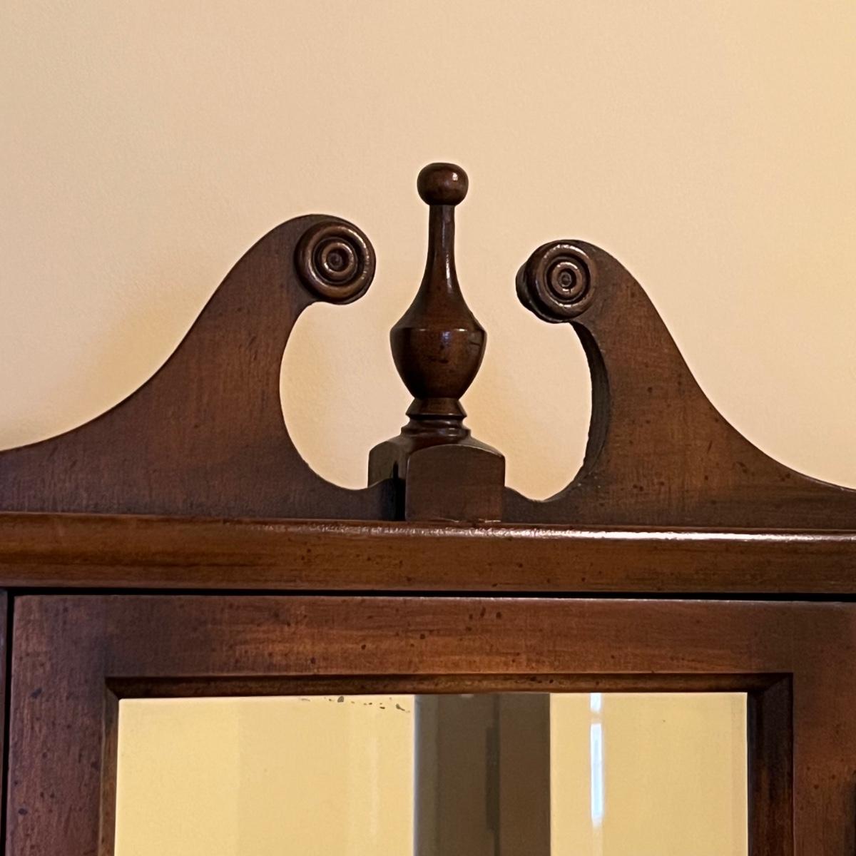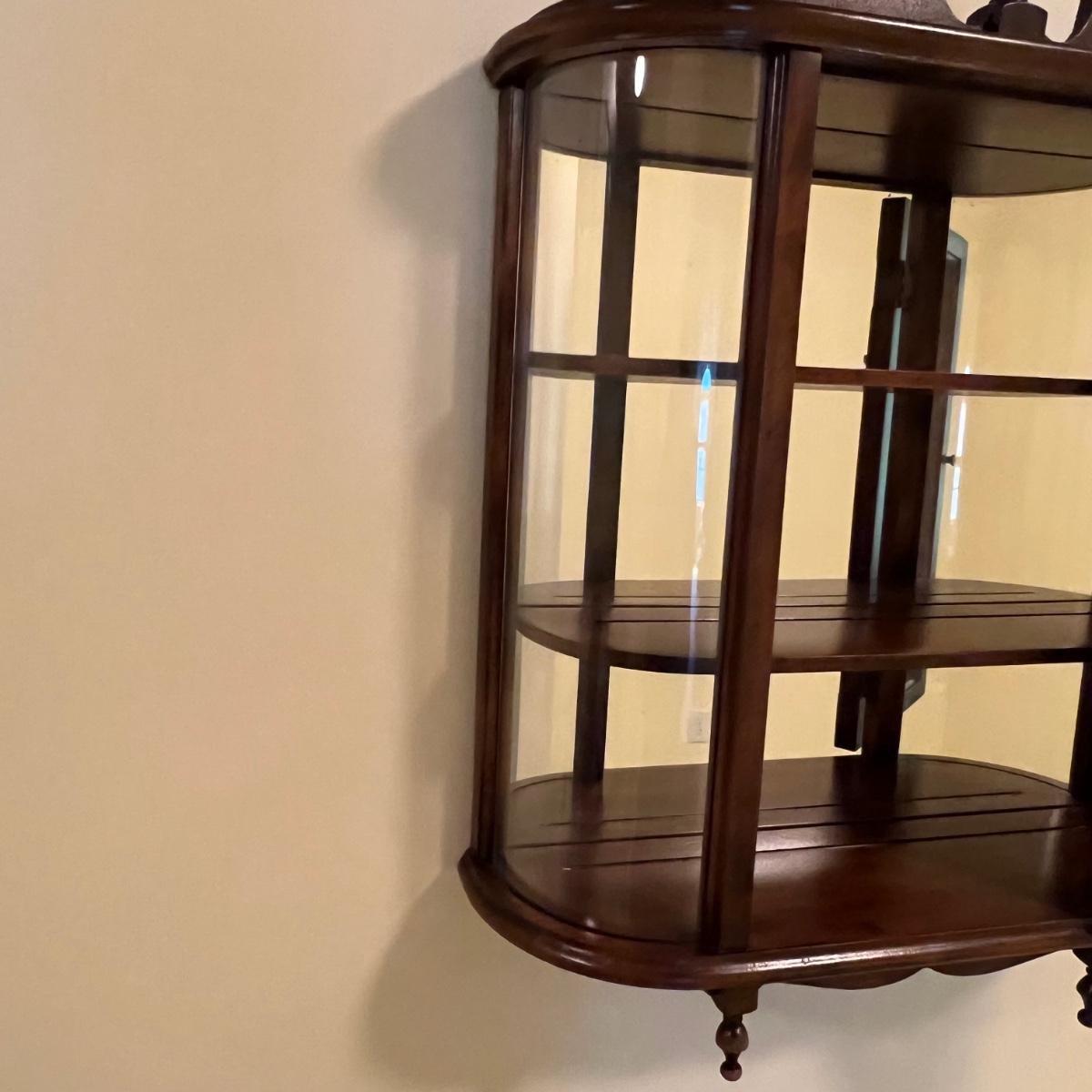 This wall curio is solid wood, possibly cherry. It has glass front and the back is a mirror to highlight your keepsakes. Two shelves have plate rails. Two hooks on the back for hanging.