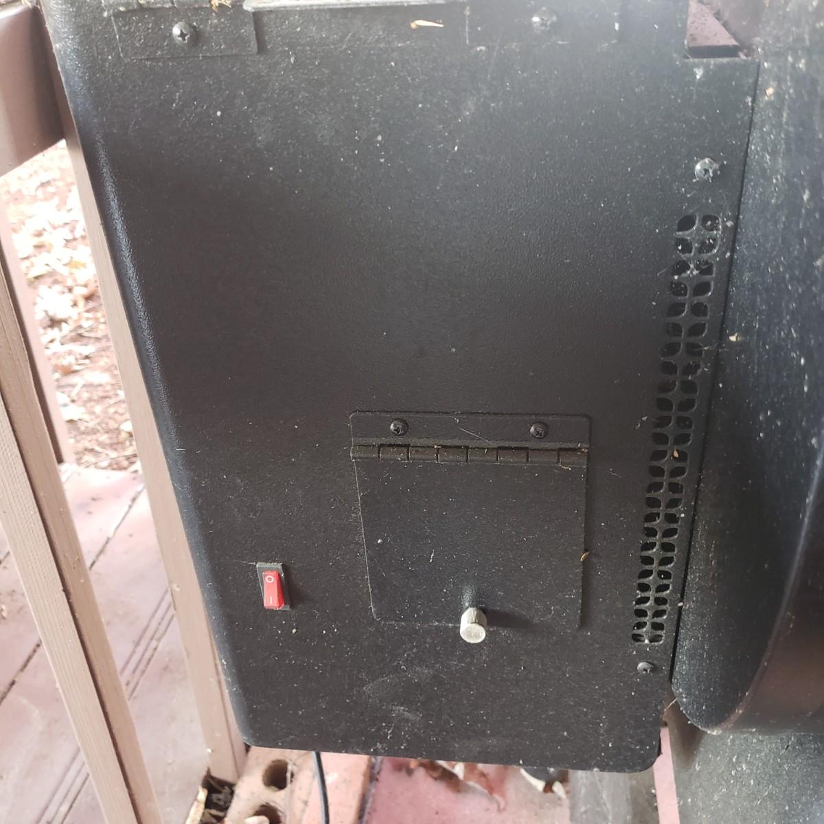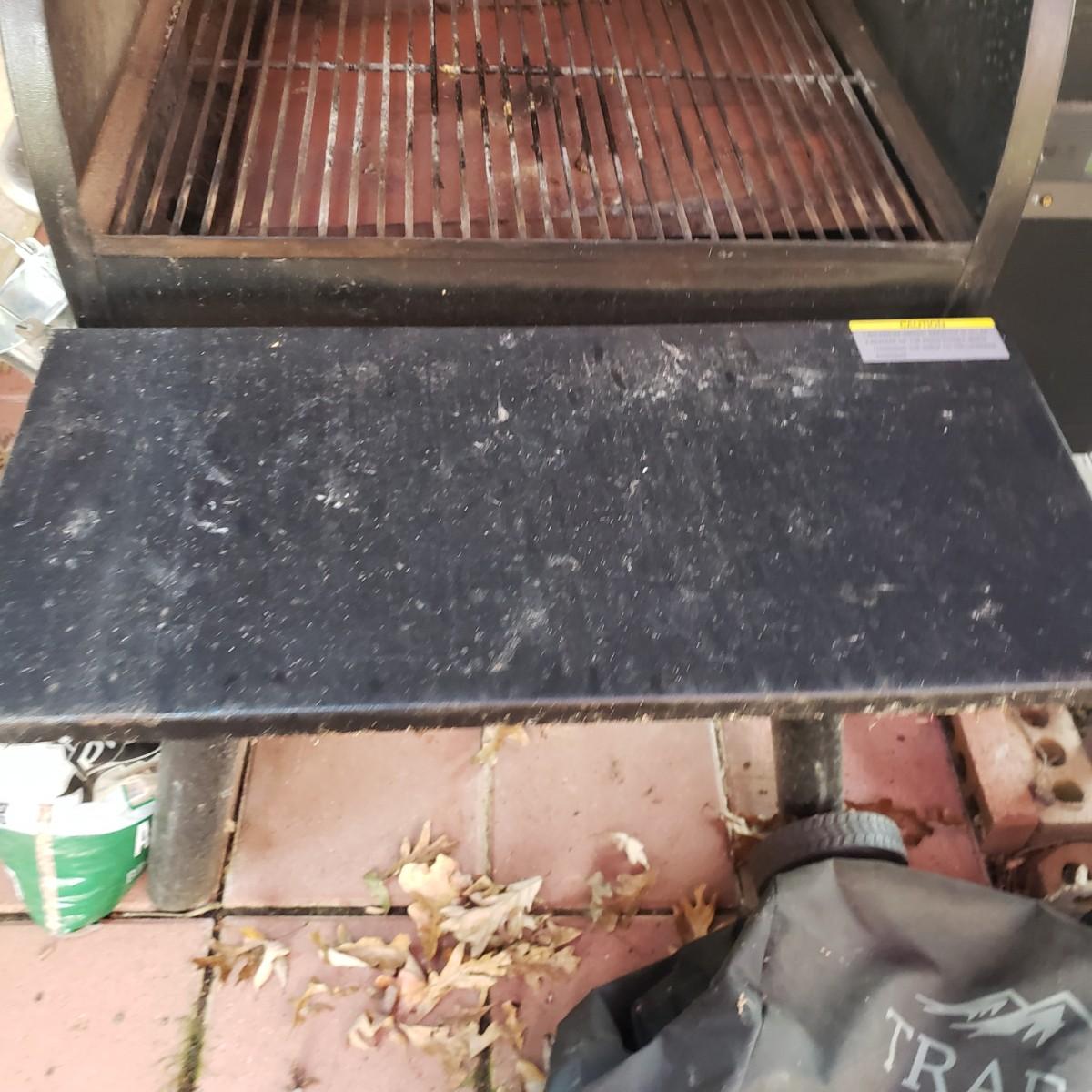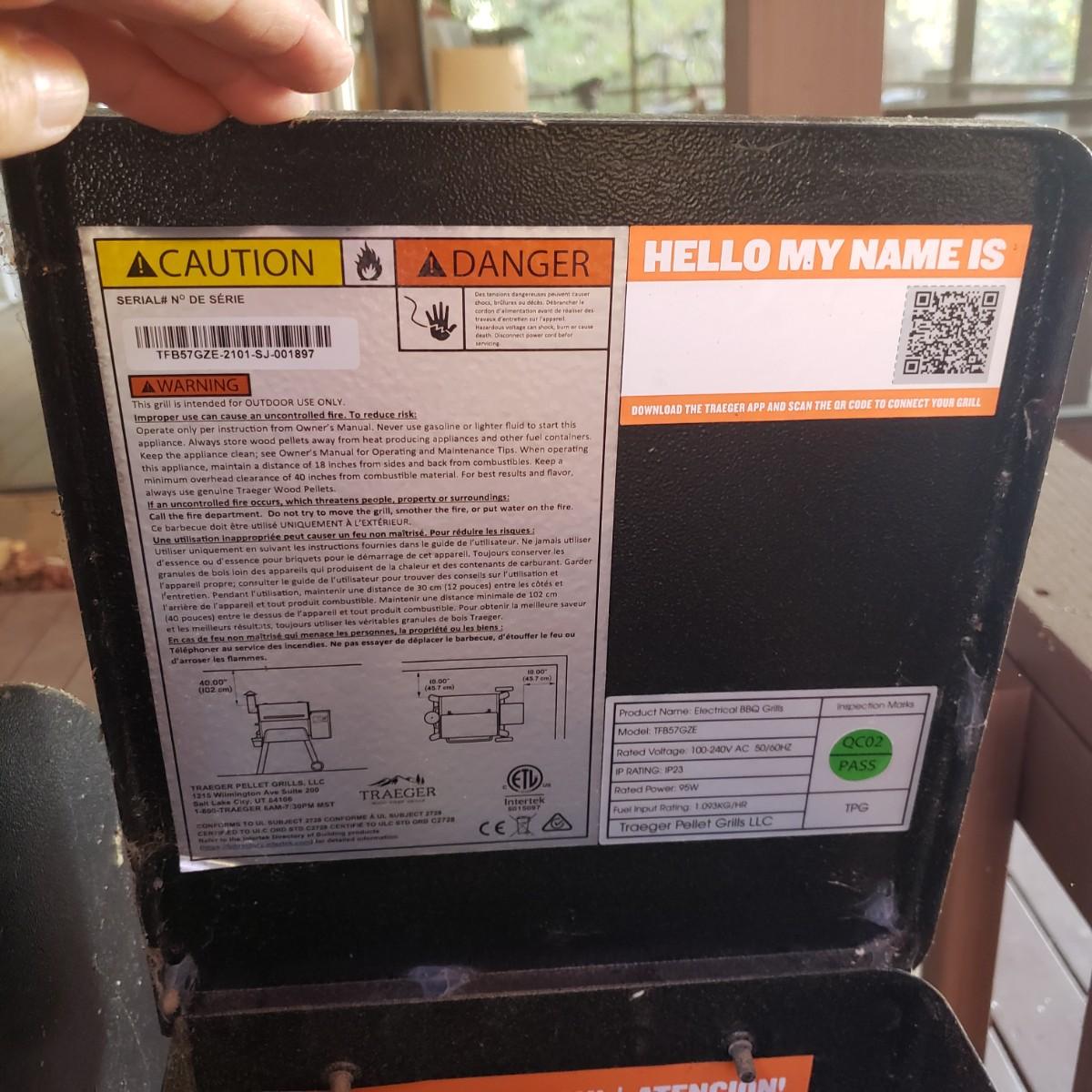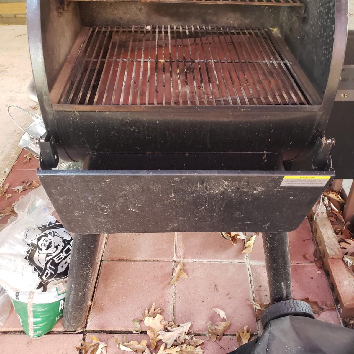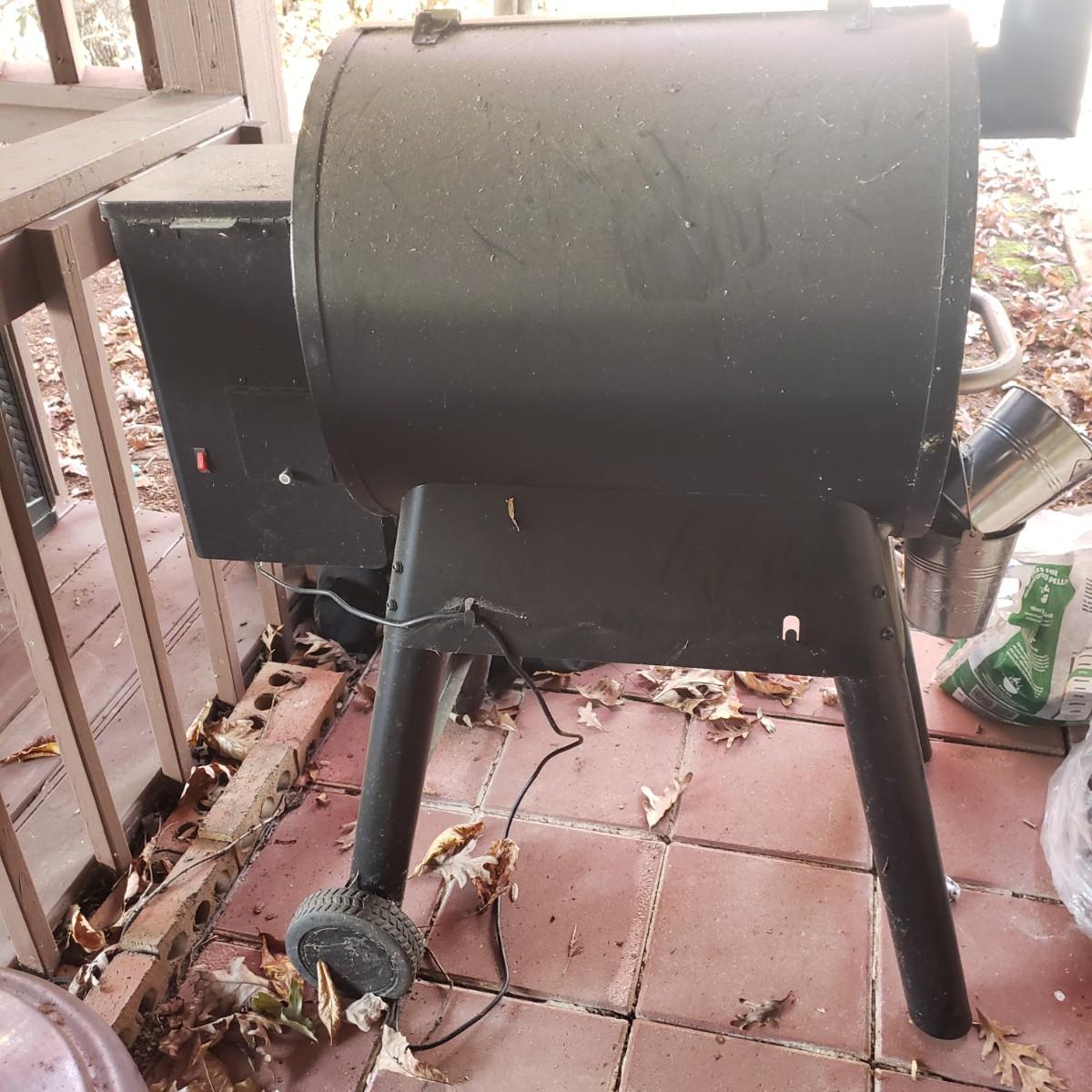 This is a Traeger pellet grill with three opened bags of pellets and cover. The grill powers on when plugged in. Comes with three already opened, with one hardly used bags of wood pellets. The grill measures approximately 40" x 25" x 54"H with the front tray closed down. Has a set of wheels on one end, which is great because this is a sturdy piece! The grill cover has duck tape on the chimney section, see pictures. Comes with a new grease bucket.