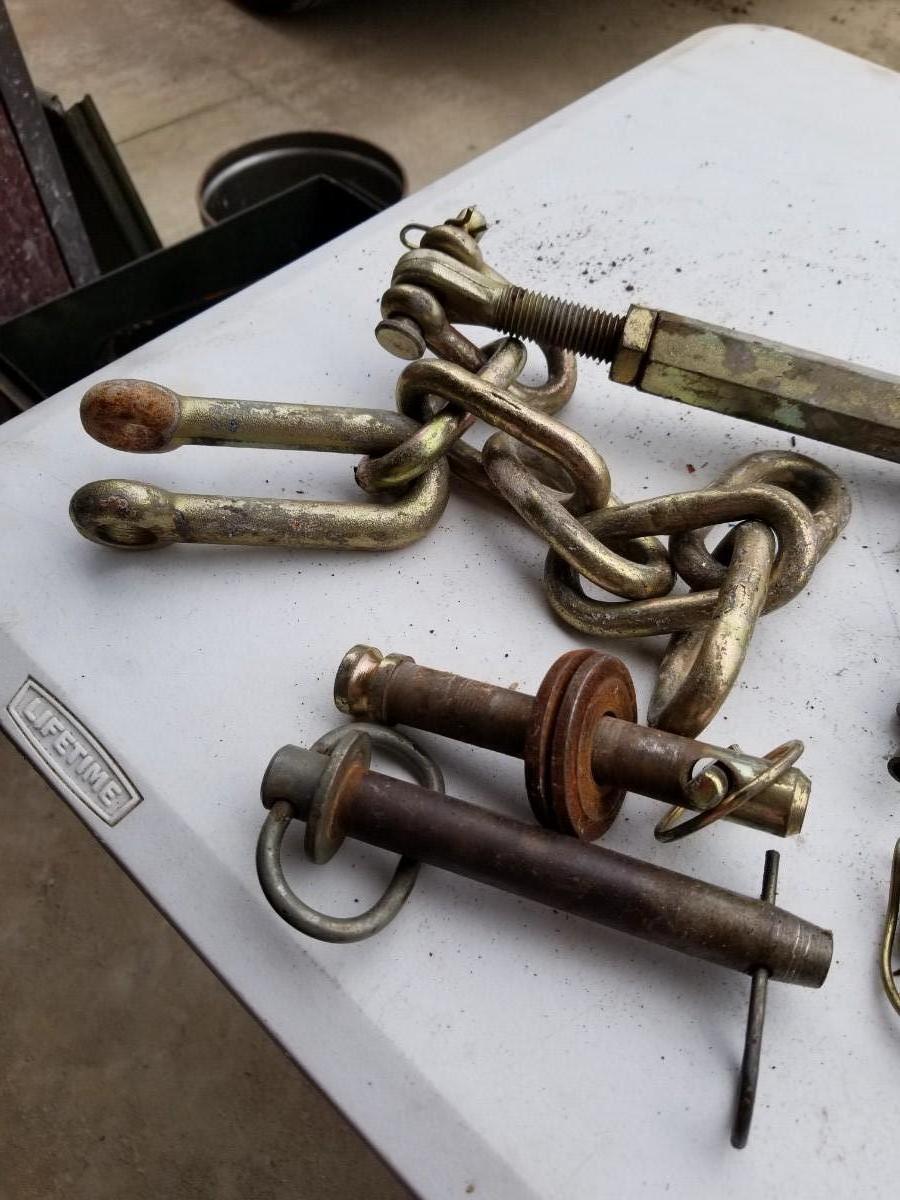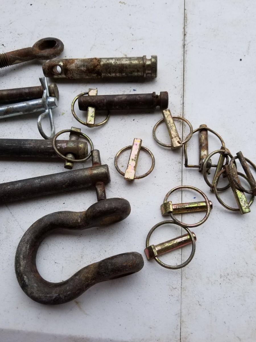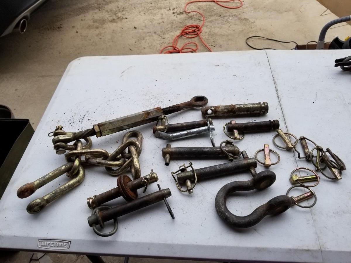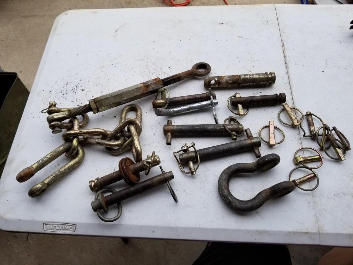 Variety of hitch pins, clevis pins, safety pins, and chain attachments.