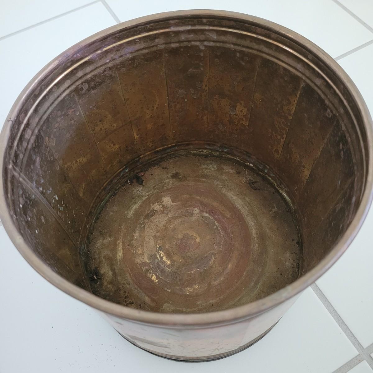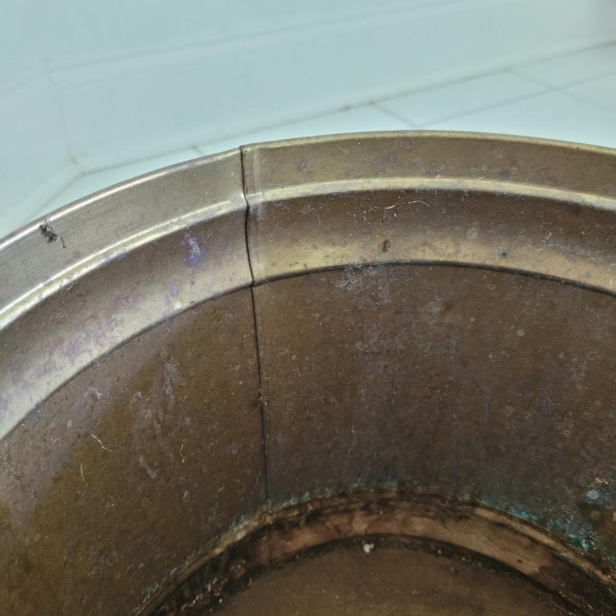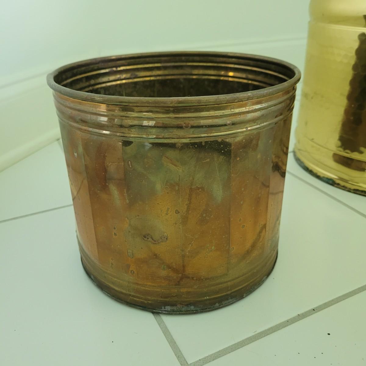 This collection of brass and copper planters includes a well established trailing jade plant. Largest brass planter measures approximately 12”DIA x 11”H. Local pick up only.