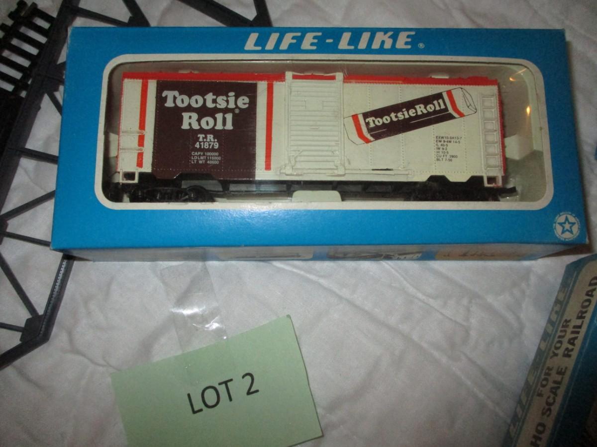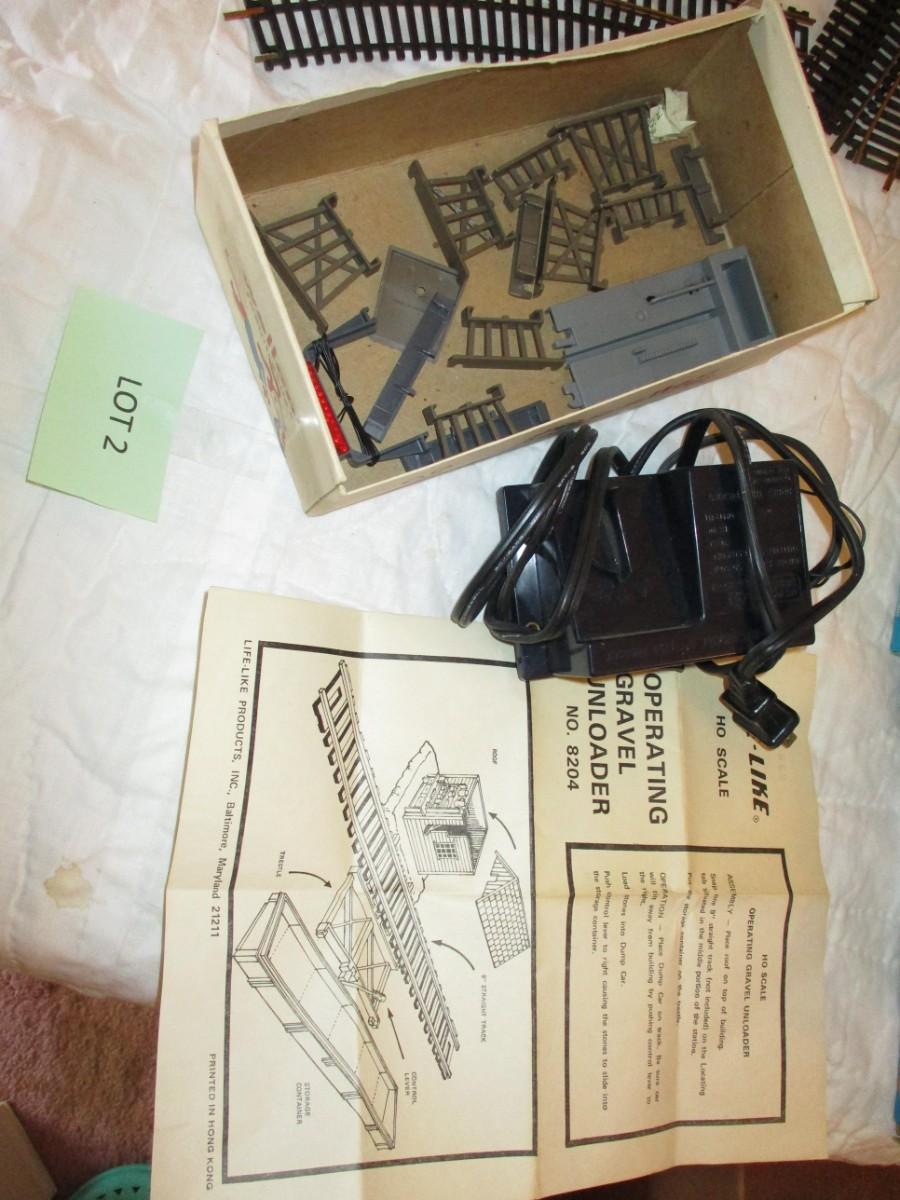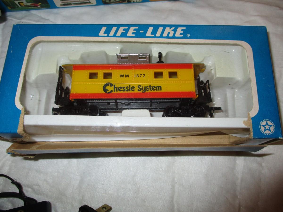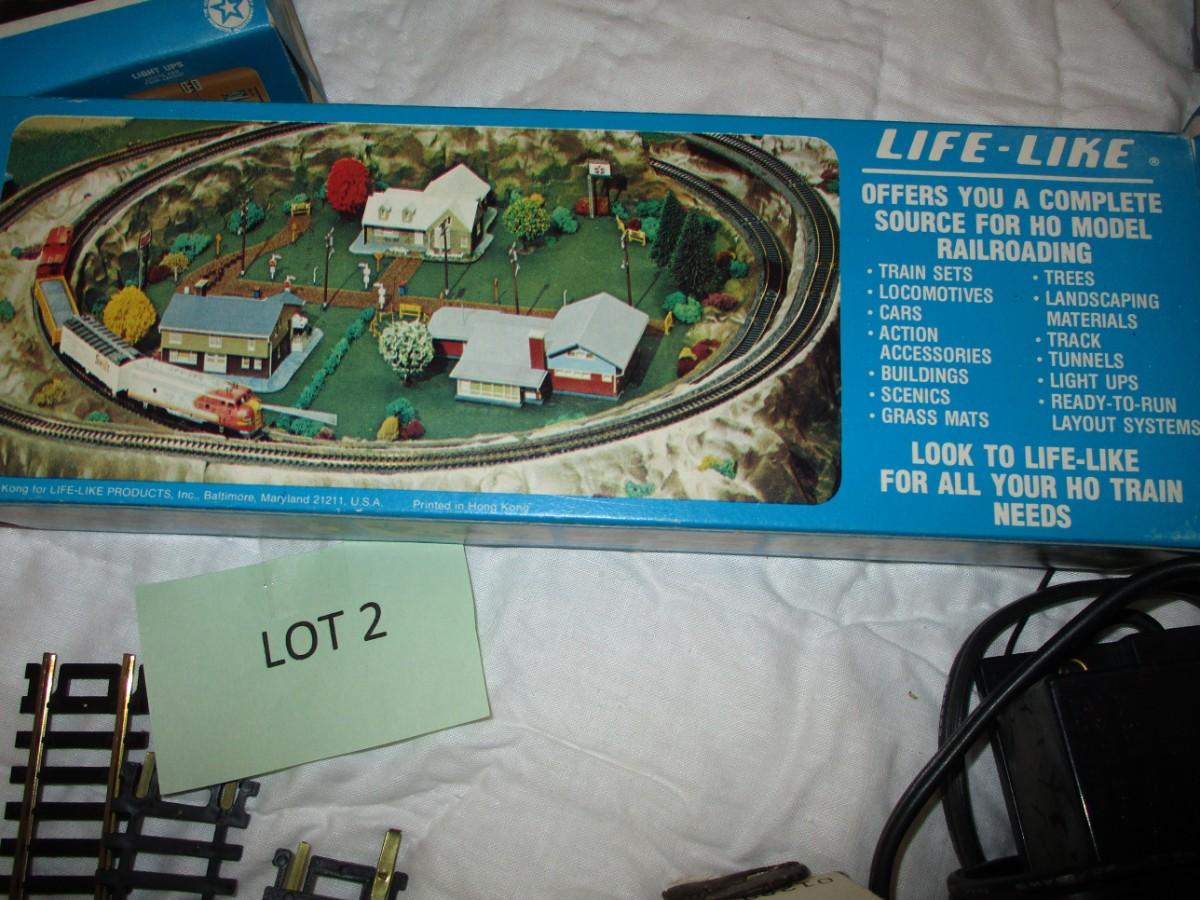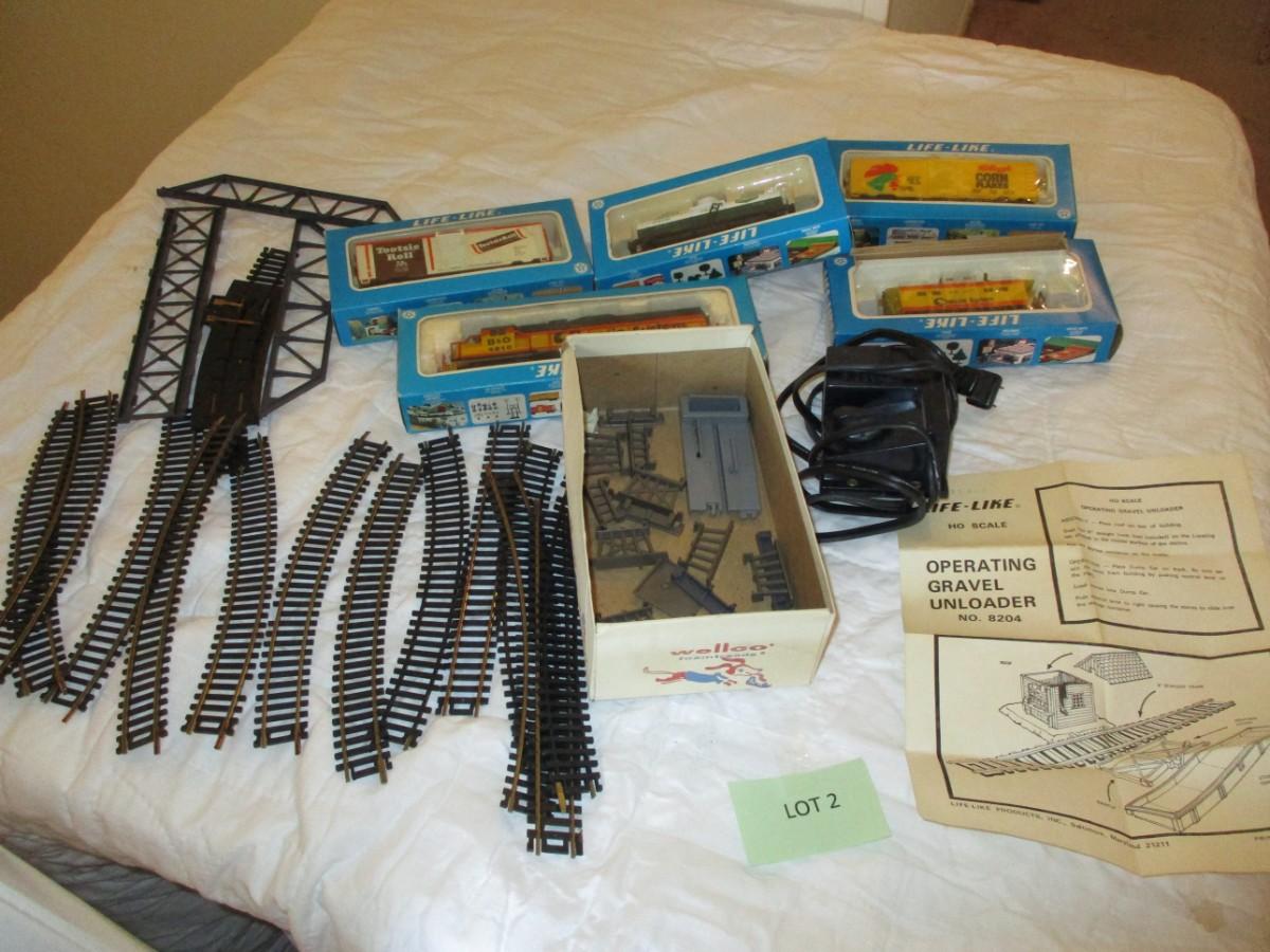 Brand is Life-Like. Includes 1 gravel dump car. 2 box cars. 1 tank car. 1 locomotive. Transformer. Plastic tracks. Can't guarantee it works.