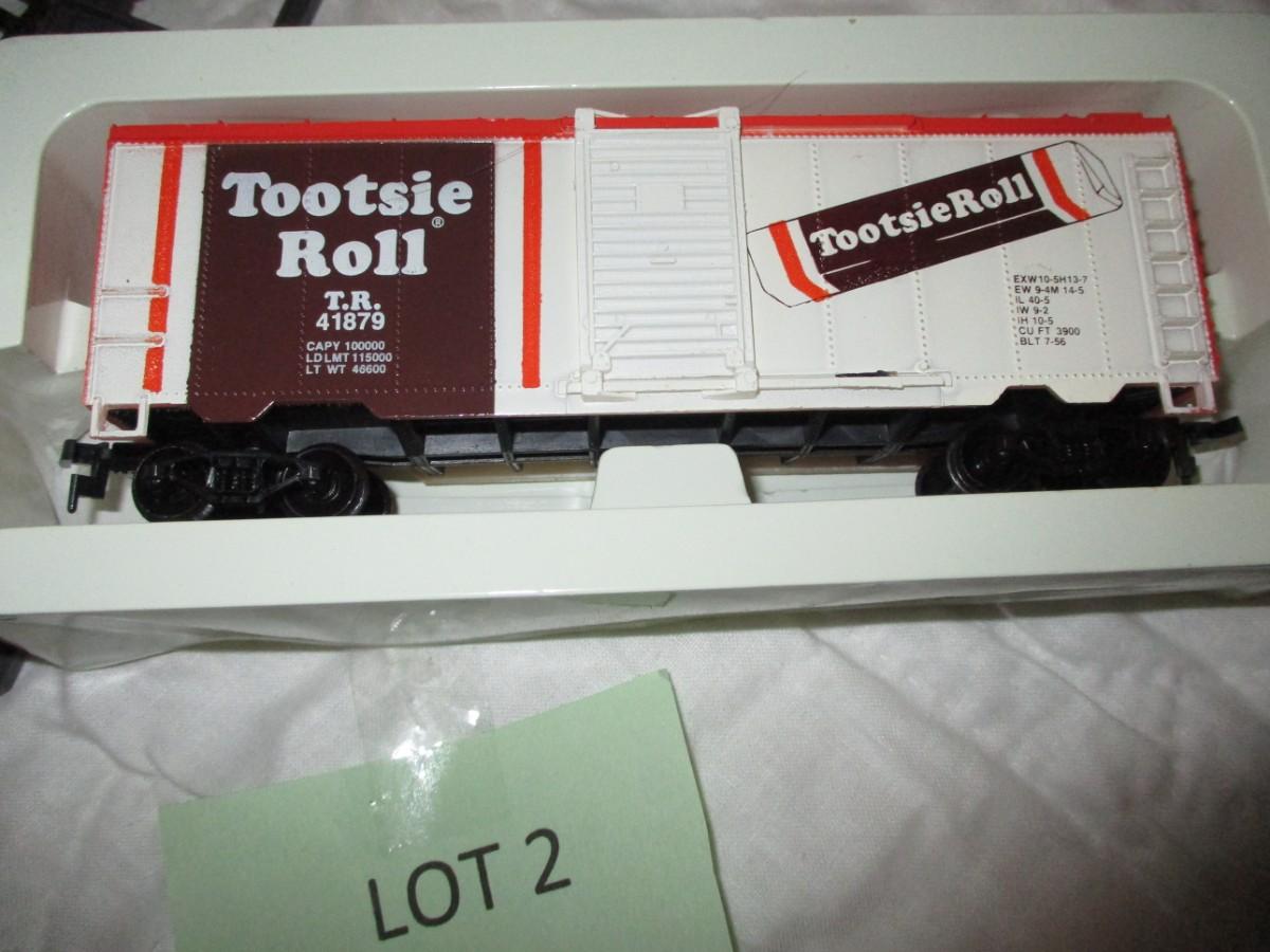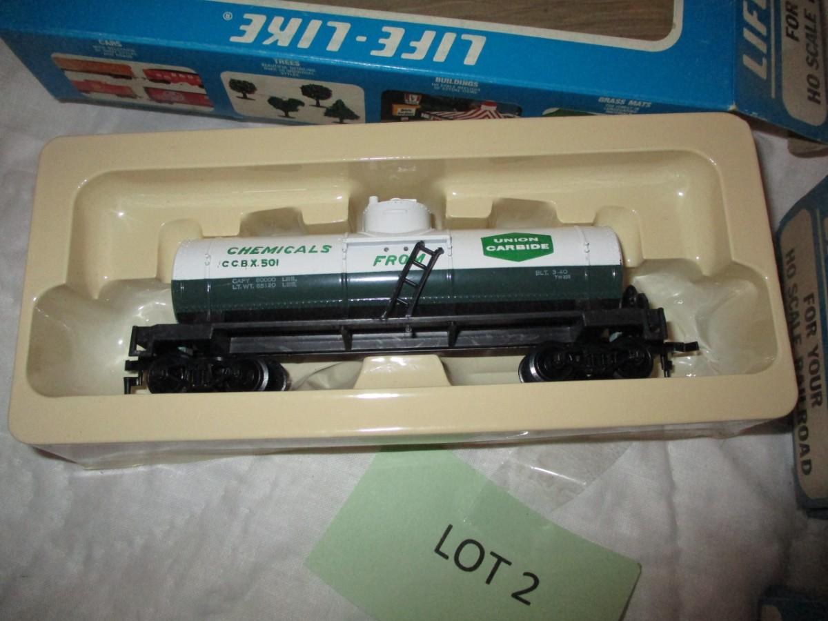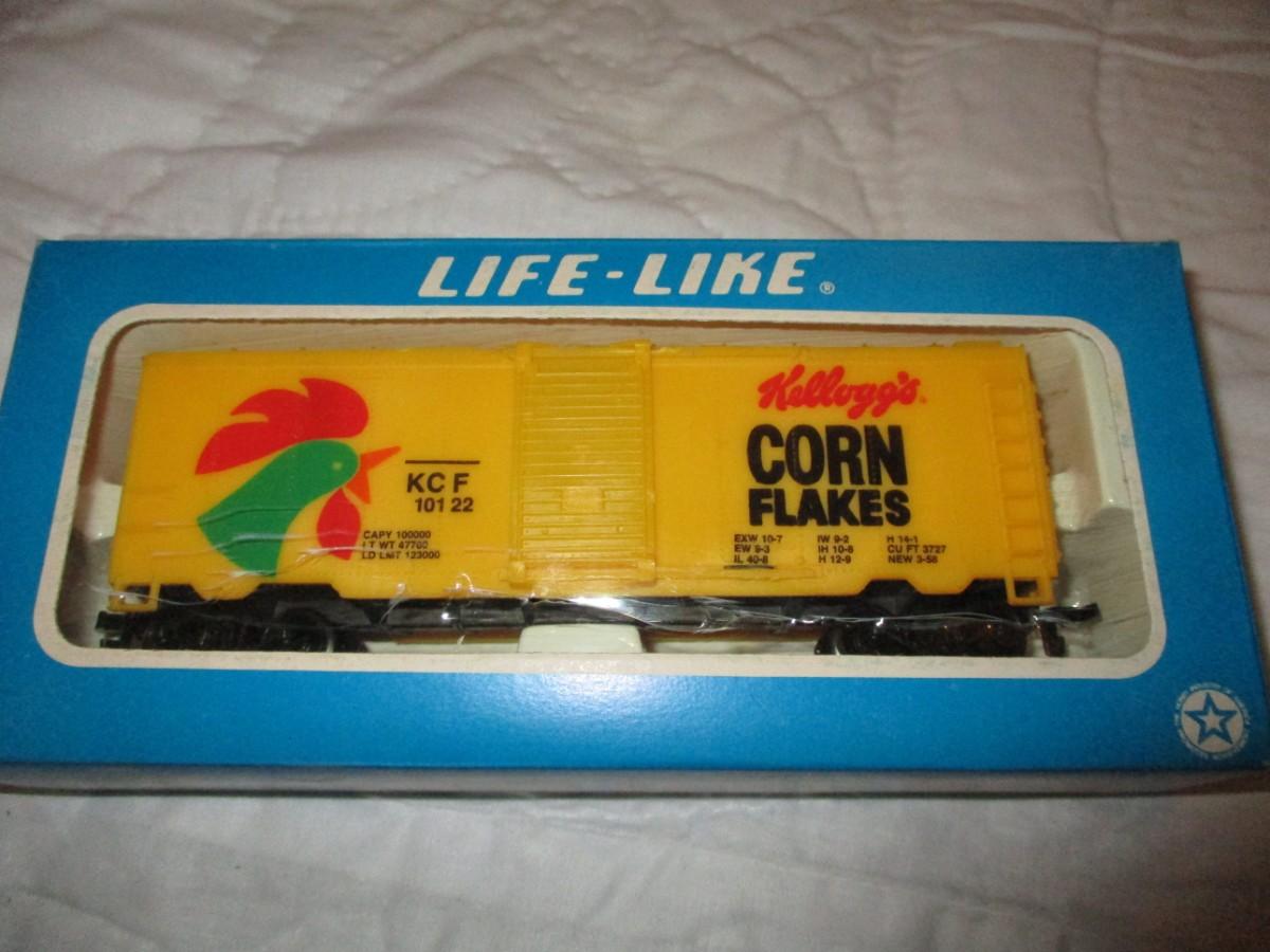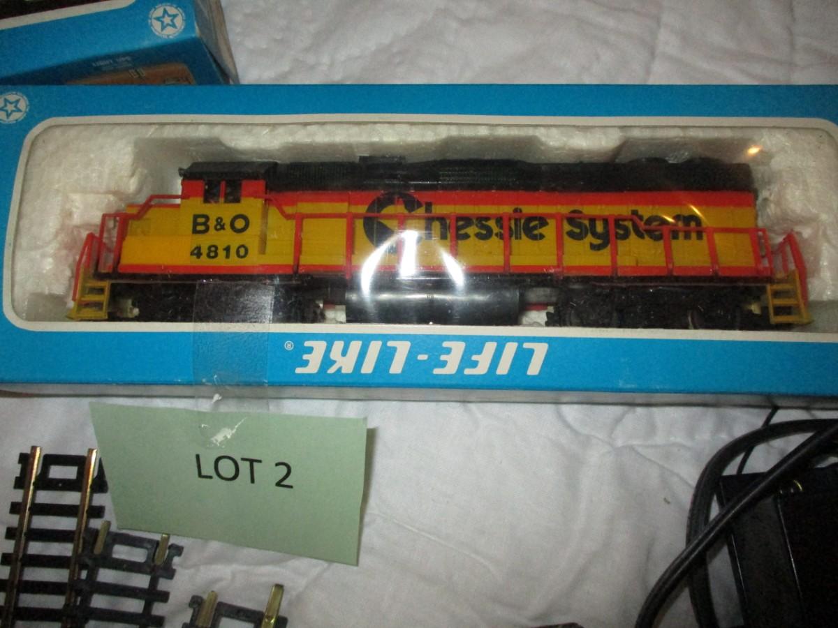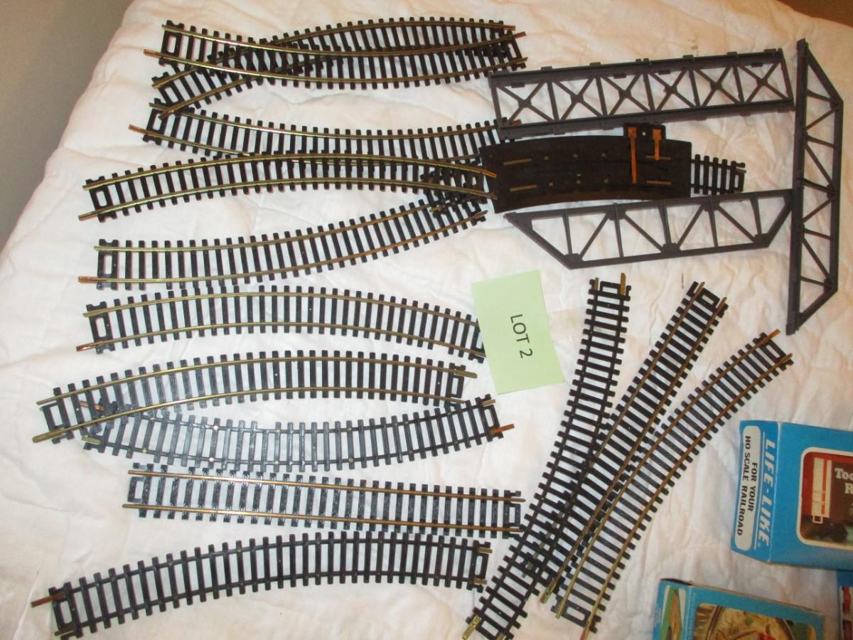 Brand is Life-Like. Includes 1 gravel dump car. 2 box cars. 1 tank car. 1 locomotive. Transformer. Plastic tracks. Can't guarantee it works.