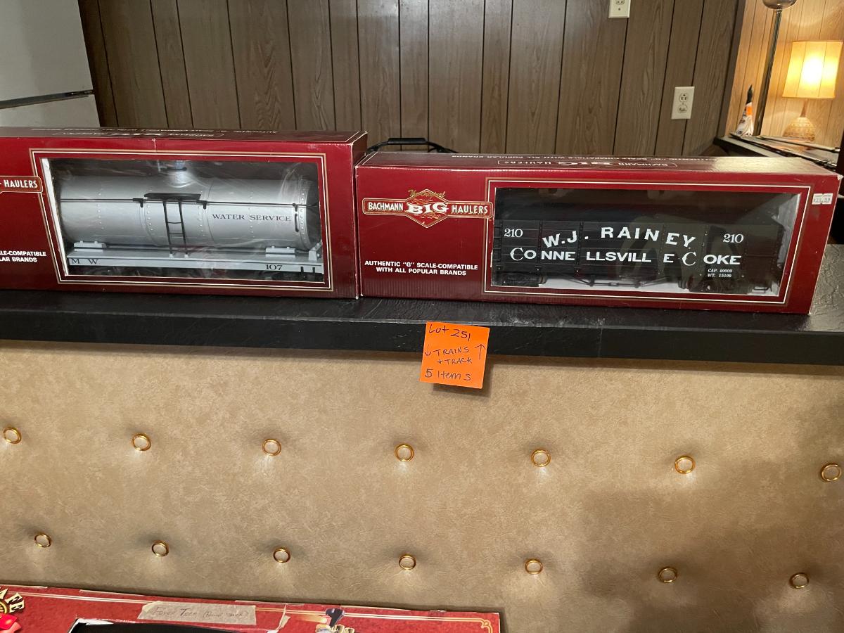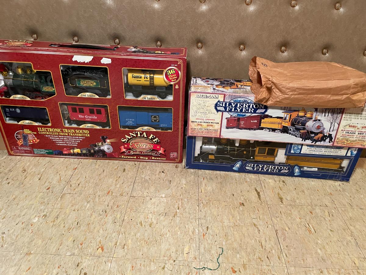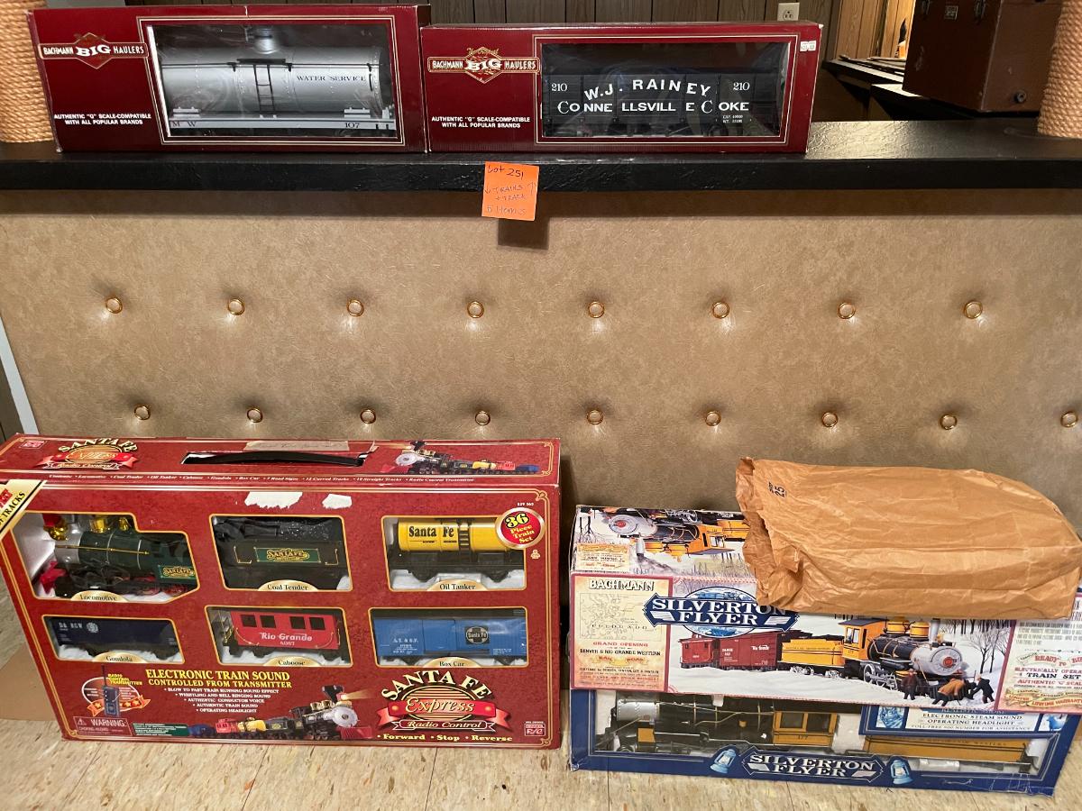 Train Set Lot of 4 includes Santa Fe Express Radio Control Set, Bachmann Big Haulers Silverton Flyer G Scale Set, 2 Bachmann G Scale Cars, & Tracks