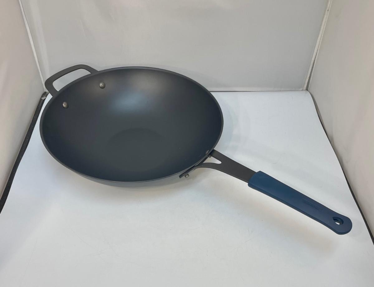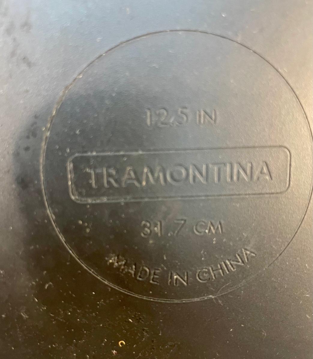 Tramontina 12.5” Long-Handled Wok Fry Pan. Made from carbon steel. Has a silicone rubber heat-resistant handle sleeve. Pre-seasoned, ready to use. Made in China.