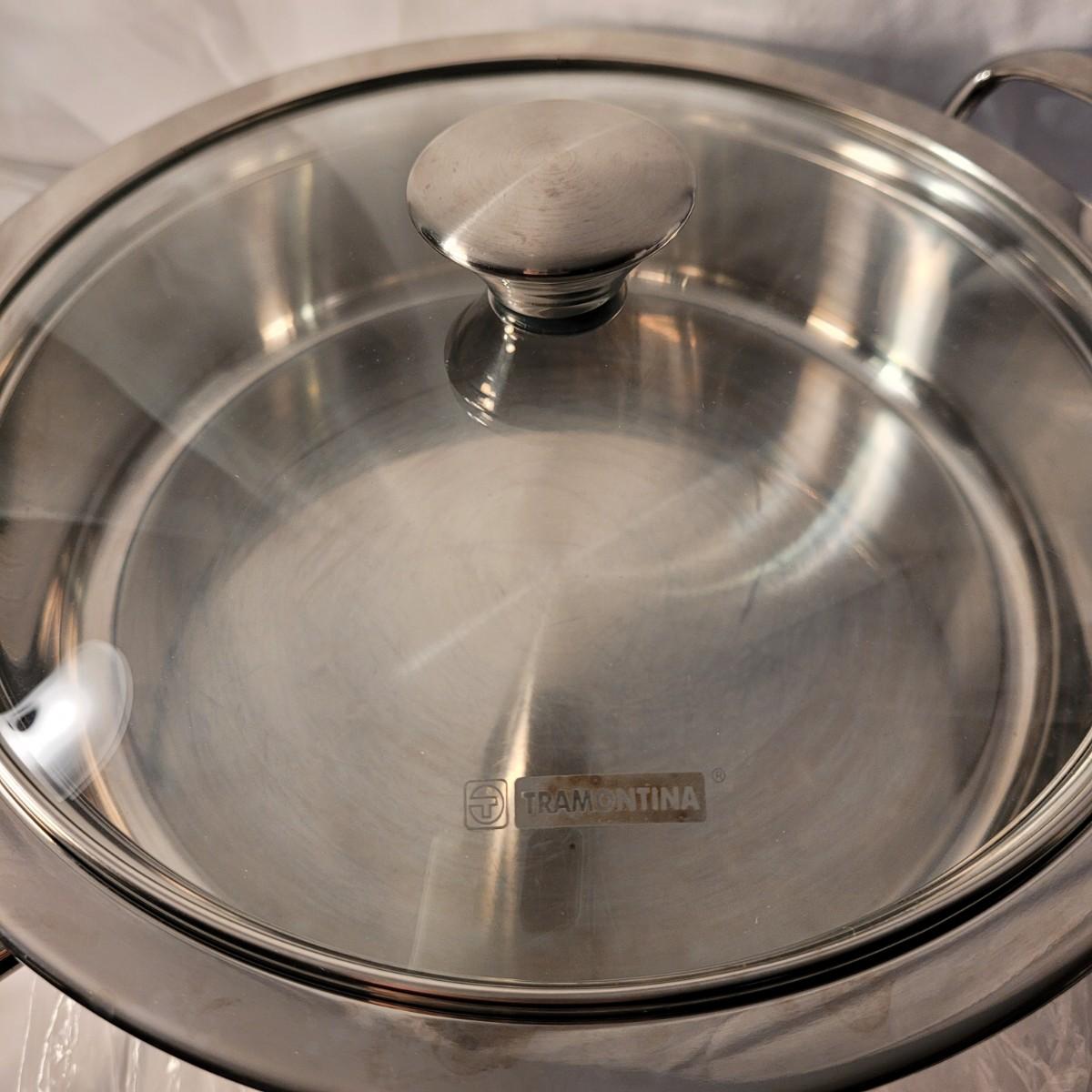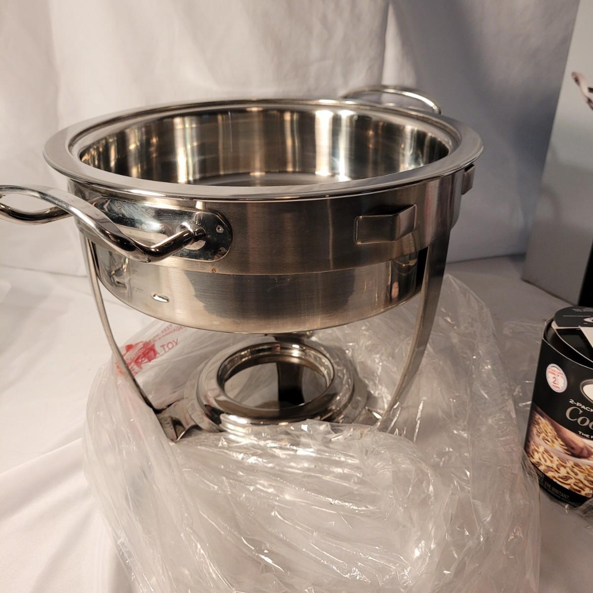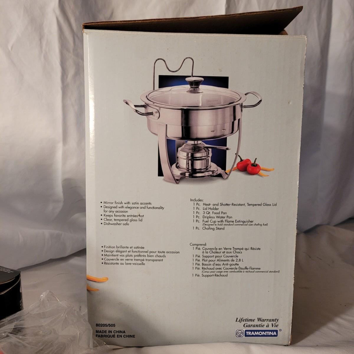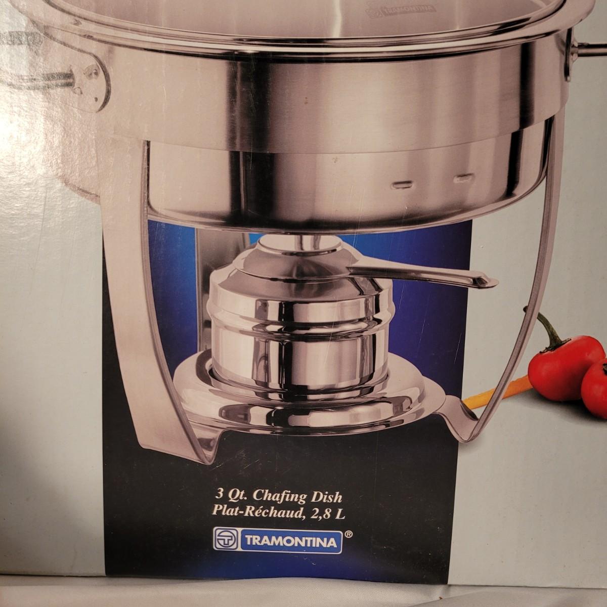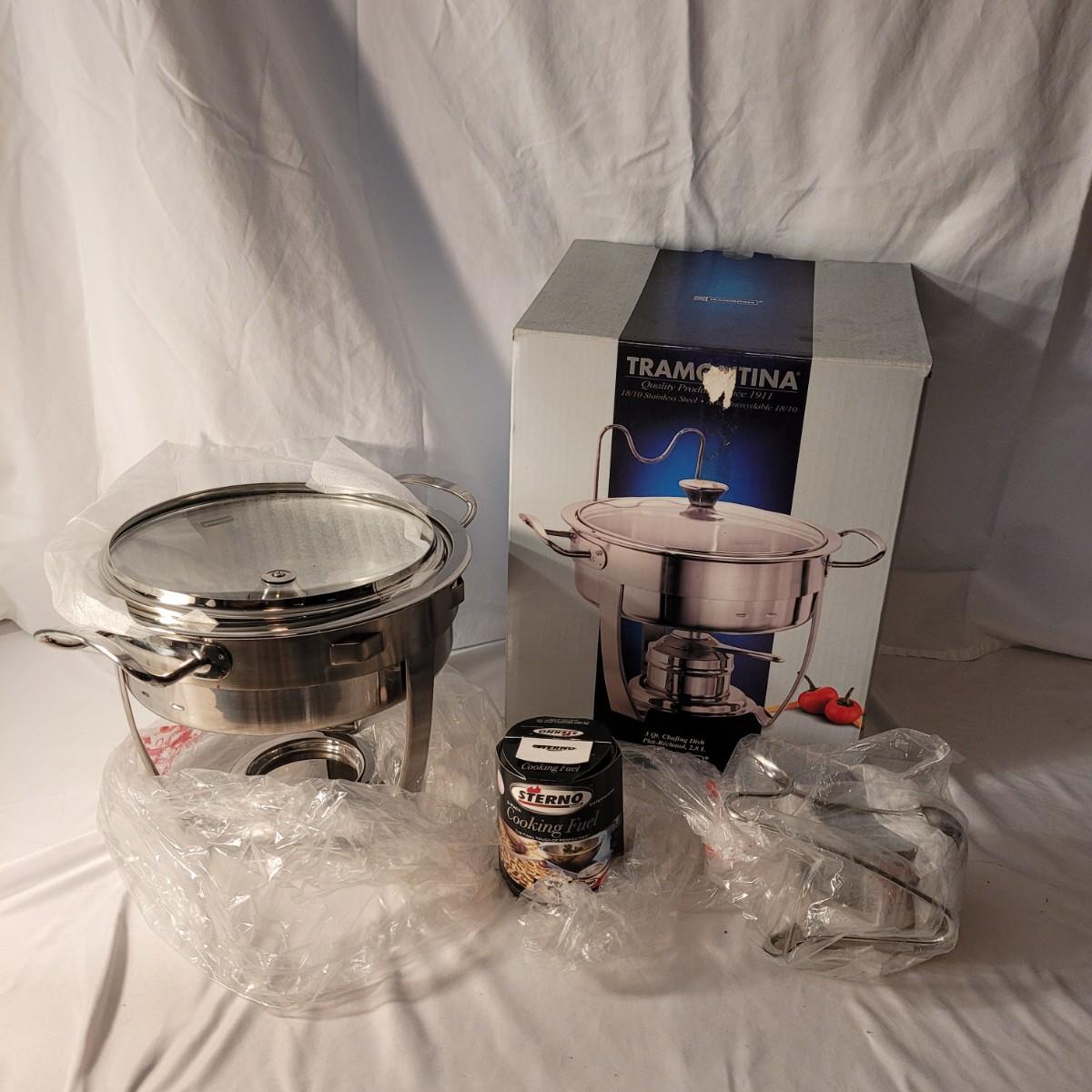 This new in box Tramontina chafing dish comes with a water pan, stand and fuel cup. Shipping available.