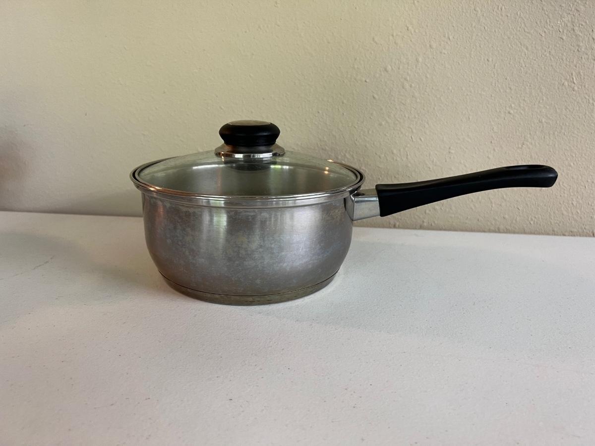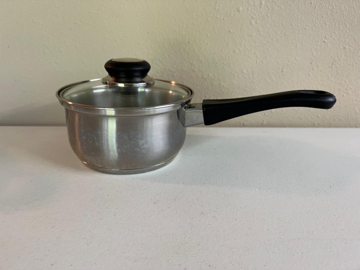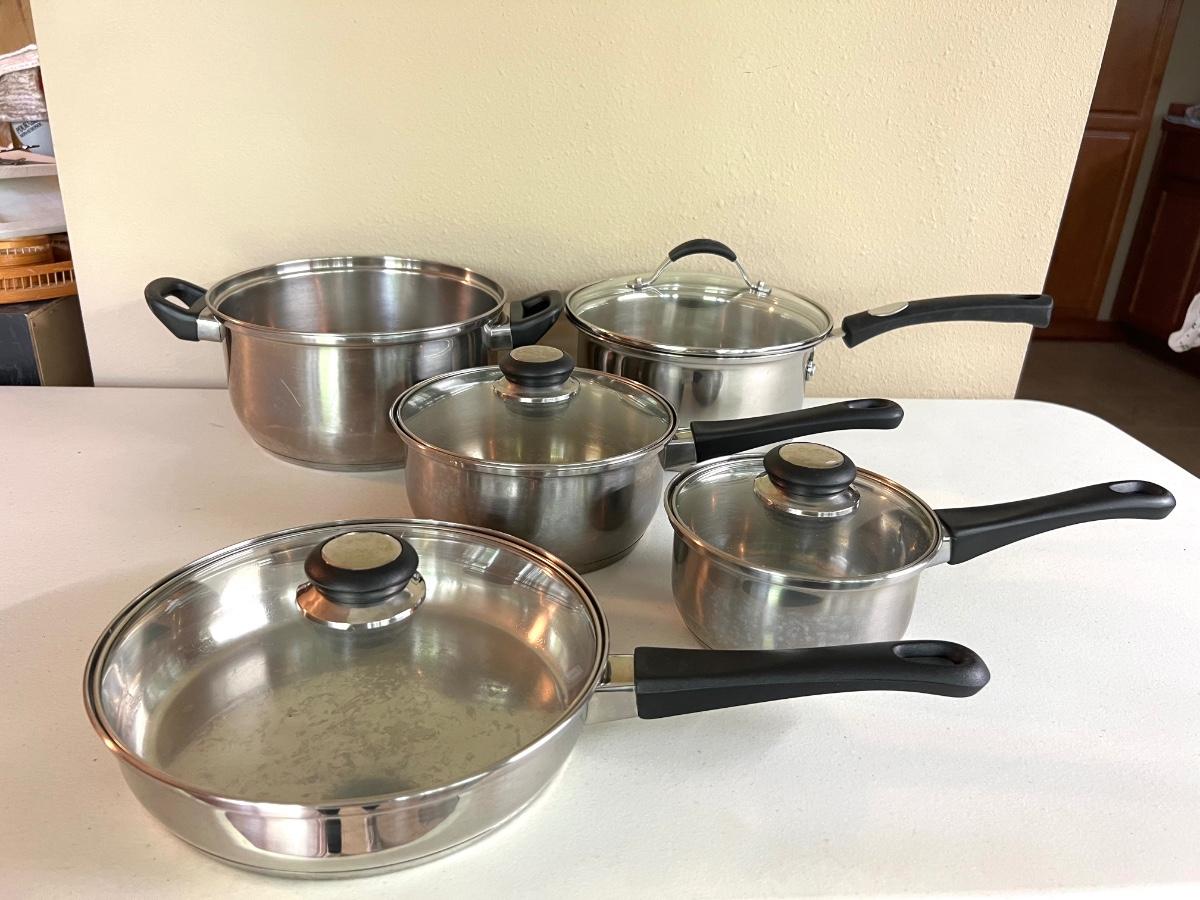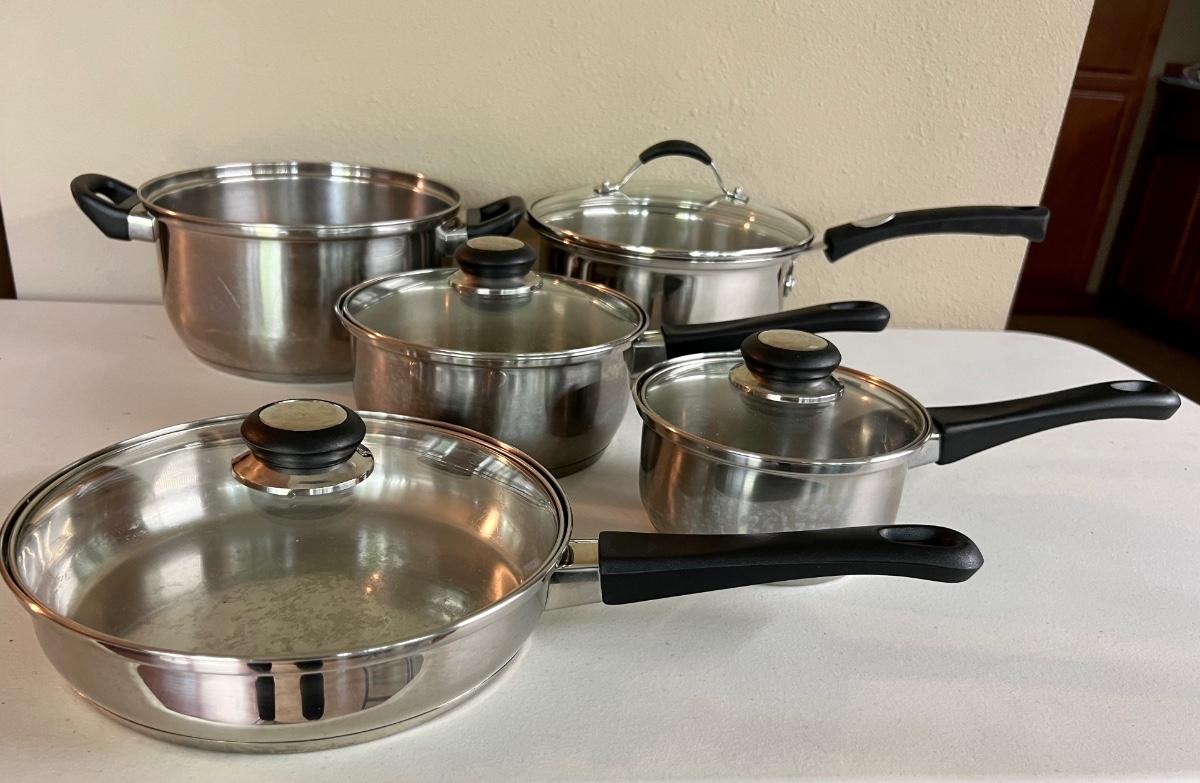 STAINLESS STEEL SET INCLUDES 3 Quart, 2 Quart, 1 Quart, 8 1/2 inch and a boiling pot 4 Quart. All have lids except the boiling pot.