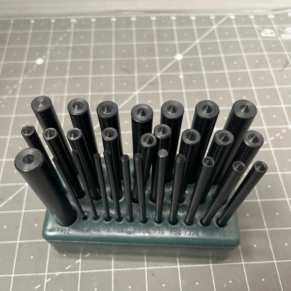 28-Piece durable heat-treated steel punches with indexed stand for accuracy.