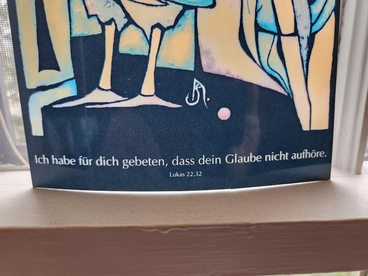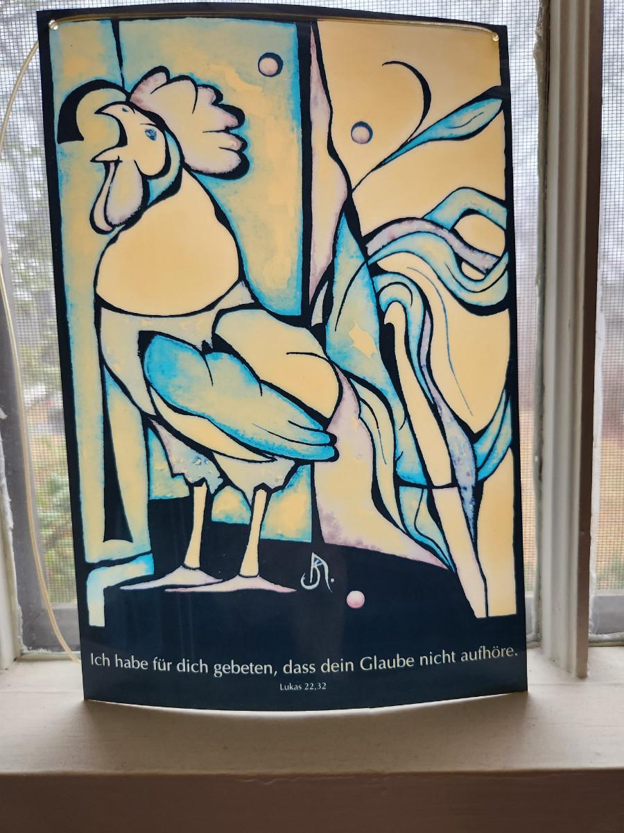 This auction lot is for a Translucent Devotional Picture. This vintage, Germanic item shows a crowing Rooster with the phrase: "But I have prayed for you, that your faith should not cease." Luke 22,32. Measures about 8X10-inches. Interesting vintage religious poster.