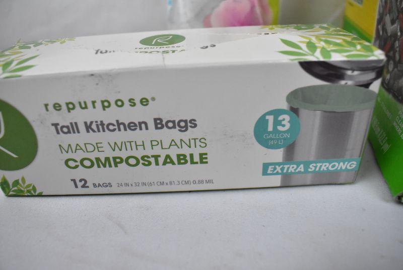 Trash Bags Lot: Glad Tall Kitchen Trash Bags, 13 Gallon, 45 Bags (Clear Recycling) & Repurpose 100% Compostable Plant Based Tall 13 Gallon Kitchen Waste Bags, 10 ct. & Color Scents Medium Trash Bag - 8 Gallon, 50 Bags, Twist Tie - Linen Fresh