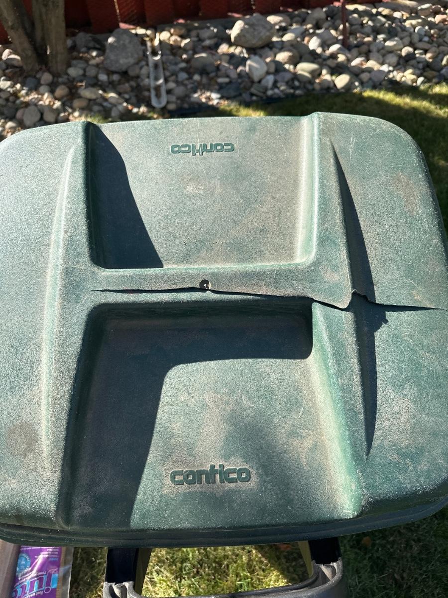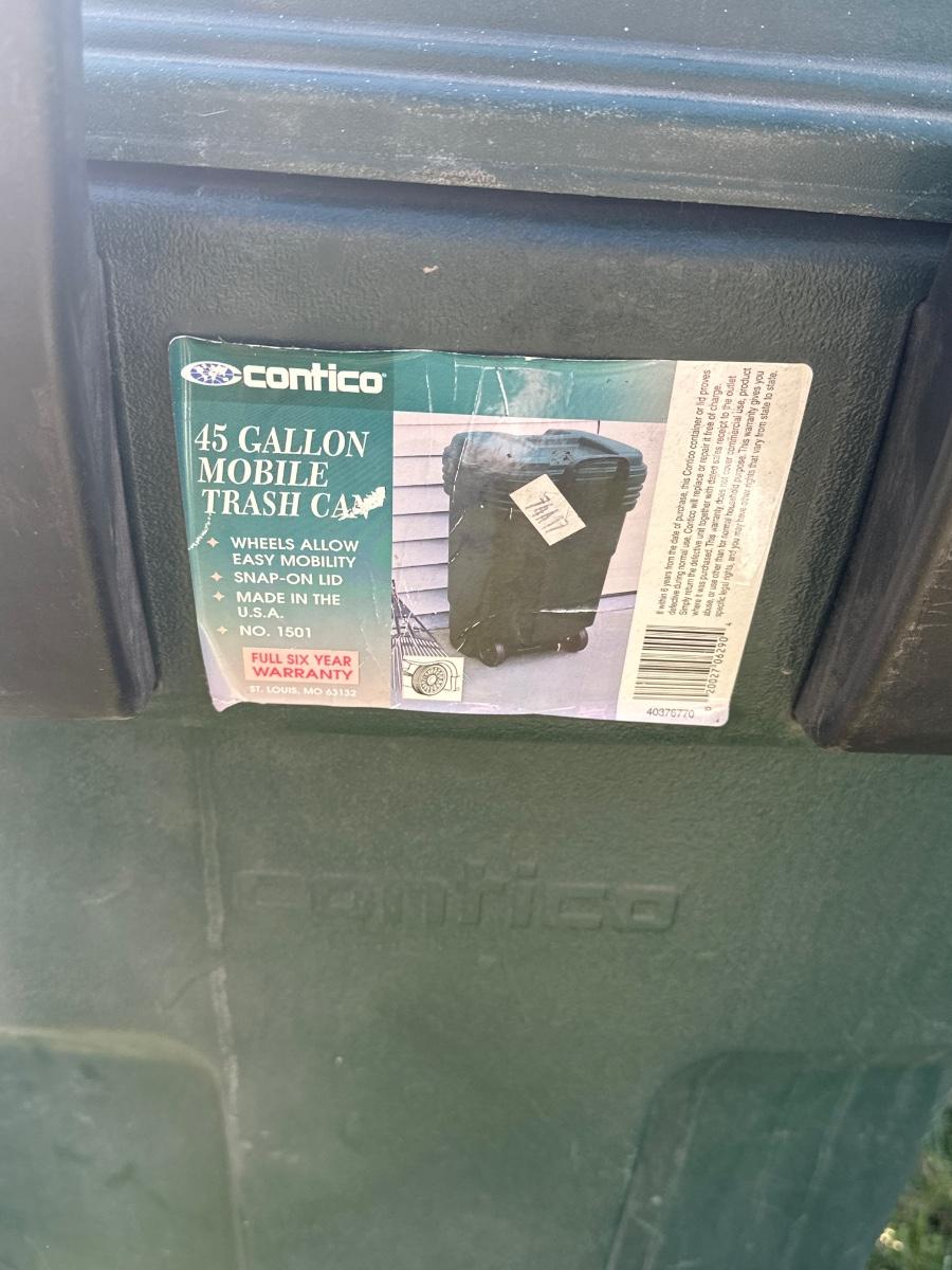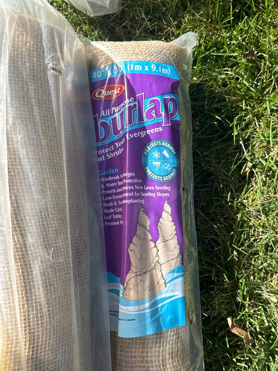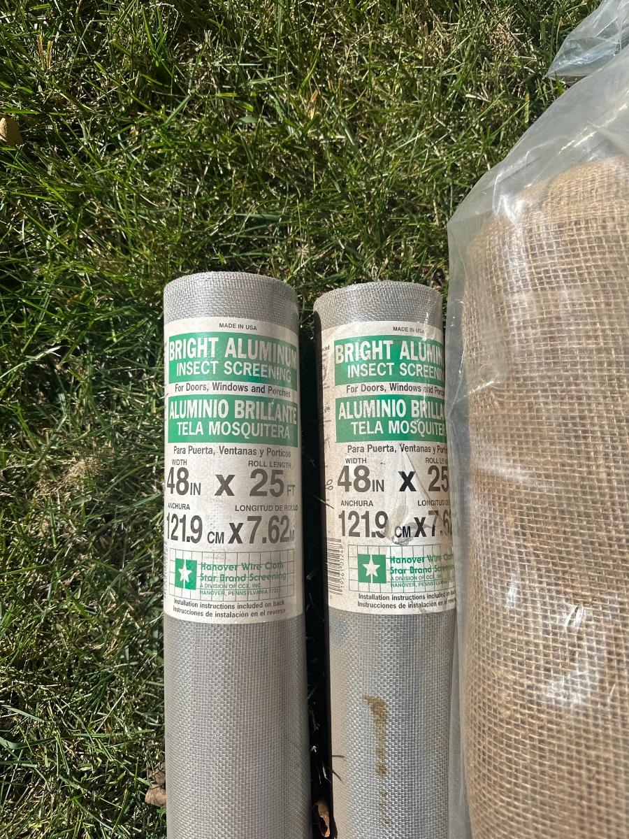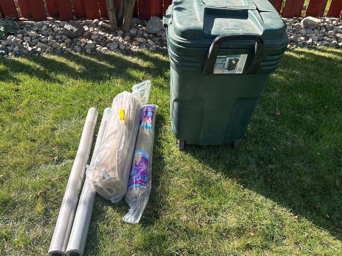 Bug netting and burlap rolls, trash can has crack in lid