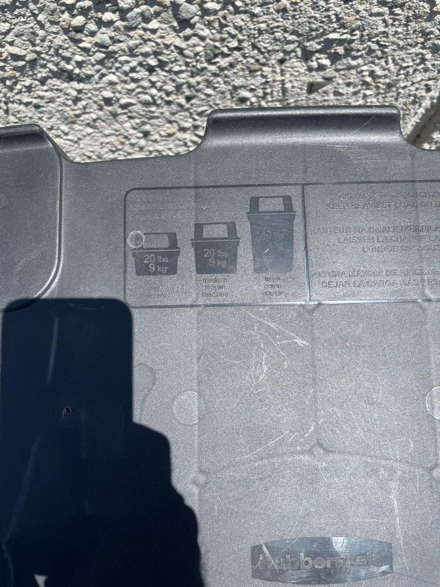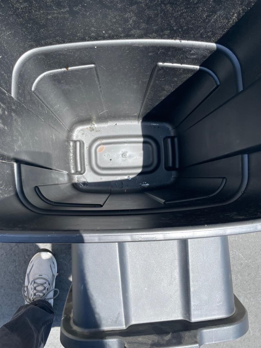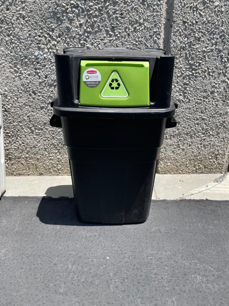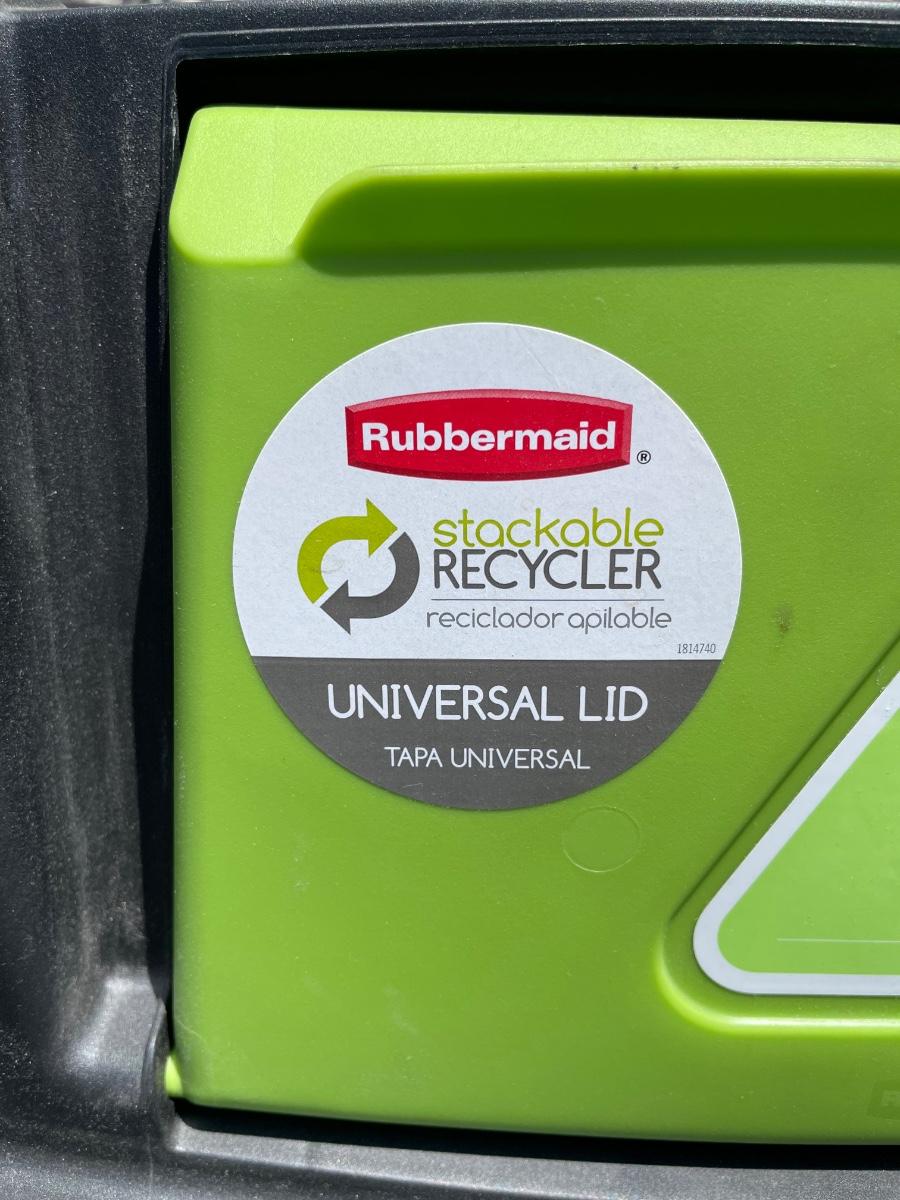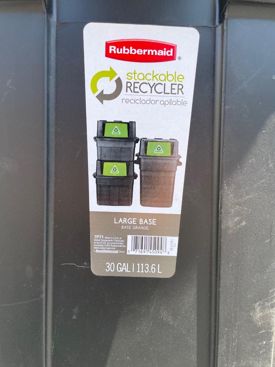 Rubbermaid Large Base stackable recycler trash can. Holds 30 Gallons. Model 7P71, with universal lid.