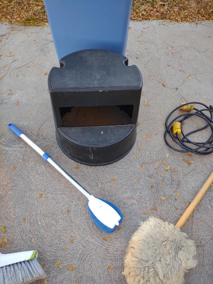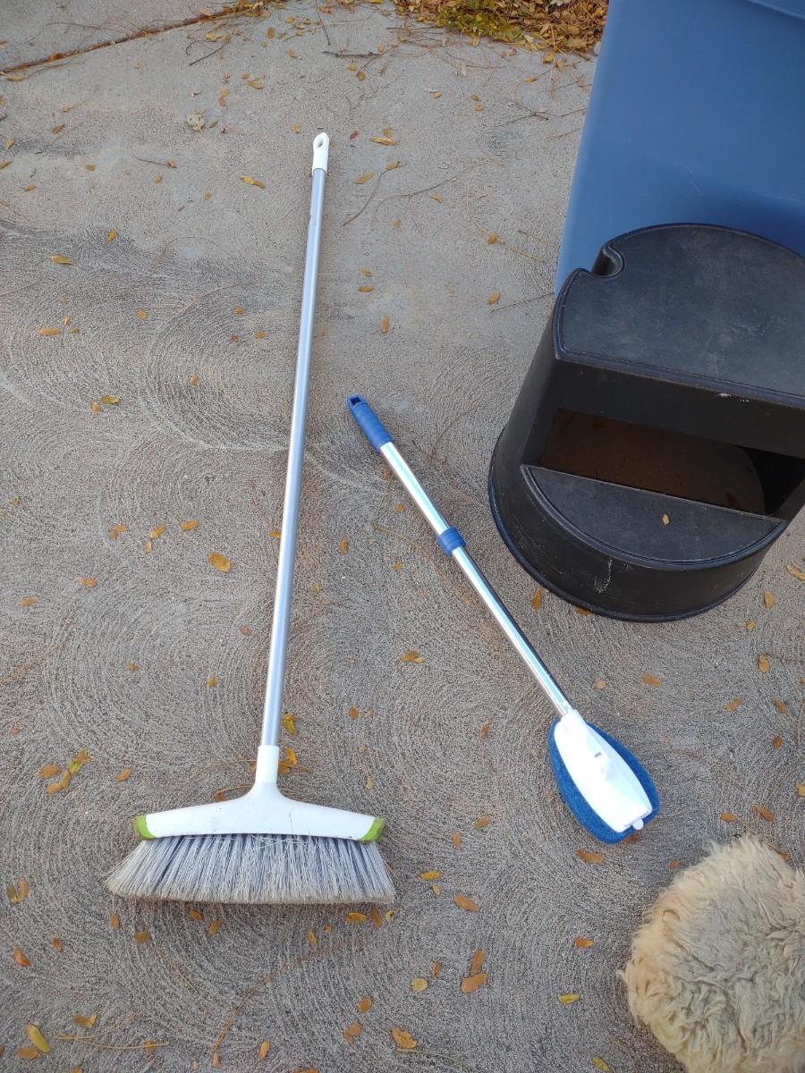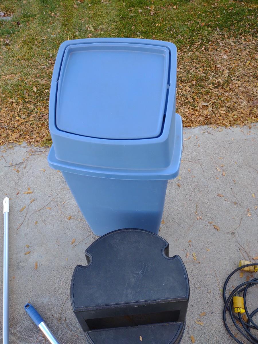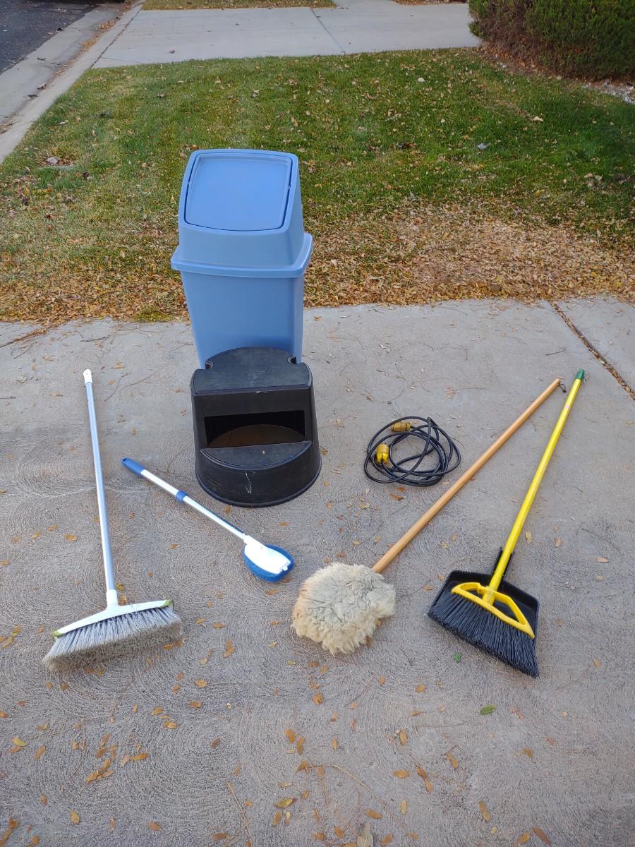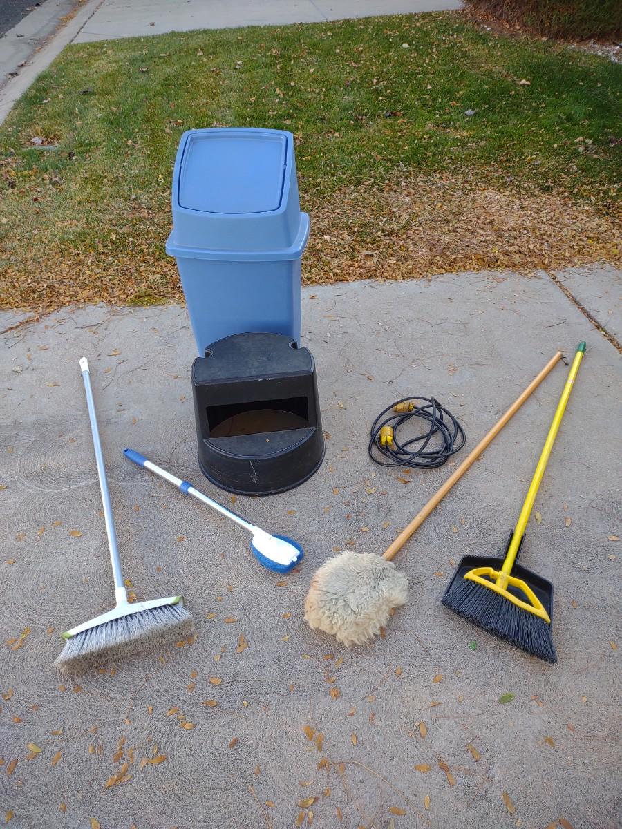 TRASH CAN, STEP STOOL, BROOMS AND MORE