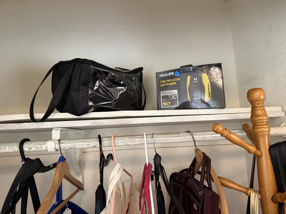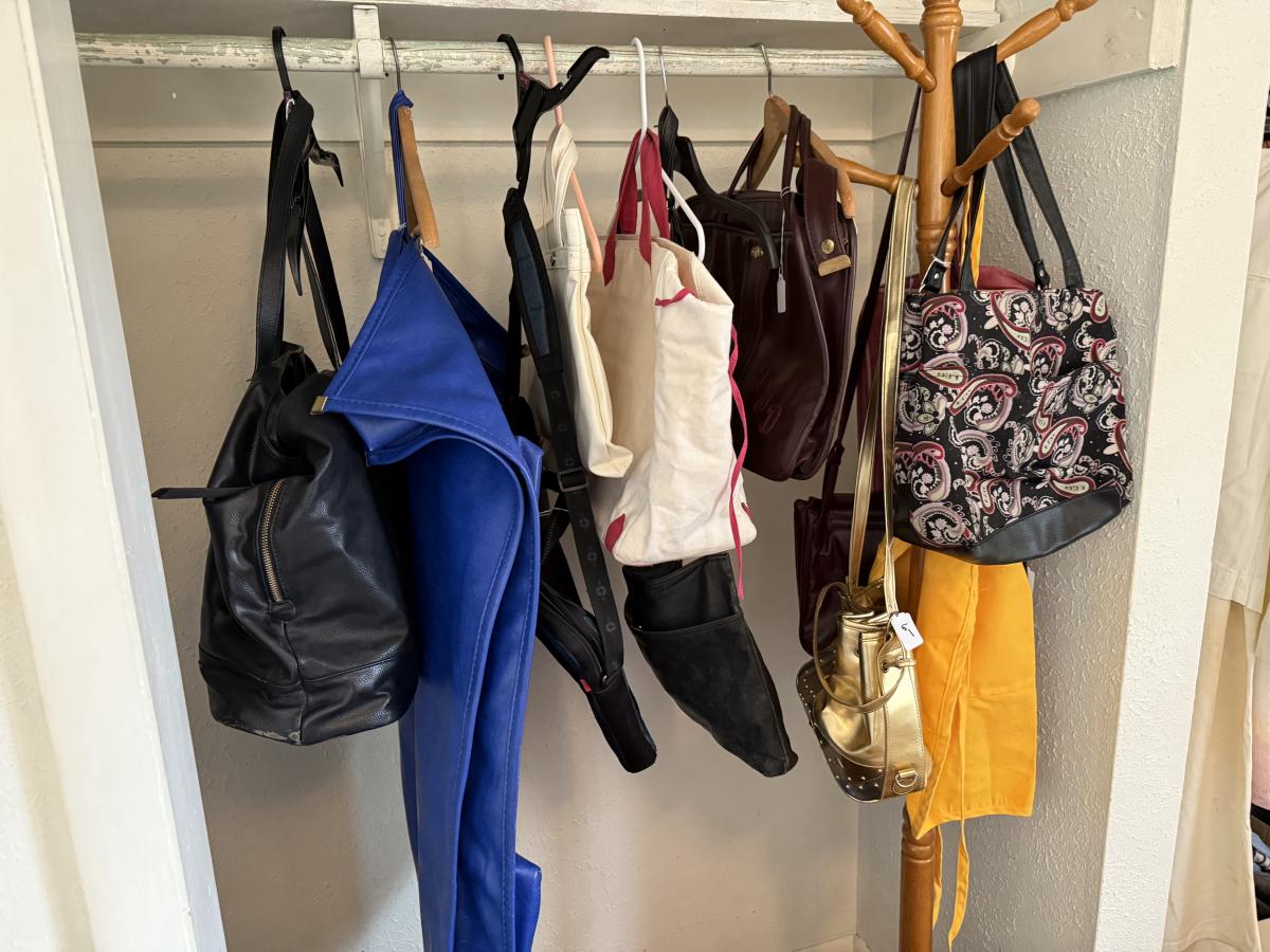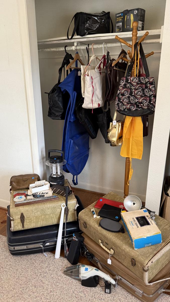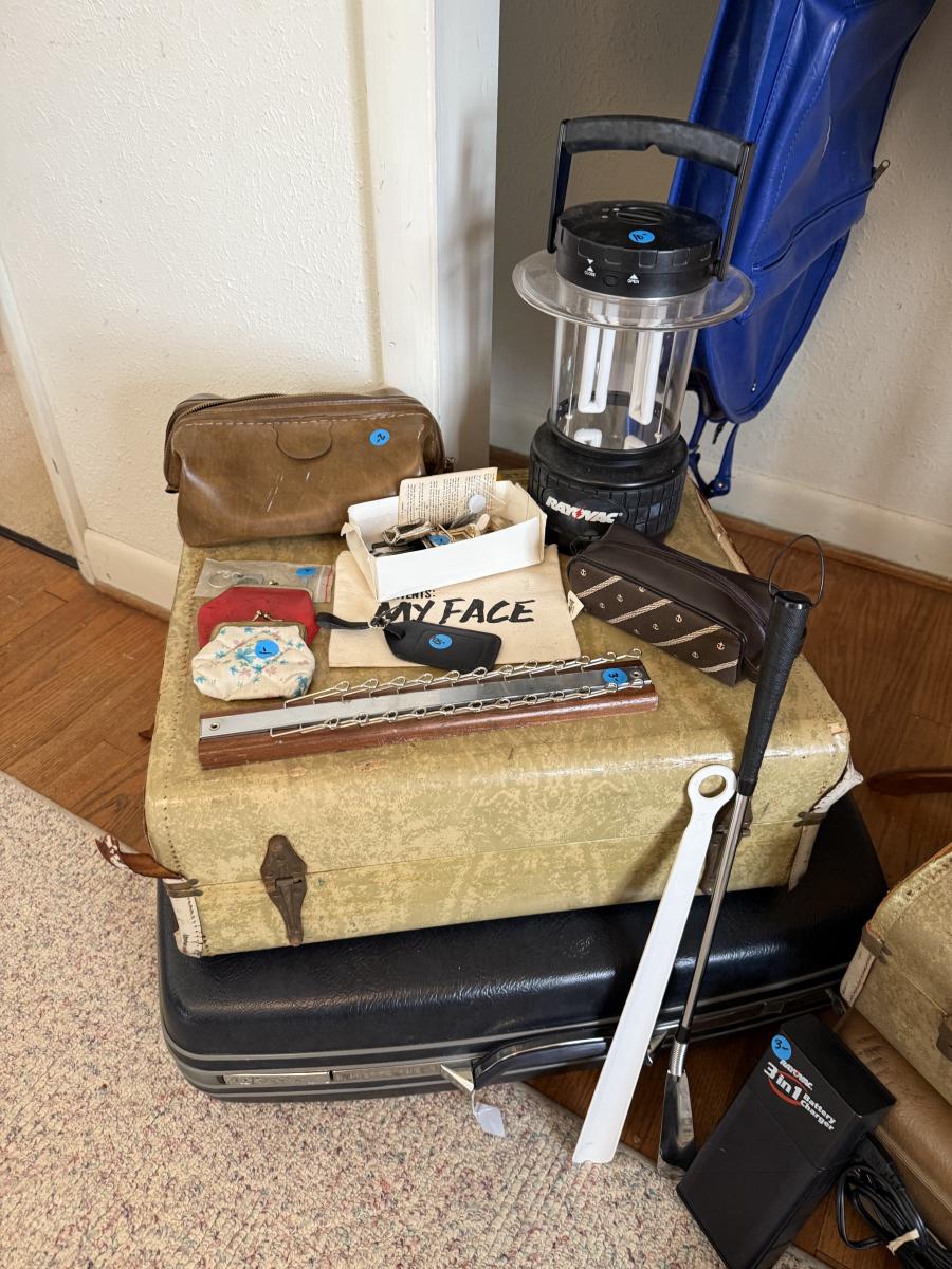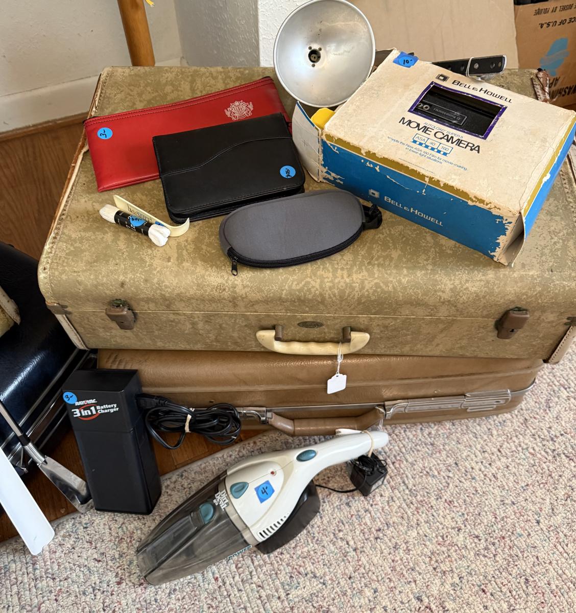 Vintage suitcases, tote bags, Ruritain apron, purses, light, tire pump, movie camera, hand vac, tie rack, etc