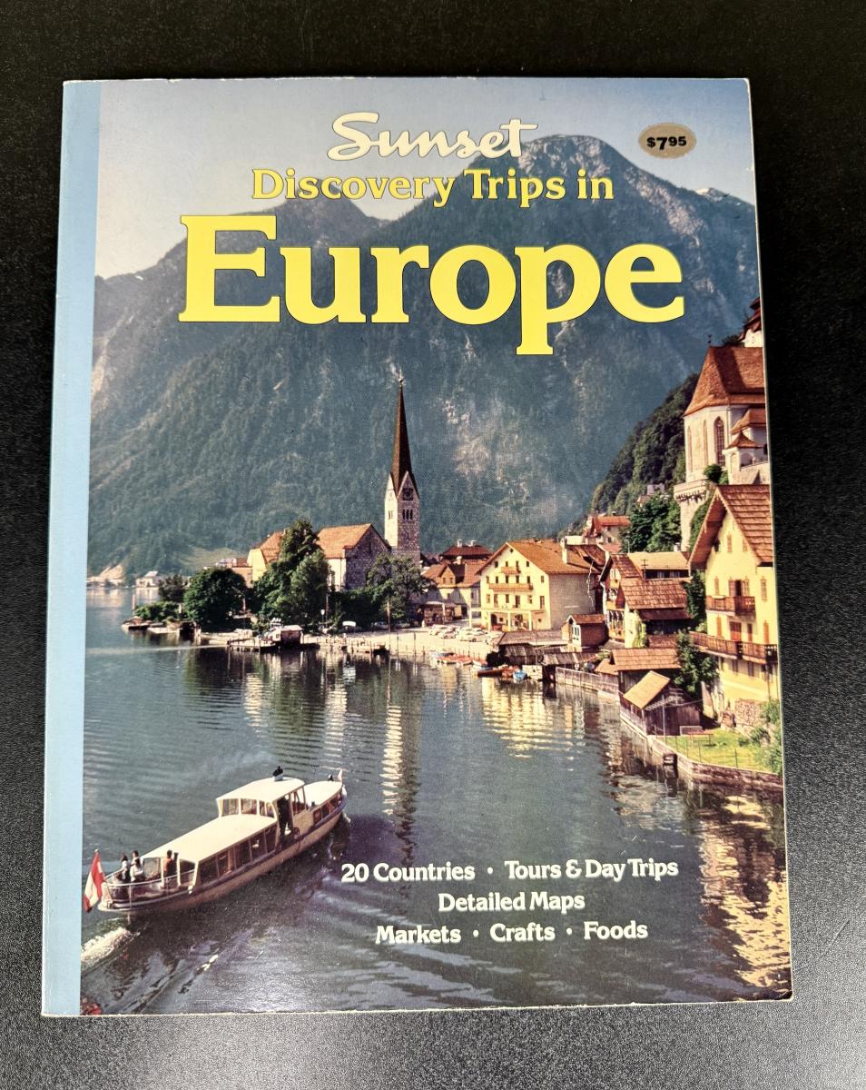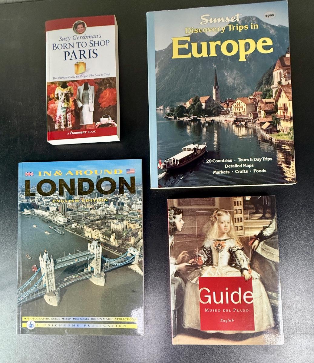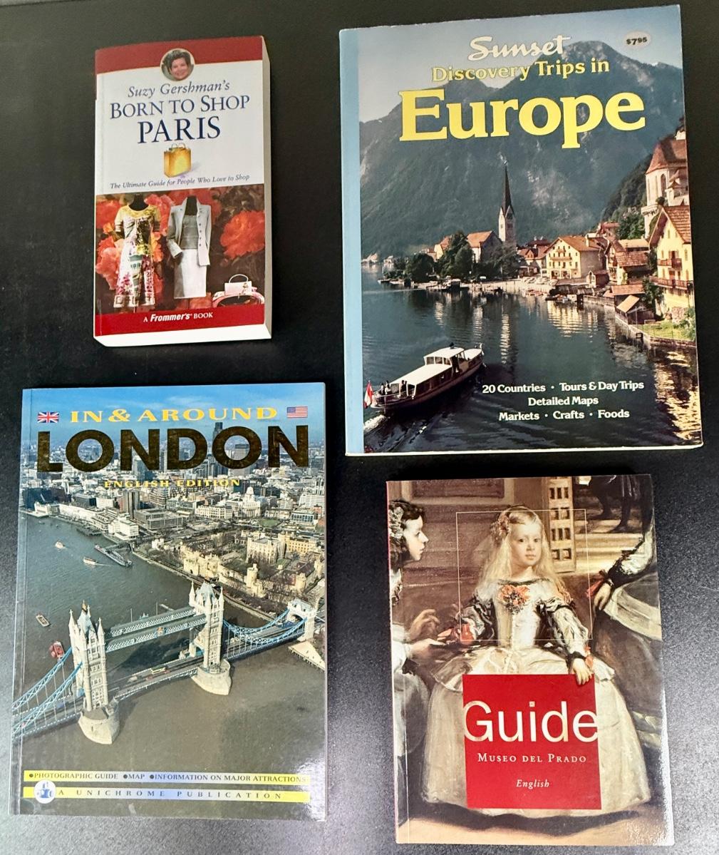 Assorted books: London, shopping in Paris, Spain Museum, and a Sunset Europe Travel Guide.