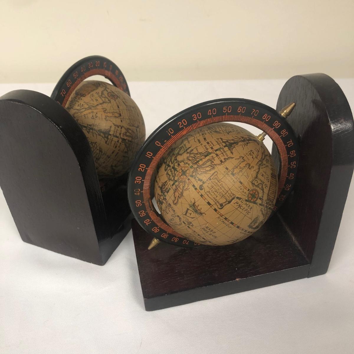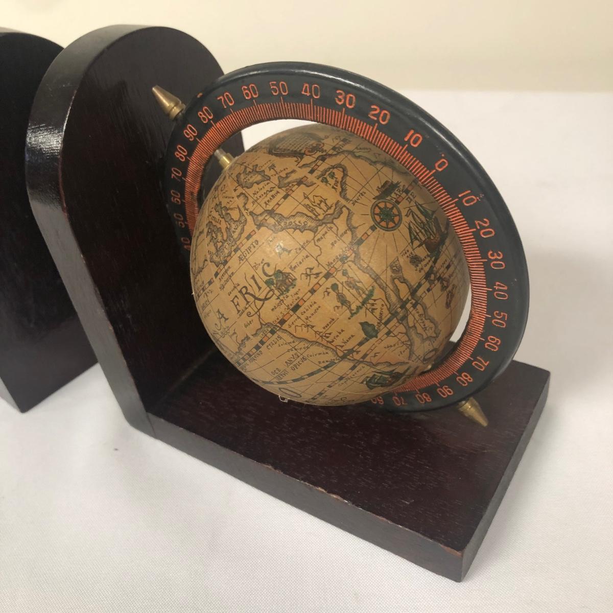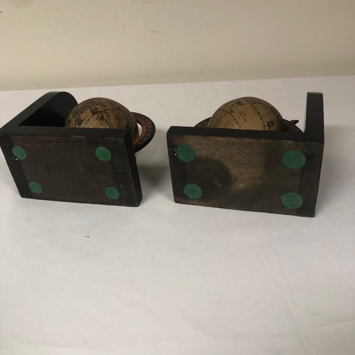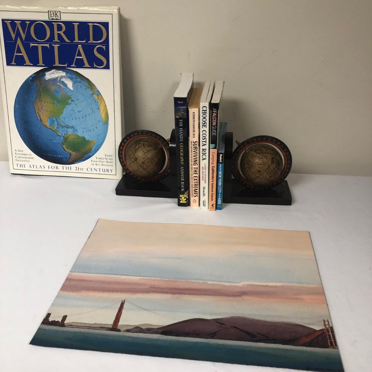 This lot includes six books, a pair of wooden globe bookends and a San Francisco table or desk mat and snow globe. The mat measures 15.5” x 12”. The globes on the bookends turn. Shipping Available.