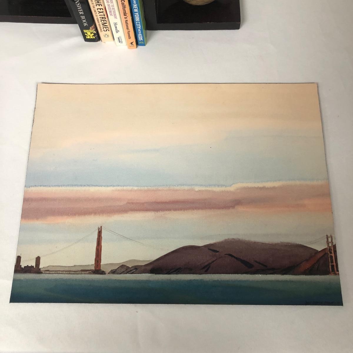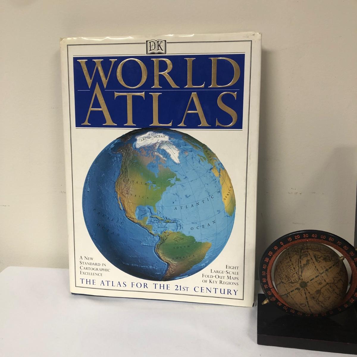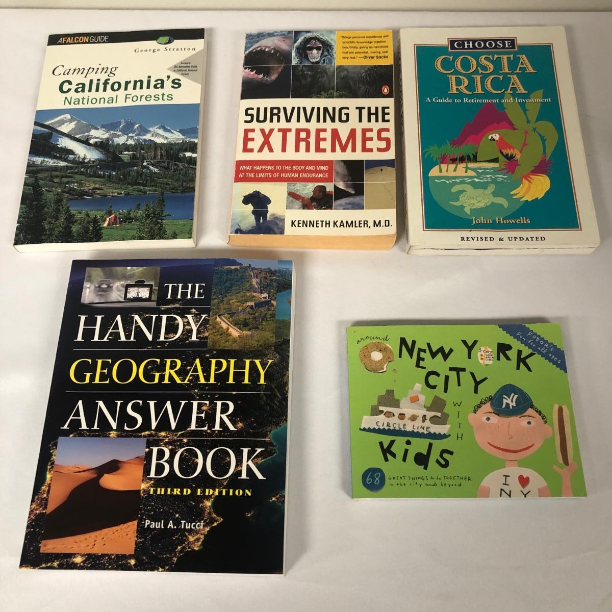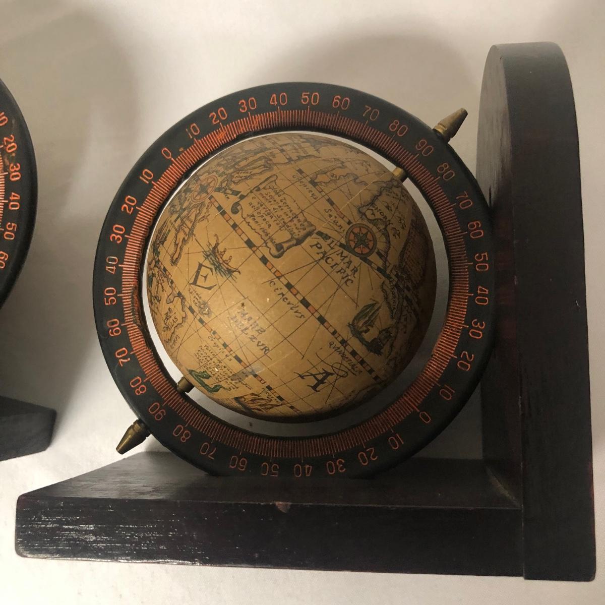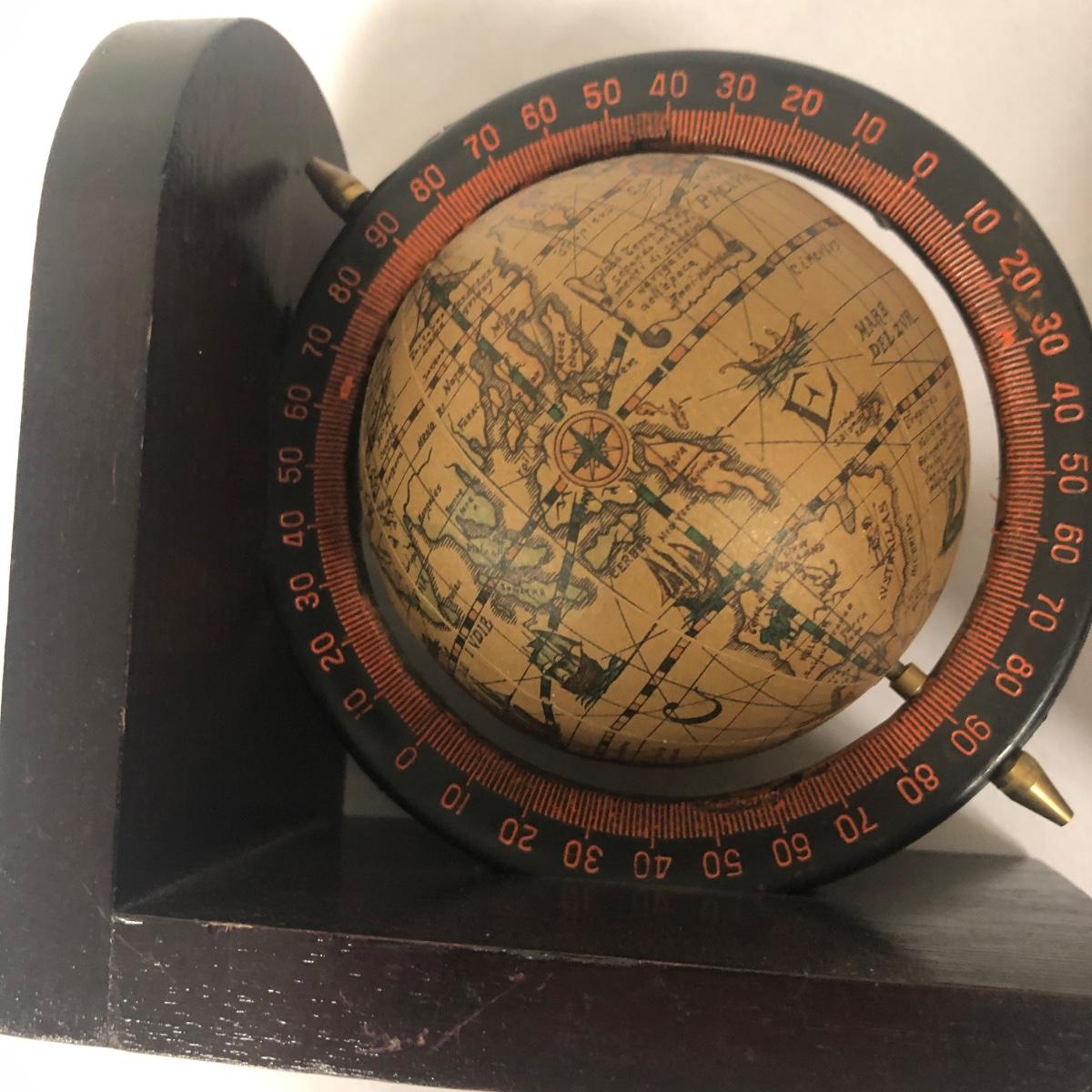 This lot includes six books, a pair of wooden globe bookends and a San Francisco table or desk mat and snow globe. The mat measures 15.5” x 12”. The globes on the bookends turn. Shipping Available.