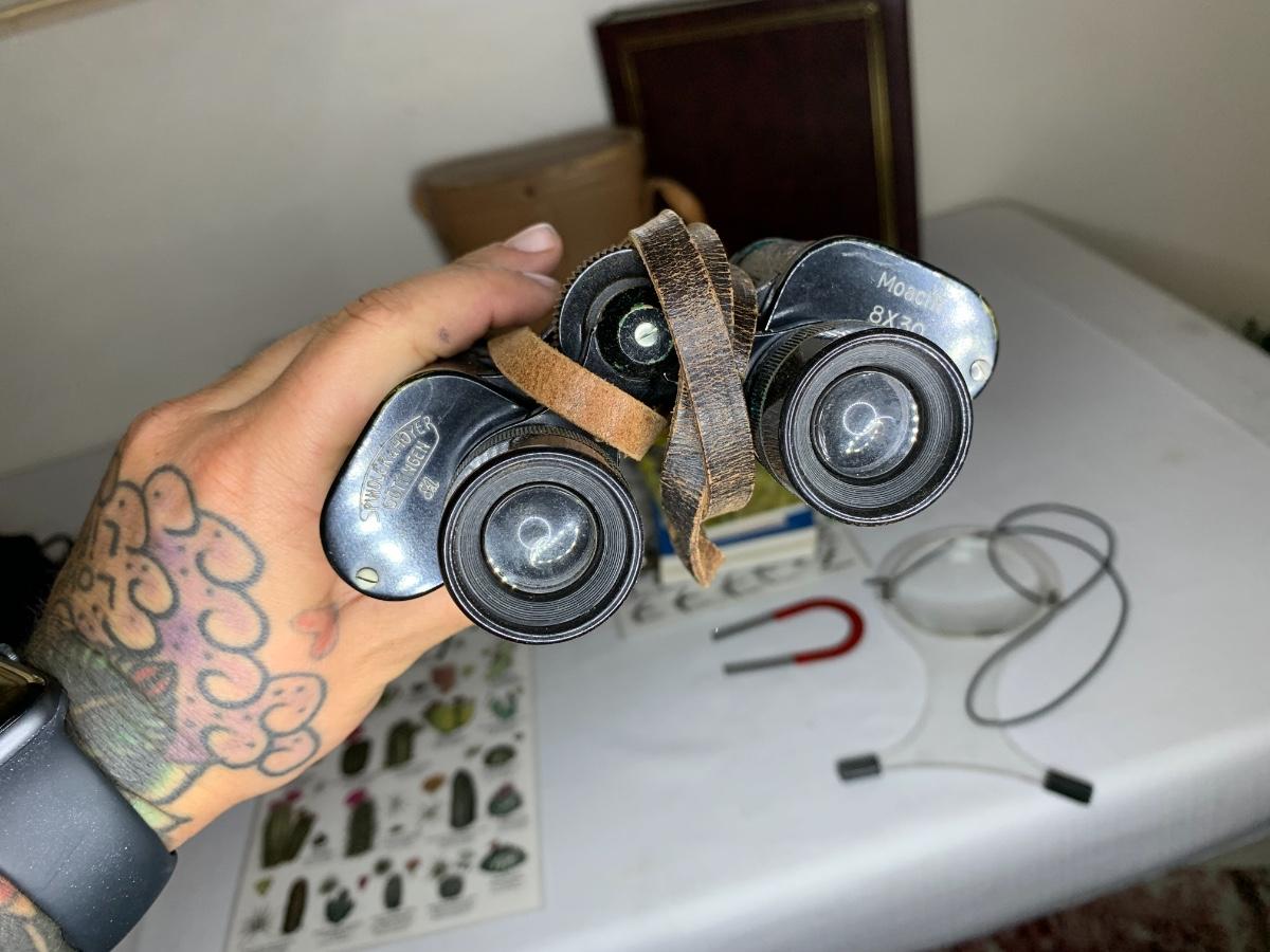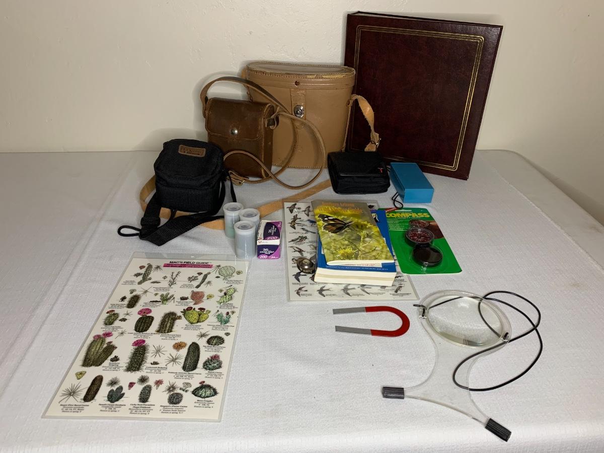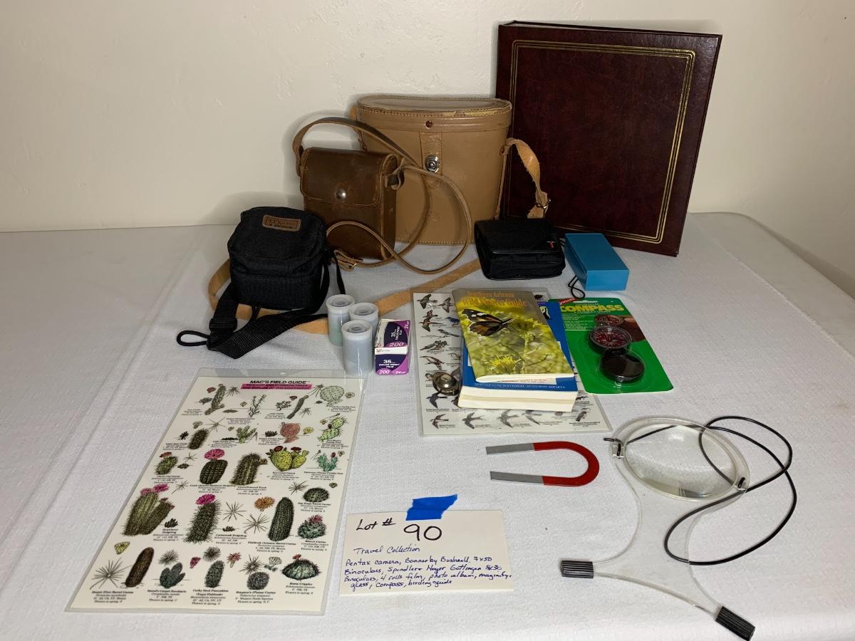 Lot includes Pentax camera, Banner by Bushnell 7x50 bios, Spindler and Hoyer Gottingen 8x30 bins, 4 rolls film, photo album, magnifying glass, birding guides