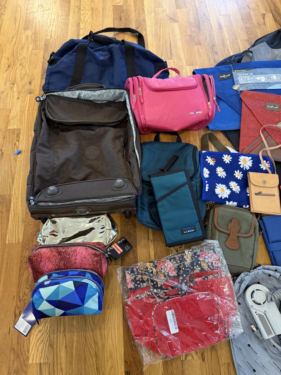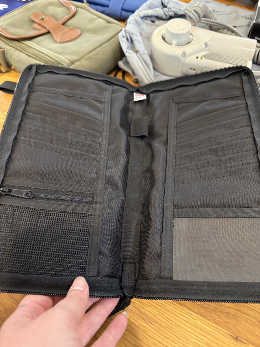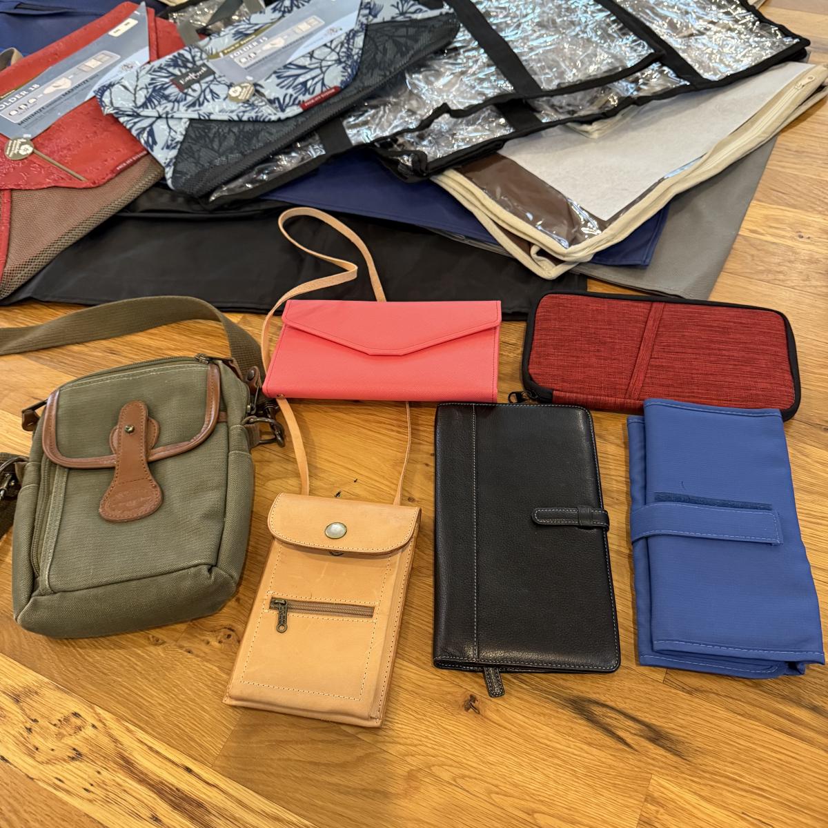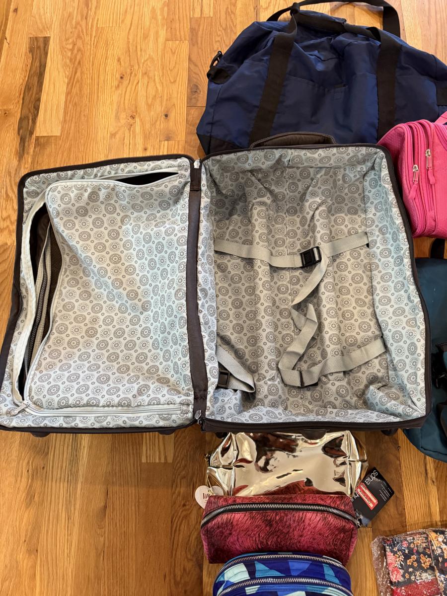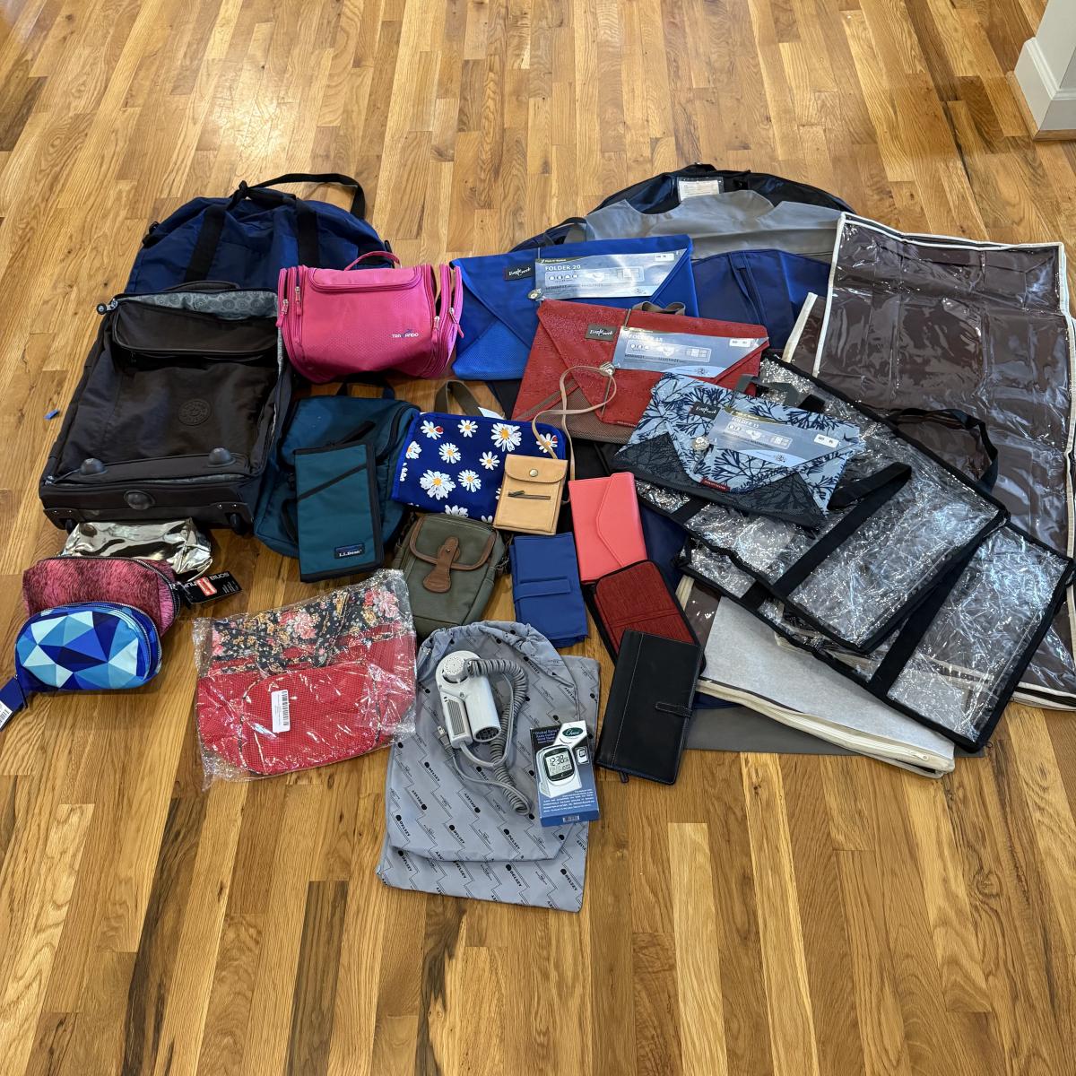 This lot contains over 30 travel luggage items and accessories. Included is a brown carry-on luggage, a navy duffle bag, four toiletry bags, four cosmetic bags, three “folder bags”, a variety of garment bags, and several travel wallets and a couple travel purses, a blow dryer and a travel alarm clock. The brown carry-on measures 16” x 20” x 4”H. Most of the garment bags are approximately the same size measuring about 24” x 40”. The hair dryer powers on when plugged in but the clock requires specific batteries and was not tested. Shipping available. See pictures for details.