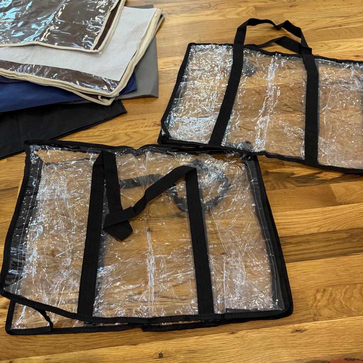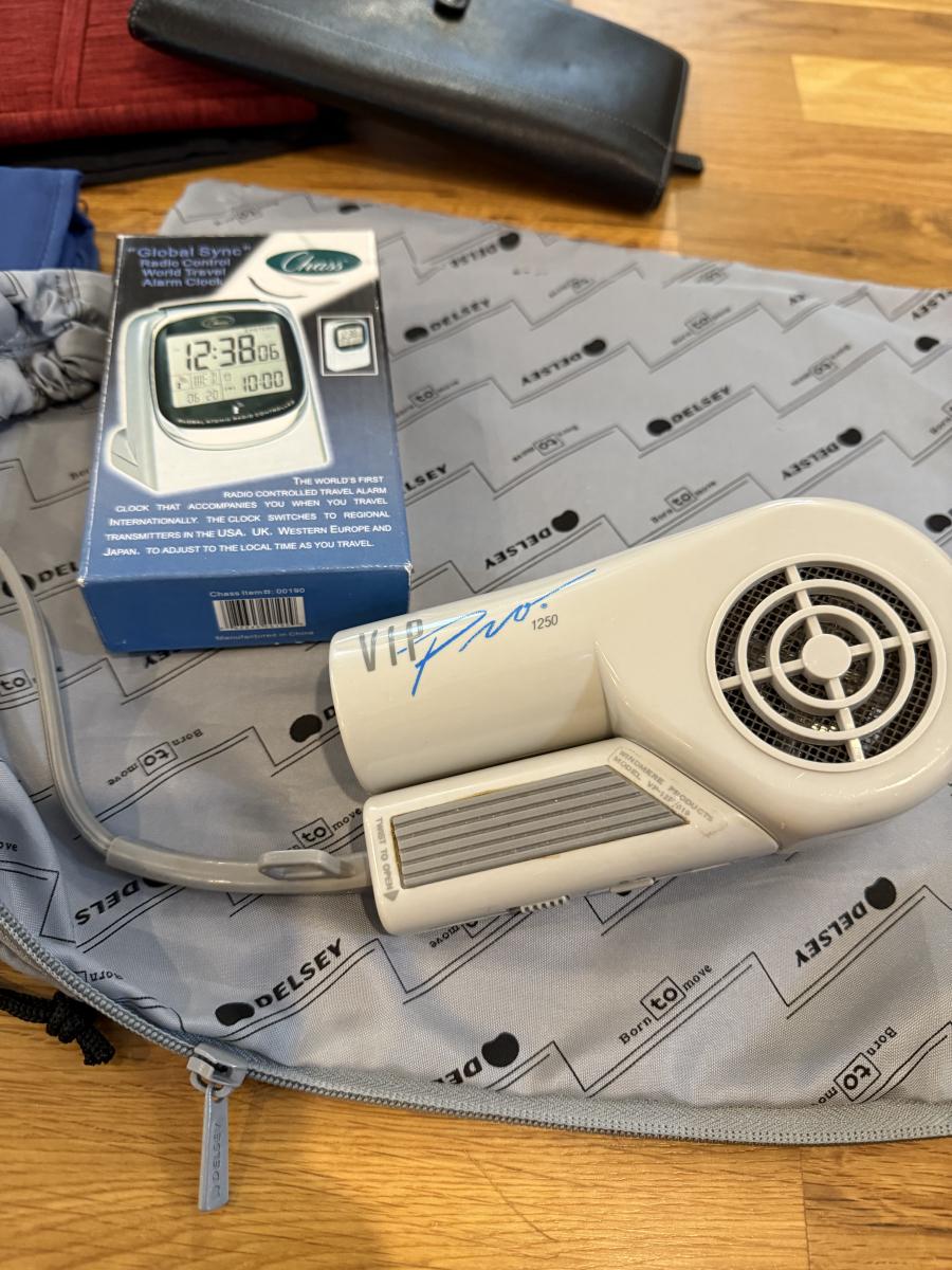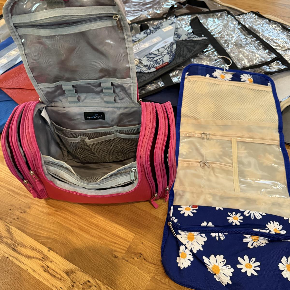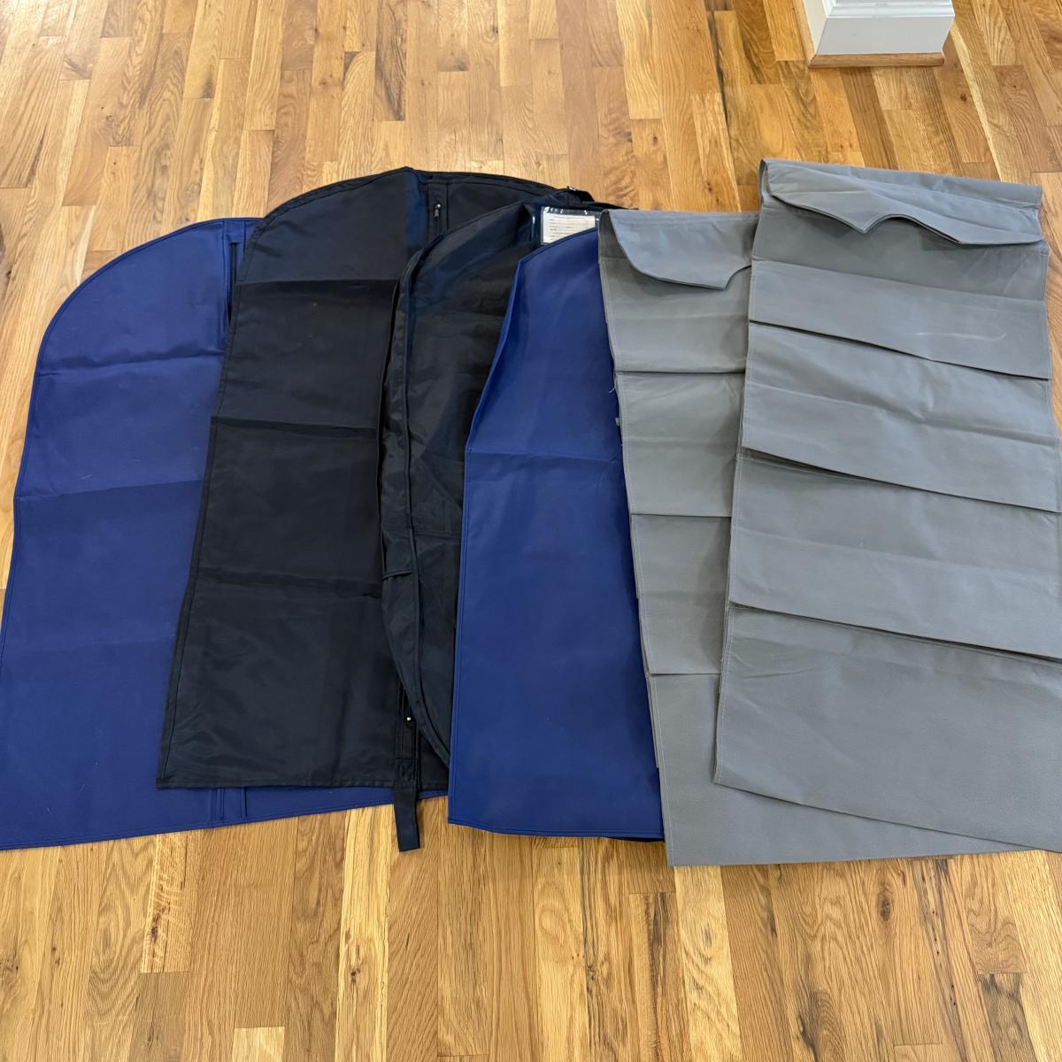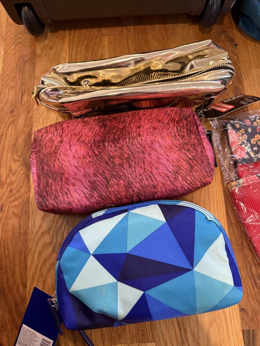 This lot contains over 30 travel luggage items and accessories. Included is a brown carry-on luggage, a navy duffle bag, four toiletry bags, four cosmetic bags, three “folder bags”, a variety of garment bags, and several travel wallets and a couple travel purses, a blow dryer and a travel alarm clock. The brown carry-on measures 16” x 20” x 4”H. Most of the garment bags are approximately the same size measuring about 24” x 40”. The hair dryer powers on when plugged in but the clock requires specific batteries and was not tested. Shipping available. See pictures for details.