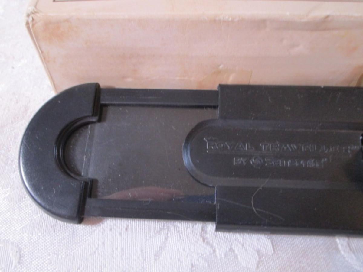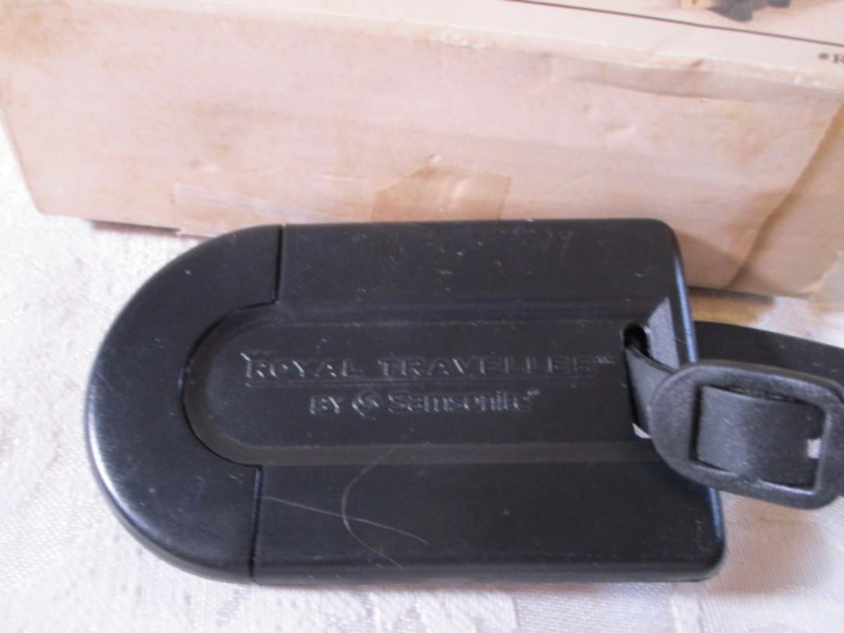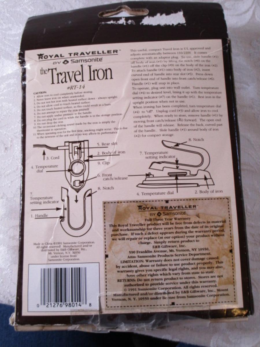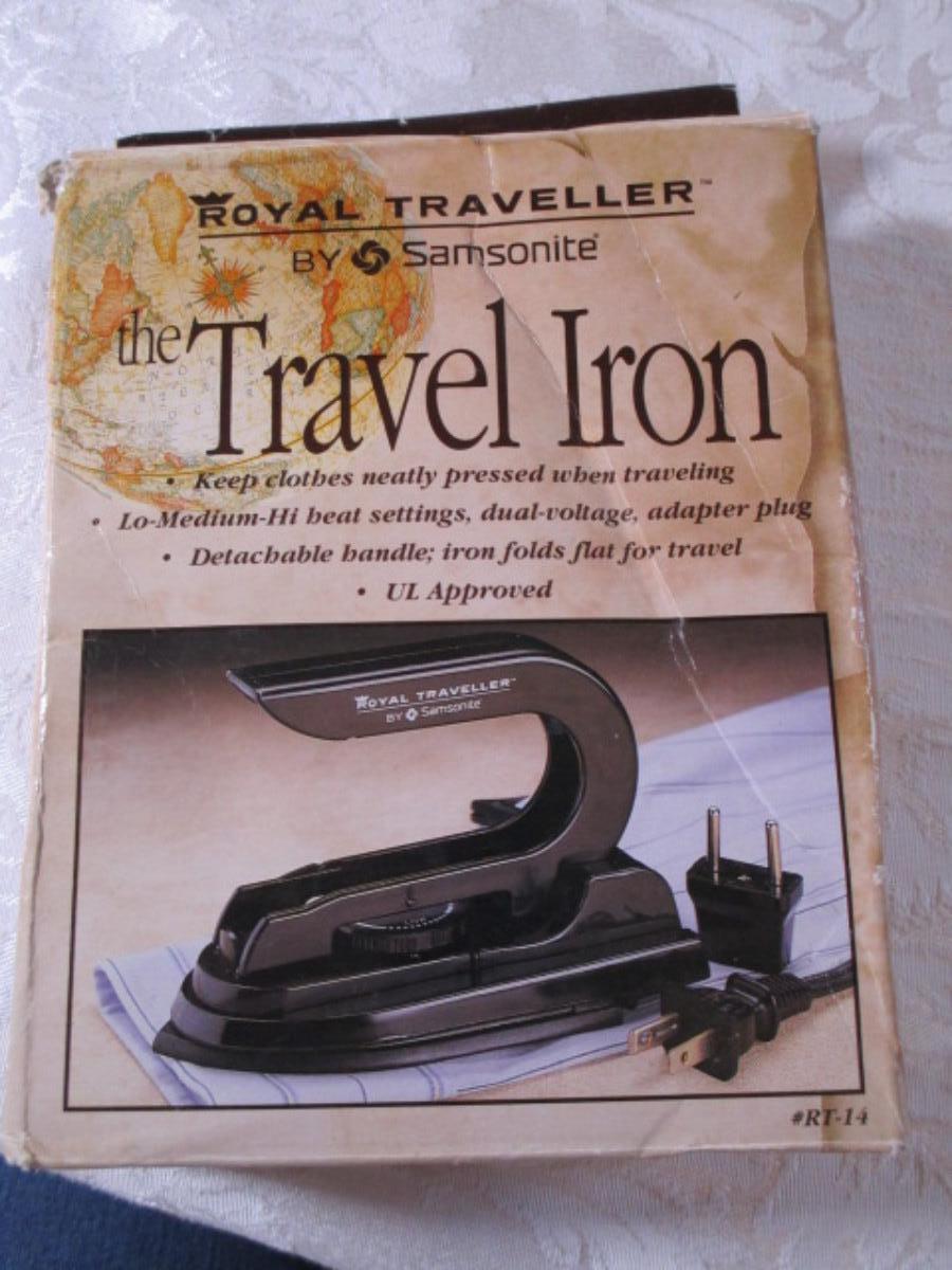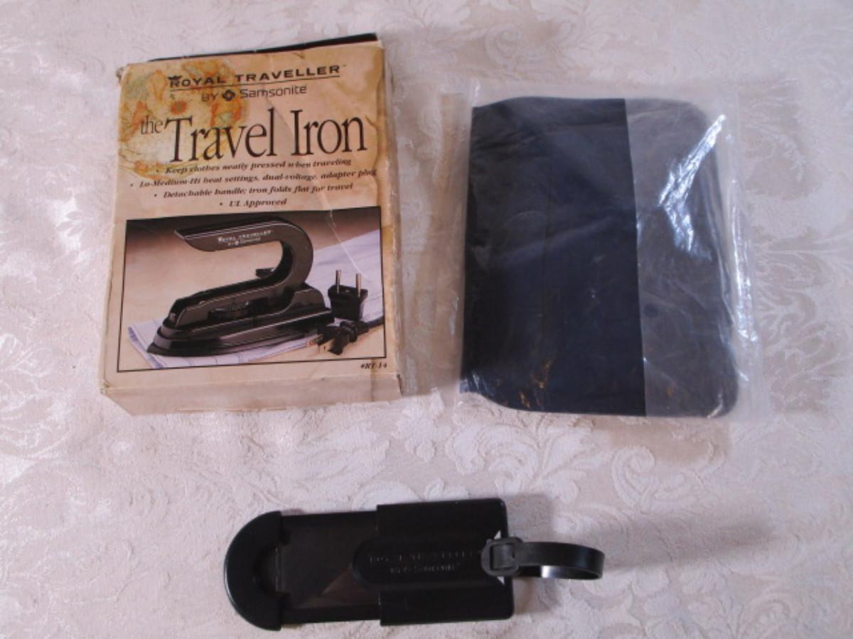 Vintage travel iron (tested and it works), inflatable travel pillow, luggage tag