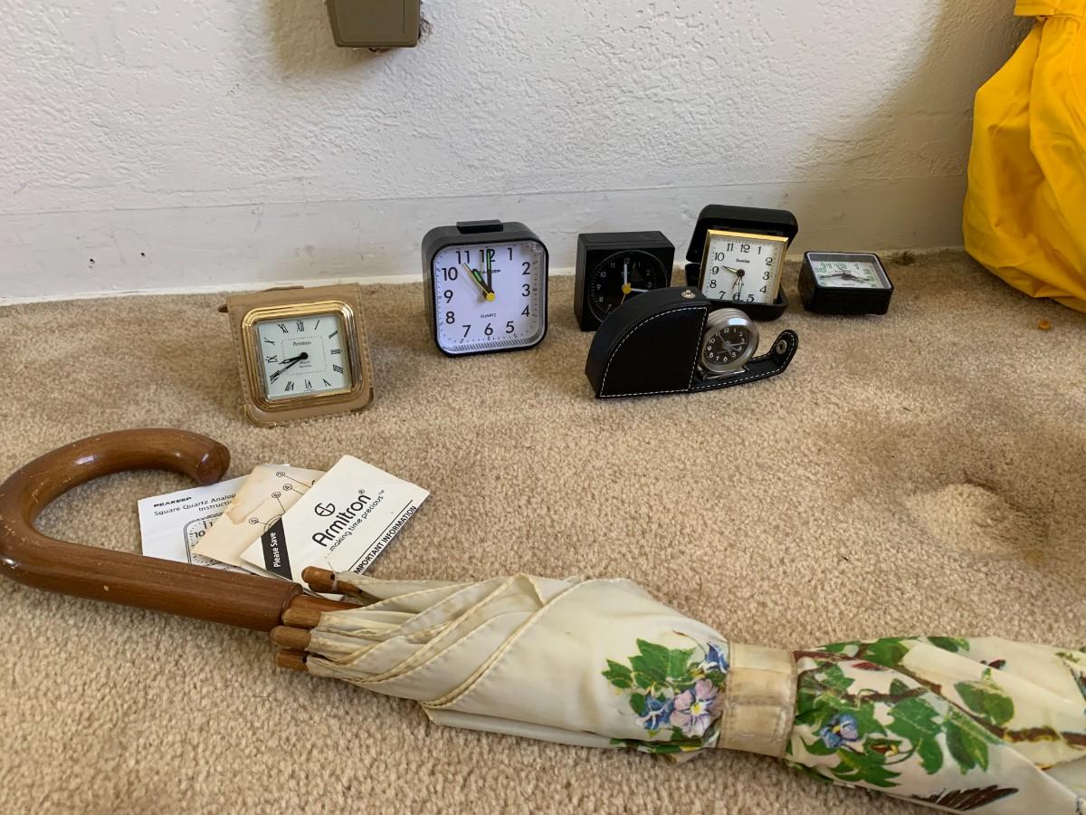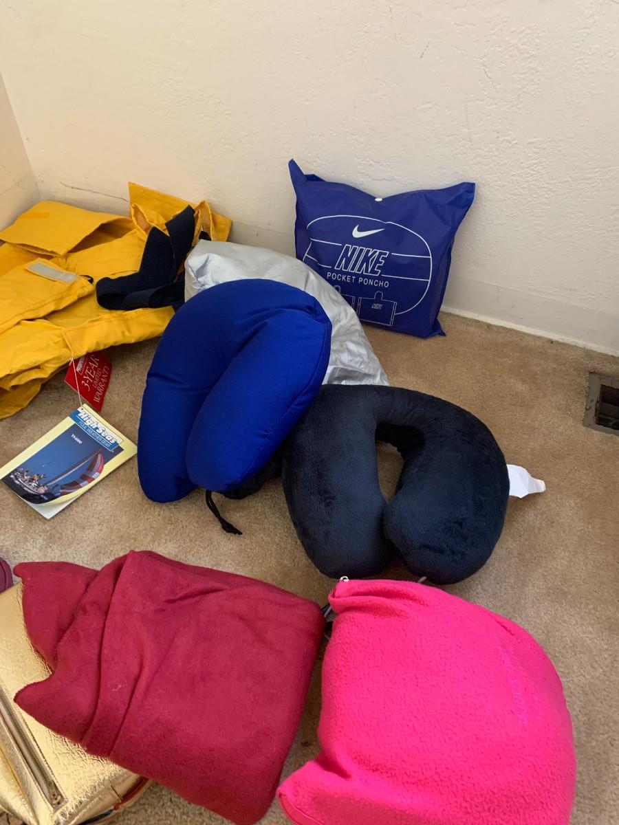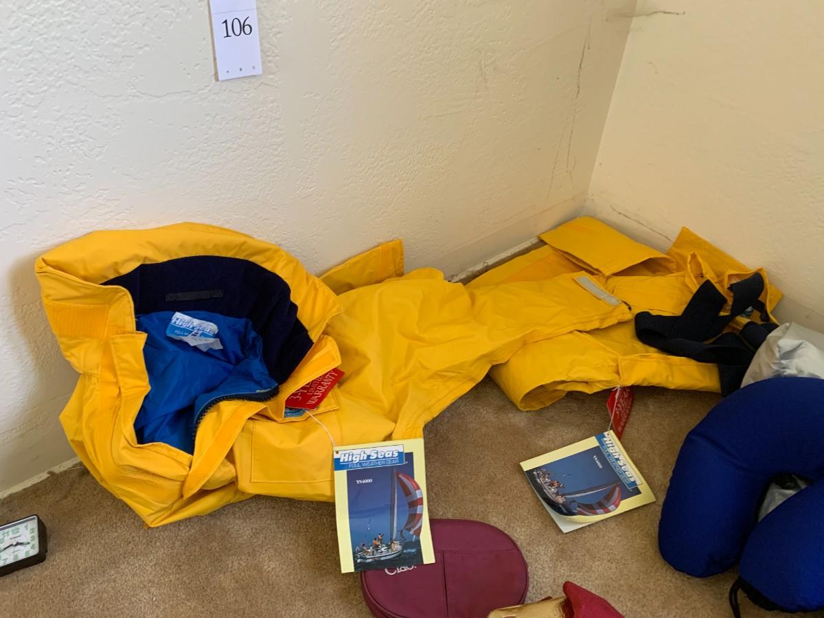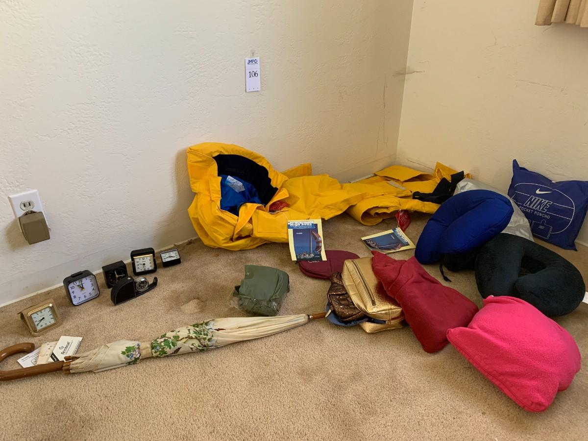 New High Seas rain jacket and pants. Travel alarm clocks, not tested. Umbrella, small travel bags and neck pillows. Nike rain poncho and other rain gear.