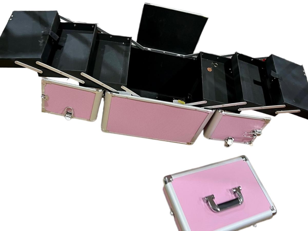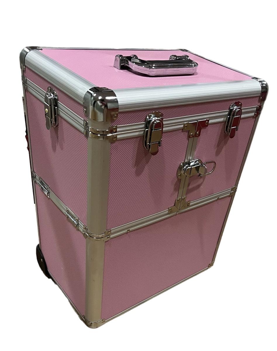 Travel jewelry case on wheels with telescoping handle. Locks, with key, pink, 20” tall. Lots of storage!