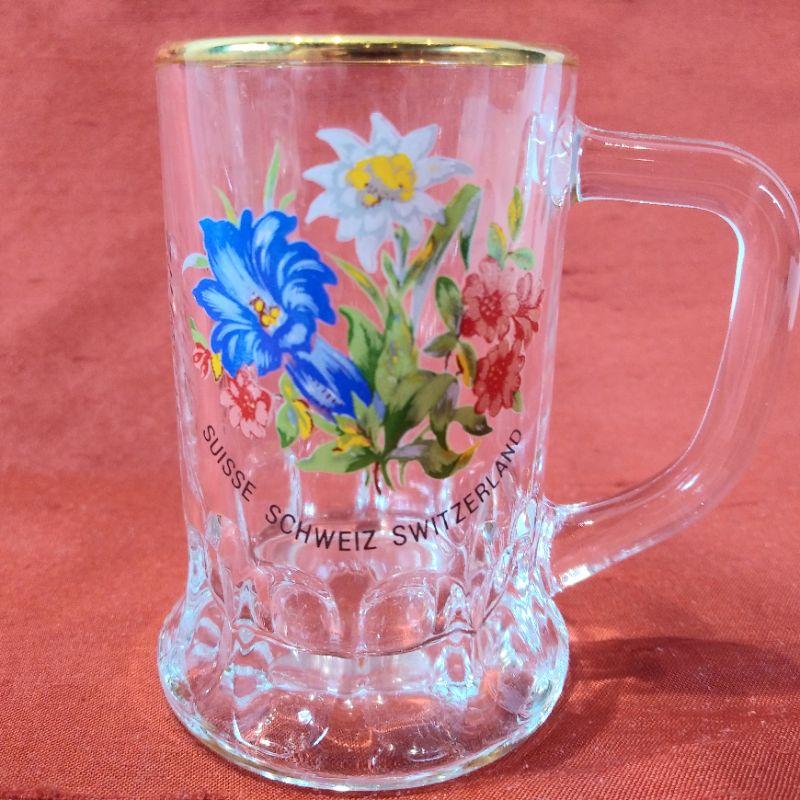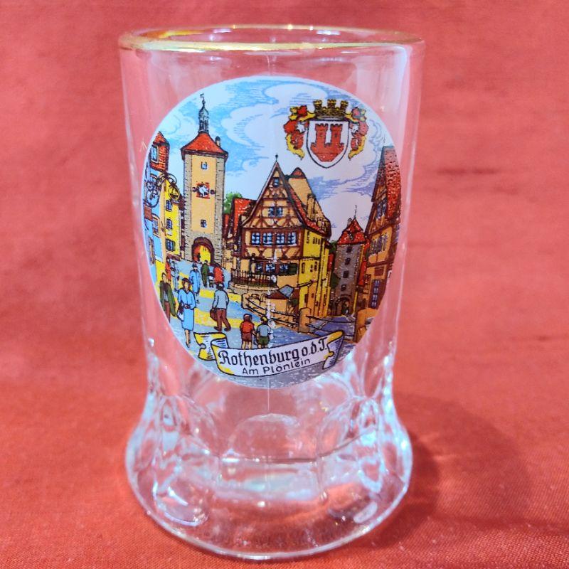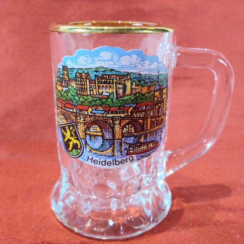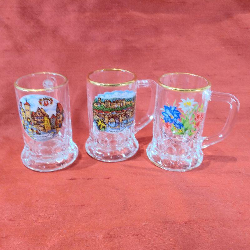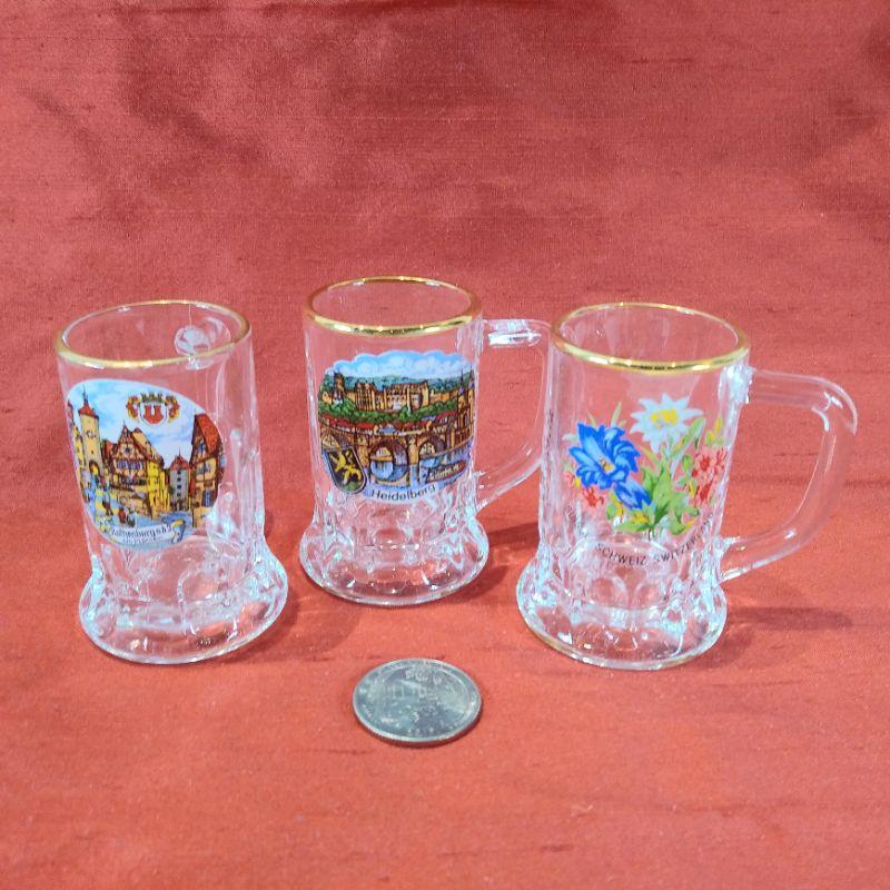 A fun little collection of miniature glass mugs from our clients worldly travels. Only used as display, they are 2 3/4-inches tall. Mugs From: Rothenburg, Heidelberg & Switzerland.