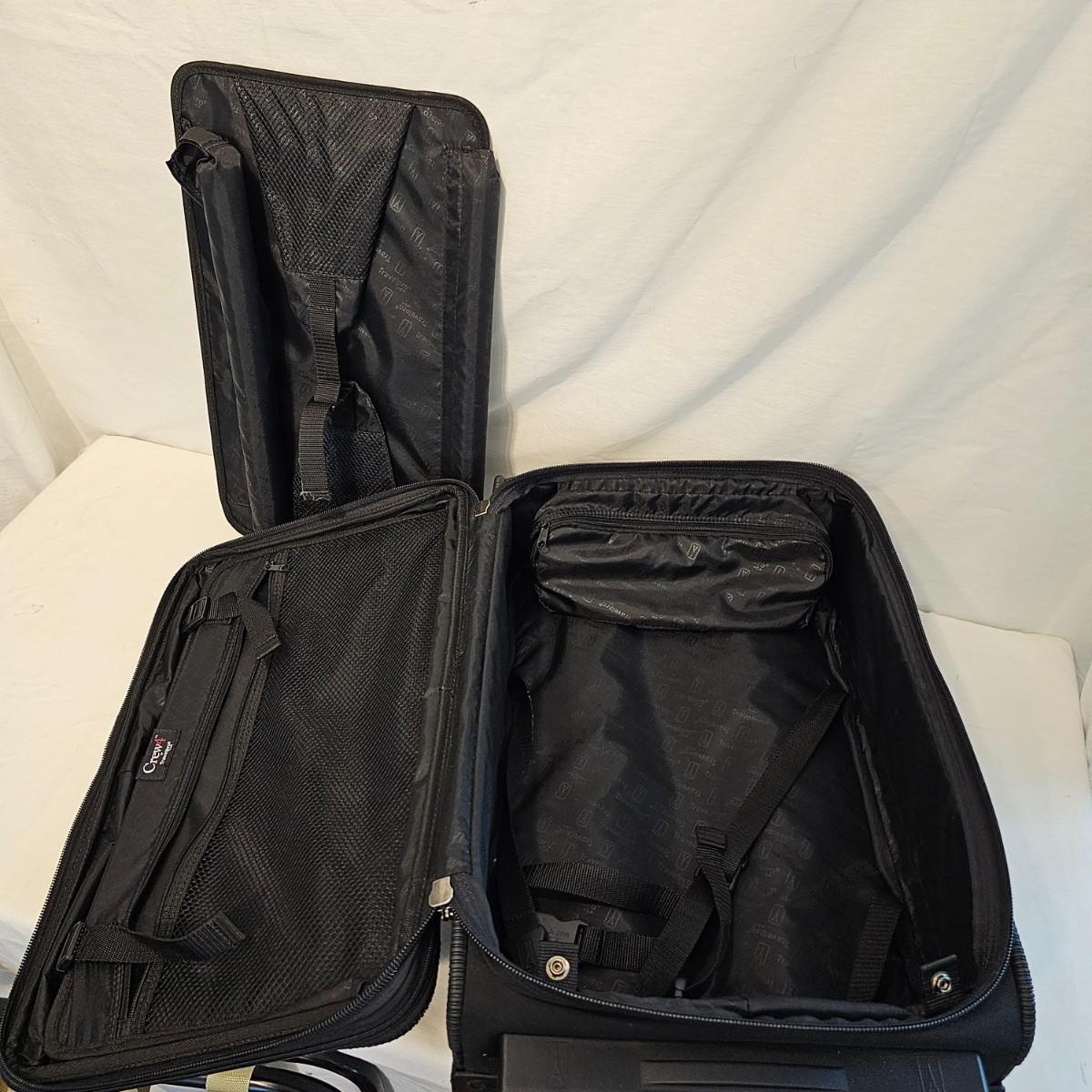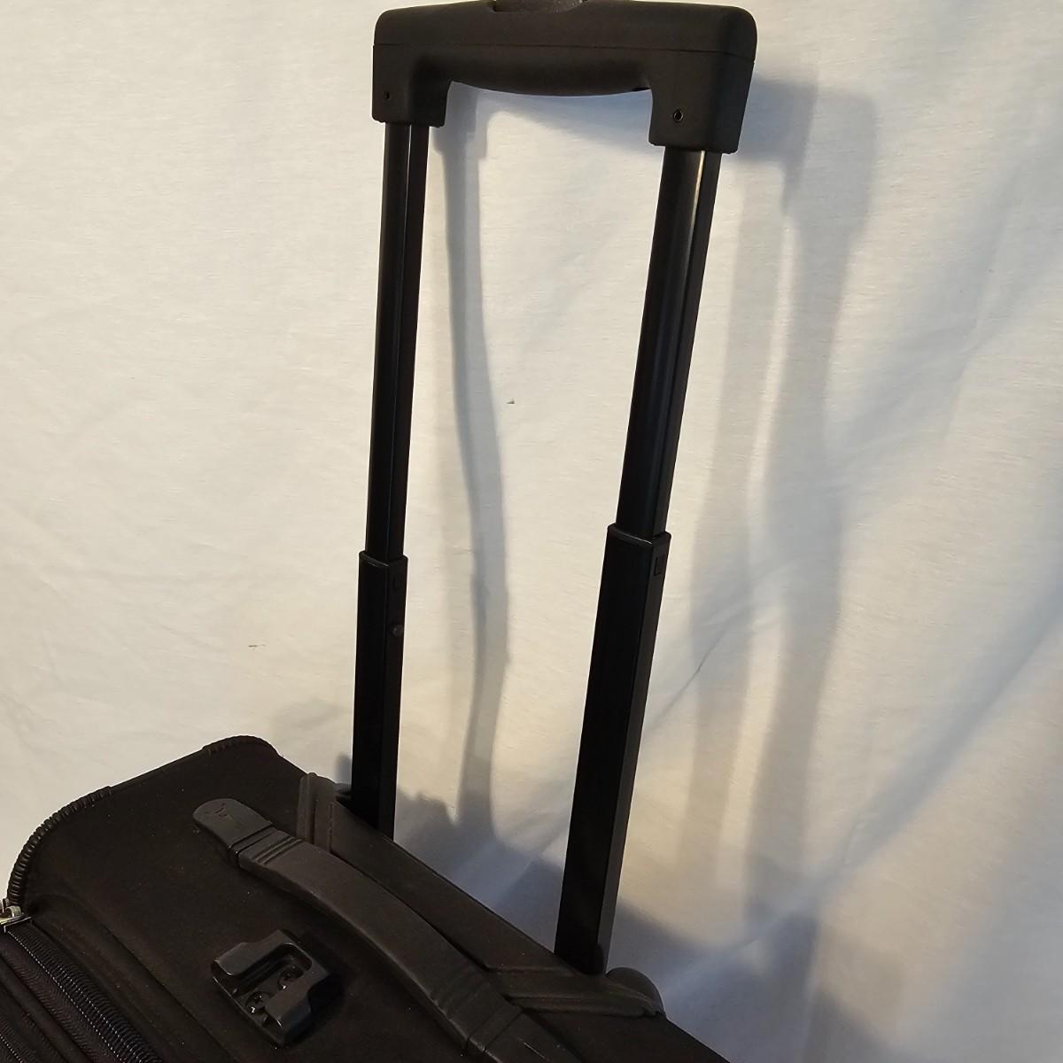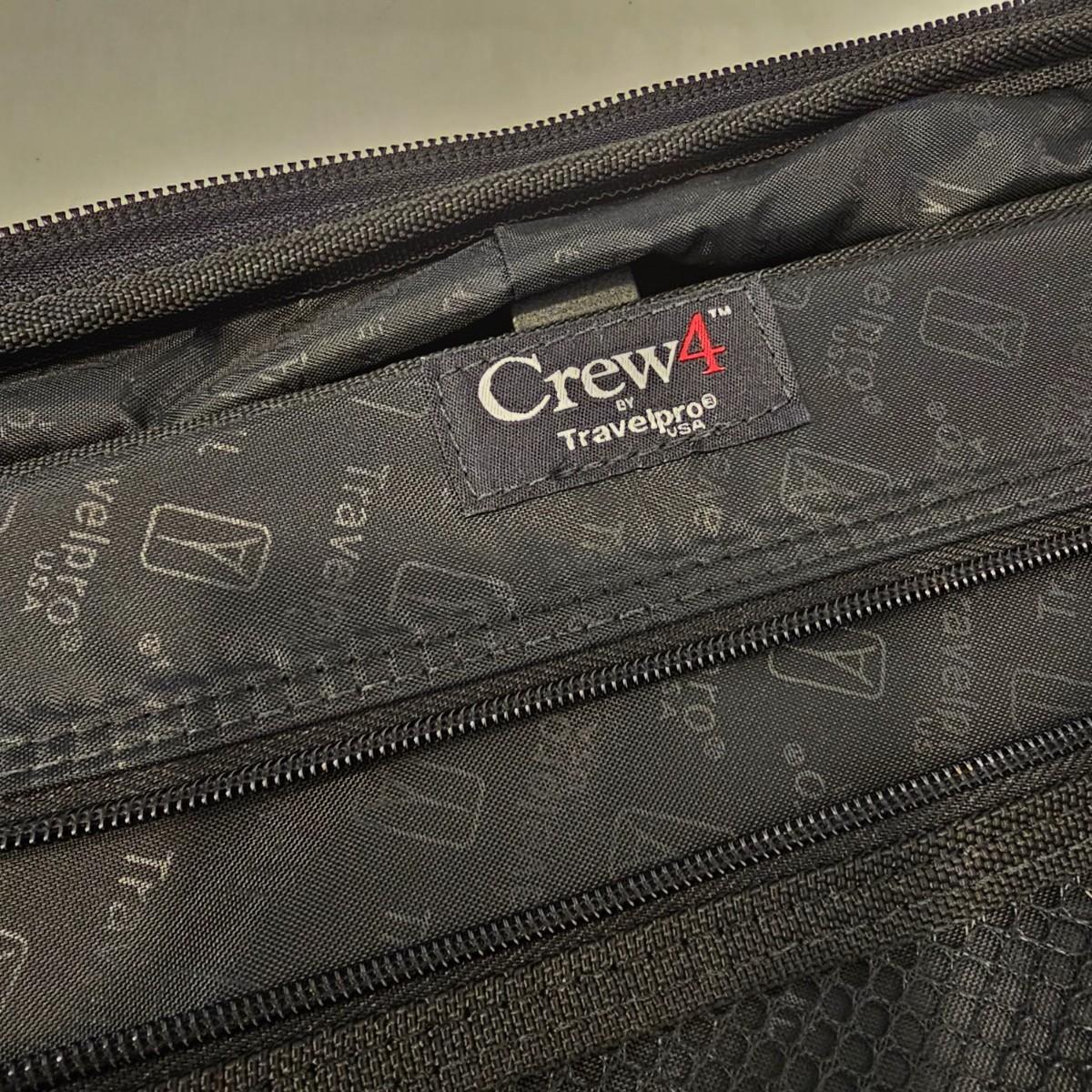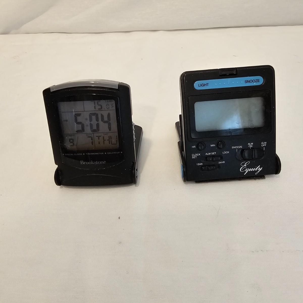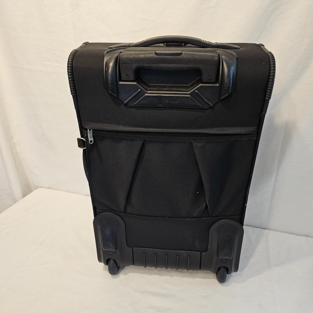 TravelPro brand Crew4 wheeled luggage, has pull-up handle, multiple compartments and more. Measures 15" x 12" x 25"H. Also two aluminum folding luggage stands with fabric straps, each 24" x 14" x 21"H. And two battery travel alarm clocks, tested working. See photos for details. Local pickup only.