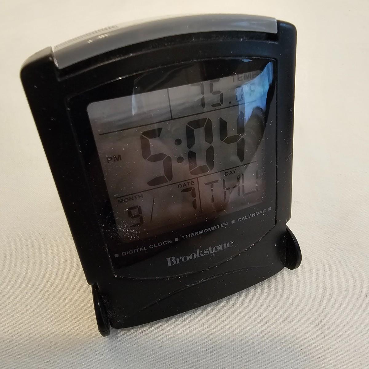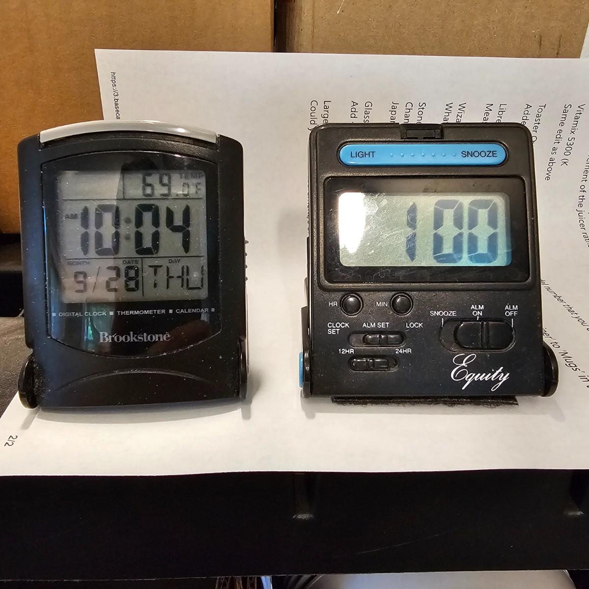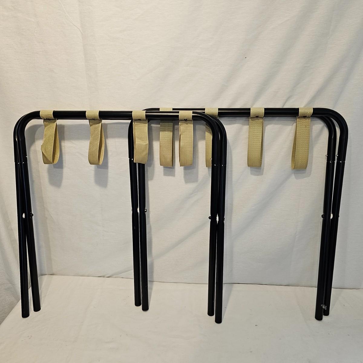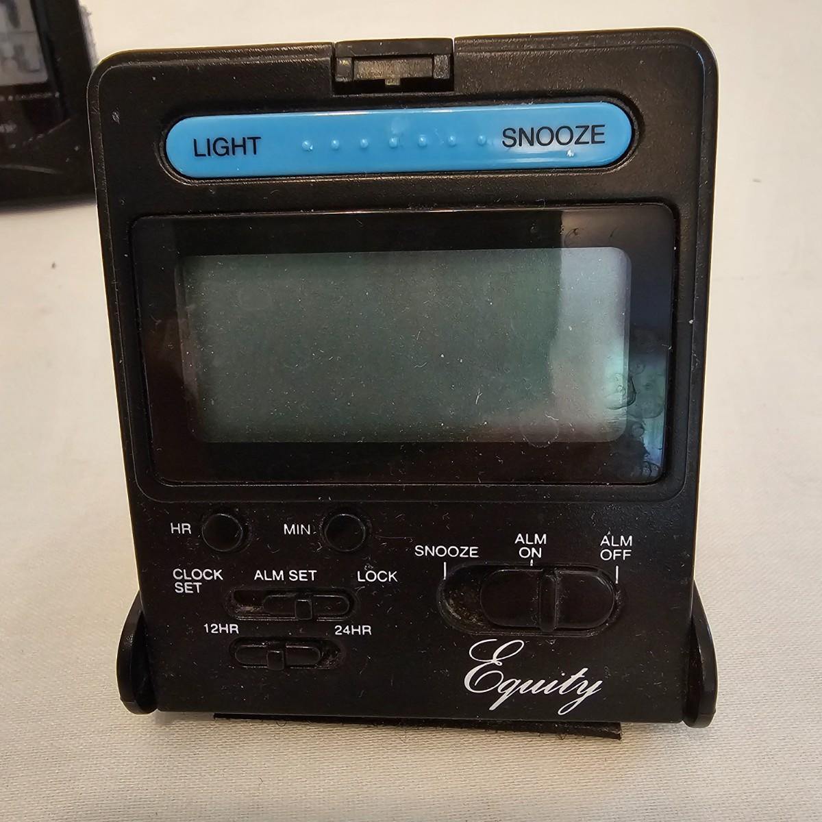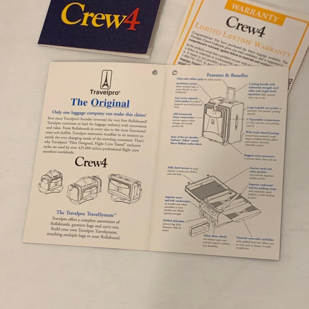 TravelPro brand Crew4 wheeled luggage, has pull-up handle, multiple compartments and more. Measures 15" x 12" x 25"H. Also two aluminum folding luggage stands with fabric straps, each 24" x 14" x 21"H. And two battery travel alarm clocks, tested working. See photos for details. Local pickup only.