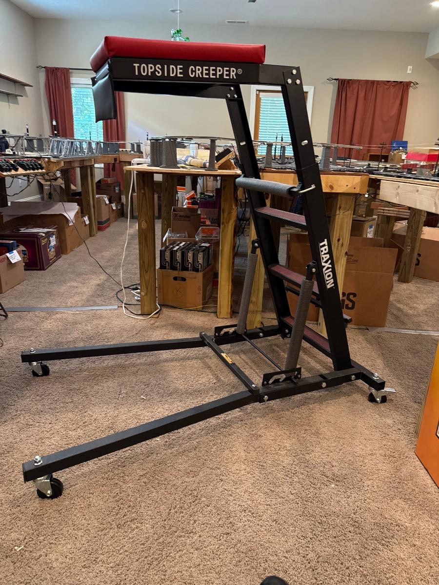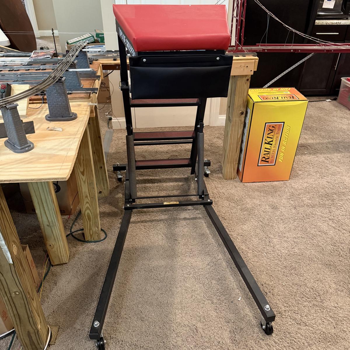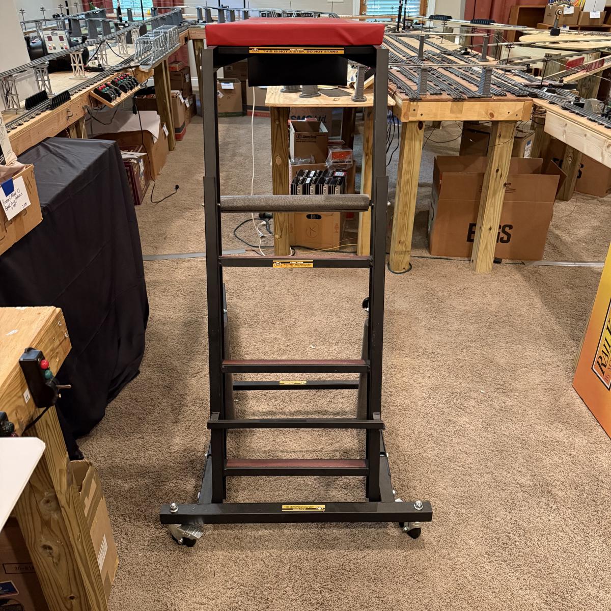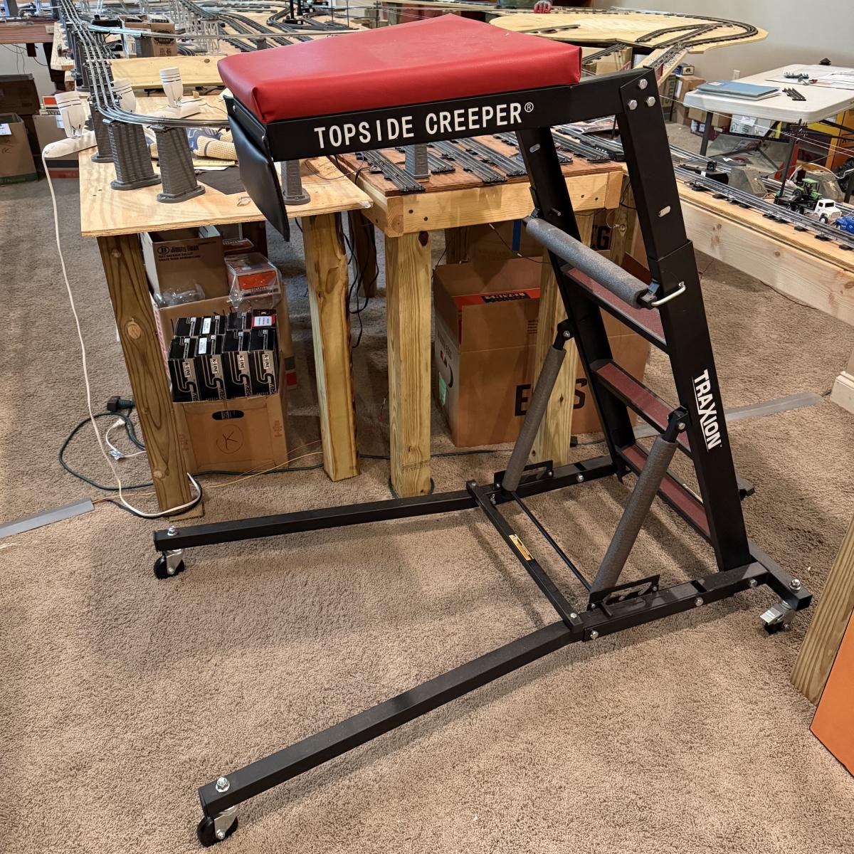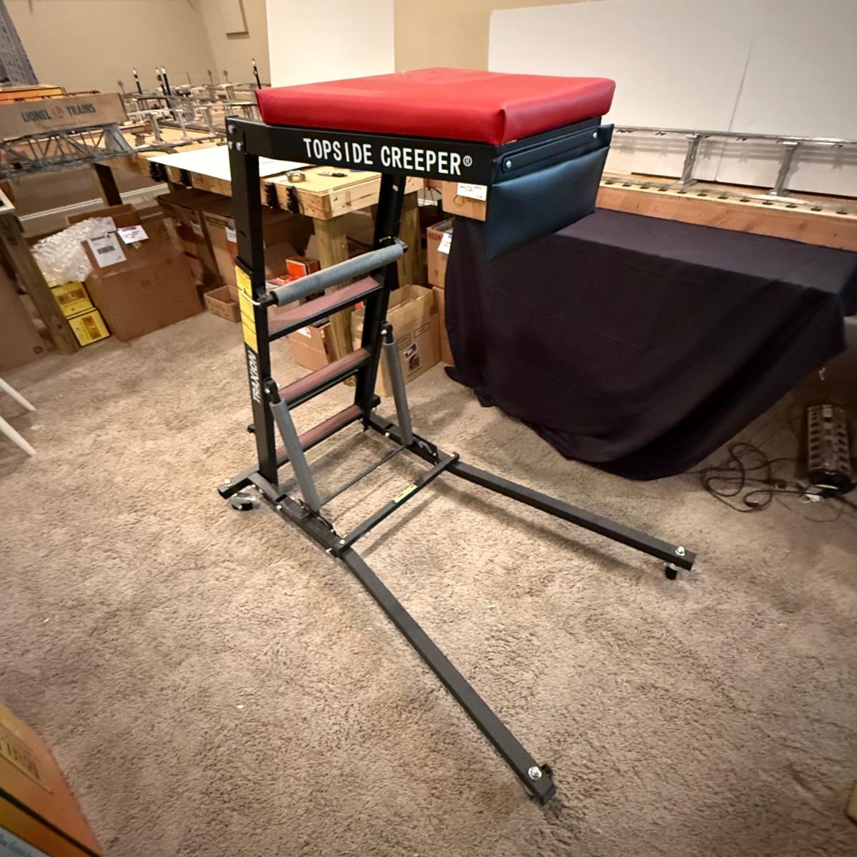 This lot contains a Traxion Topside Creeper, which is an ergonomic tool designed to help you do mechanical work while leaning over something. This item features three steps and a padded deck to lean on as well as a small pouch off the front. It measures 31” x 54” x 50”H and appears to be slightly adjustable. Local pick up only. This lot is located in the basement and will need to be either moved up a flight of stairs to the main level and then down a few stairs at the entry, or it can be moved out the back door of the basement and carried up an incline on the side of the house. Winner bidder must bring tools to disassemble. Please note train track and other surrounding items are not included in this lot but can be found in another lot in this sale.