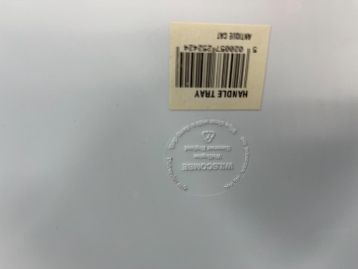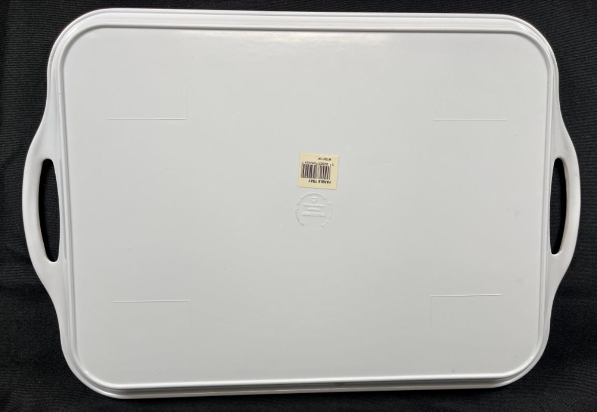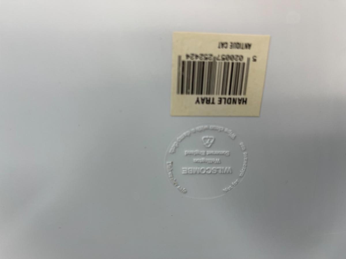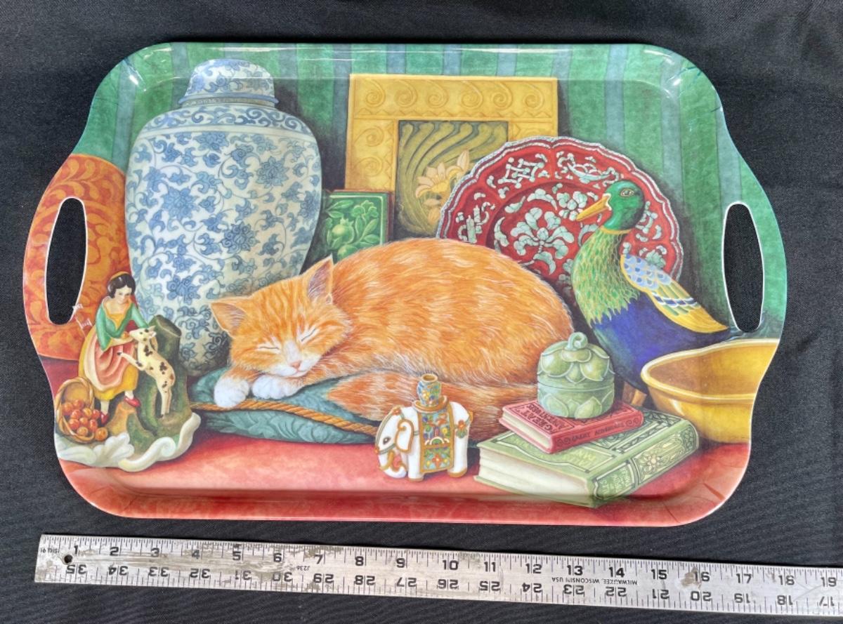 Melamine plastic serving tray. Features an orange tabby sleeping amongst collectibles. Good condition.