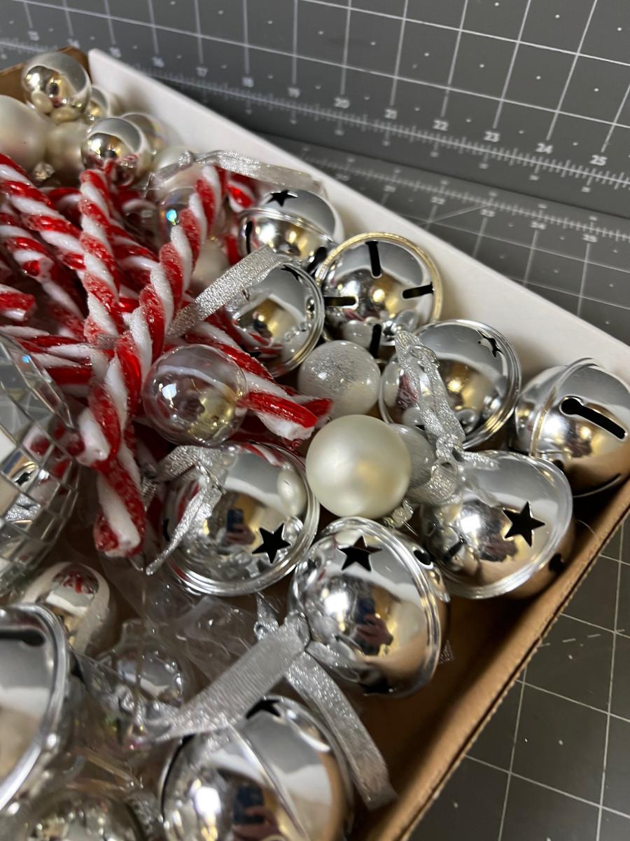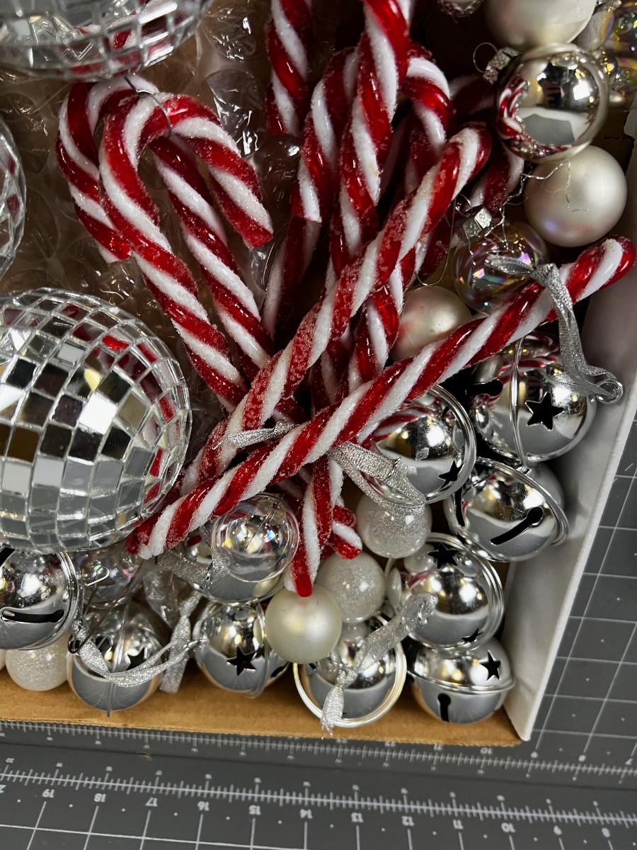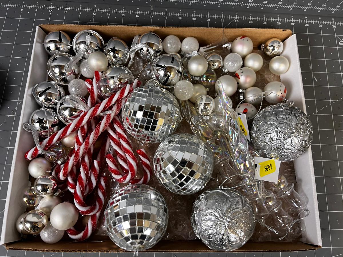 Tray of Christmas Ornaments Snowmen, Silver, Candy Canes