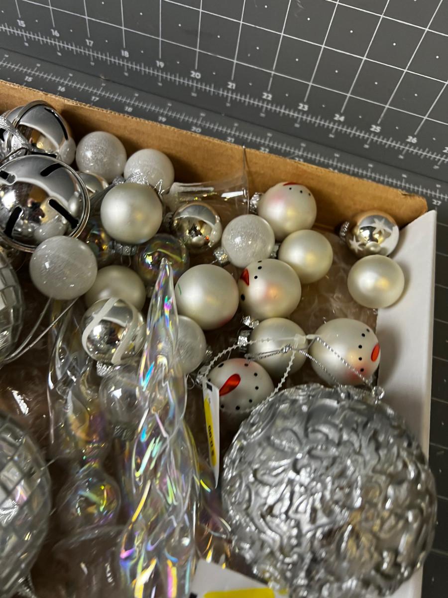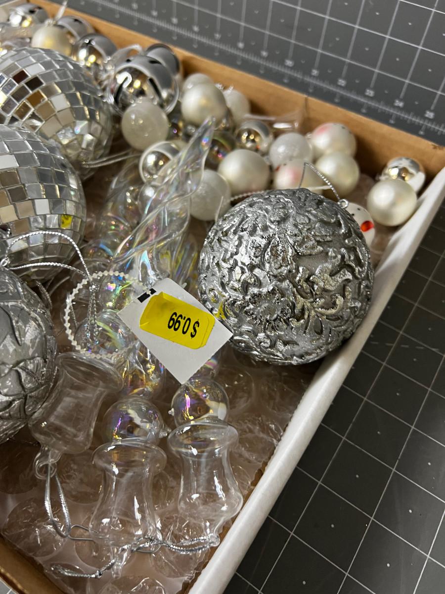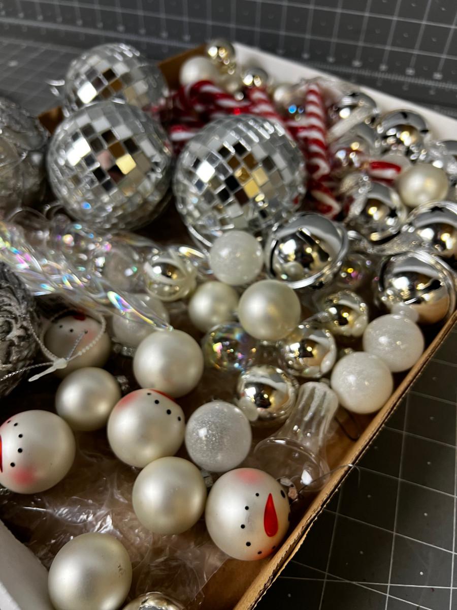 Tray of Christmas Ornaments Snowmen, Silver, Candy Canes