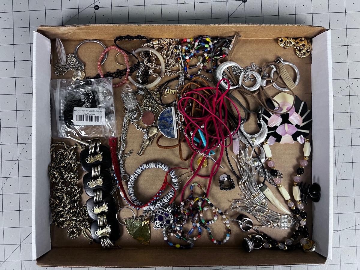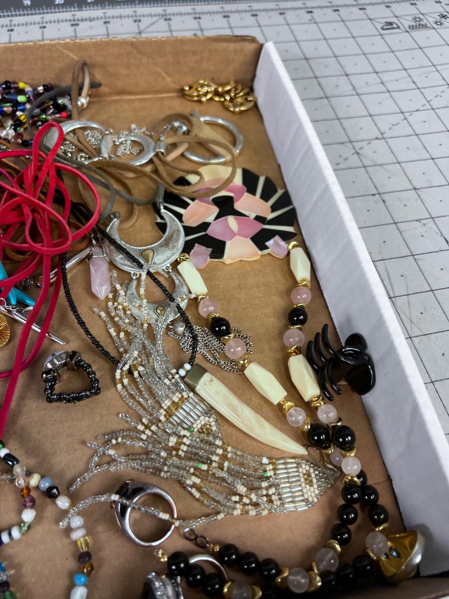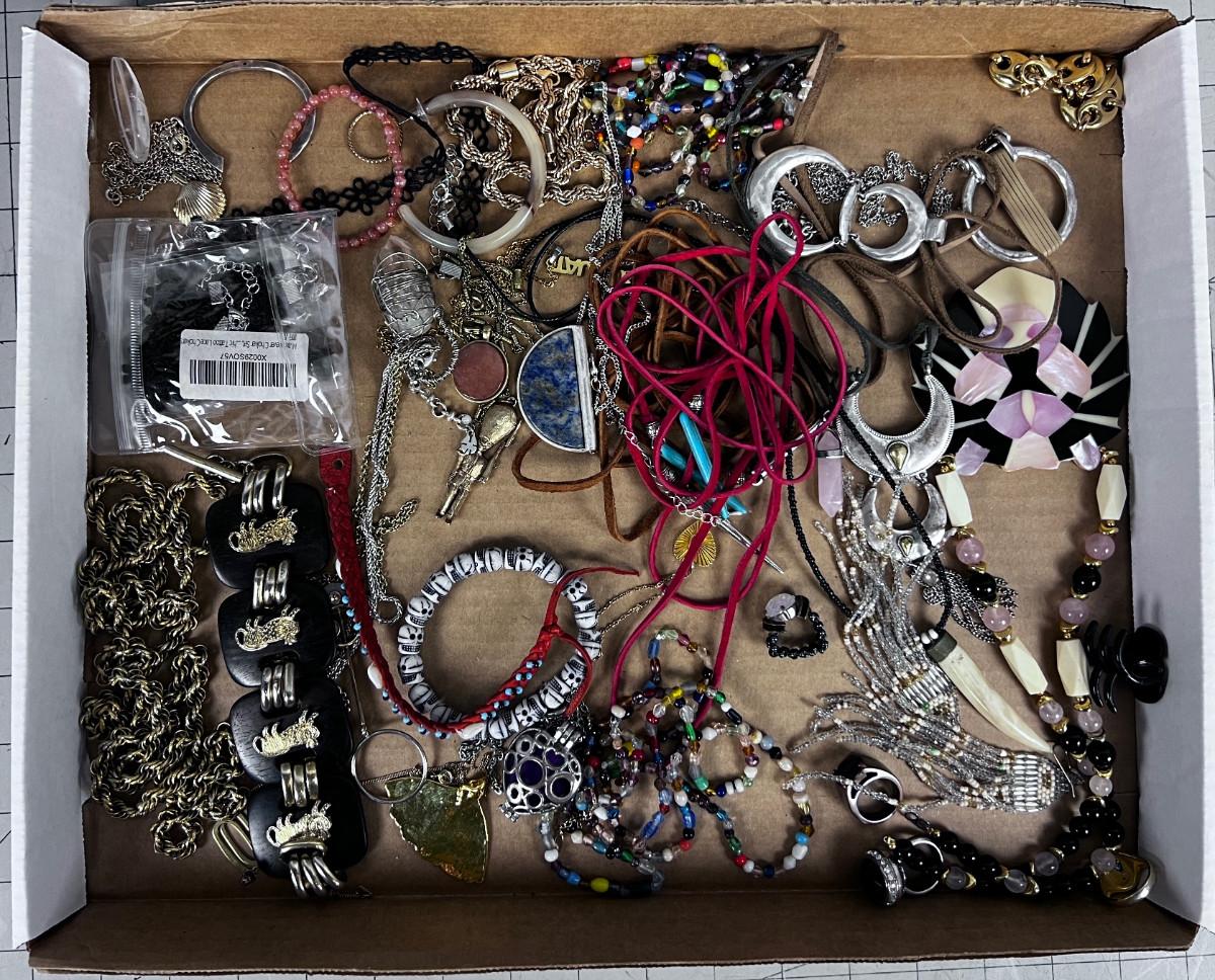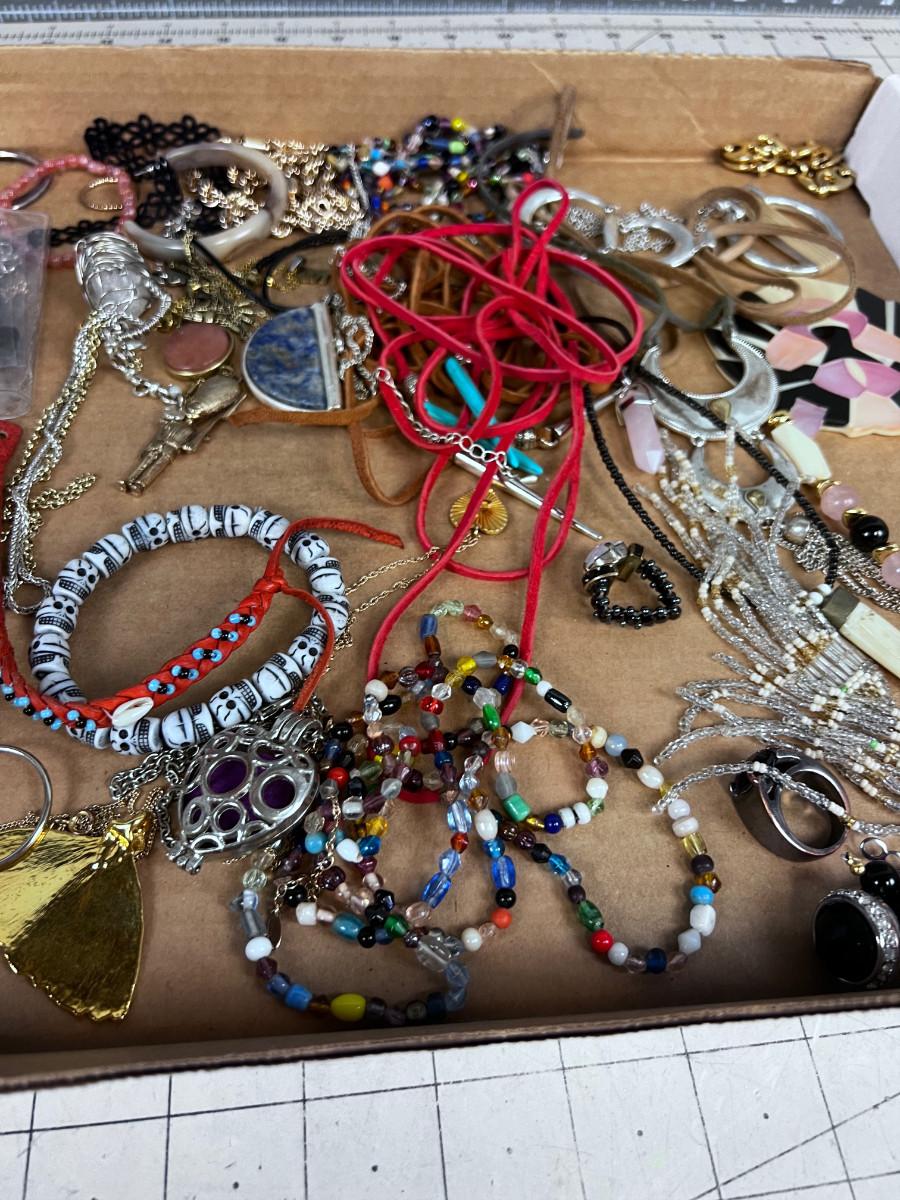 Used And mostly Wearable. Some single Earrings and some Clasps broken.