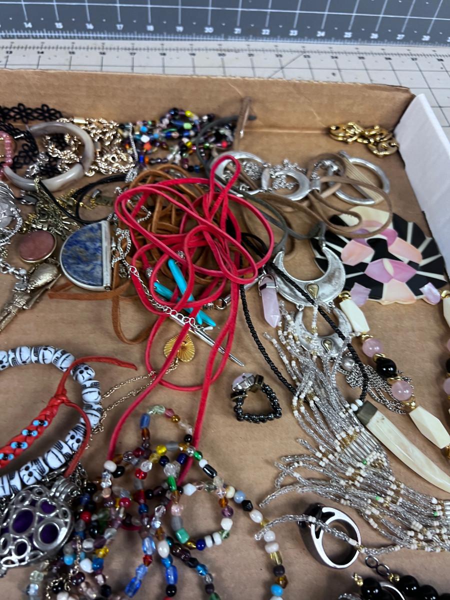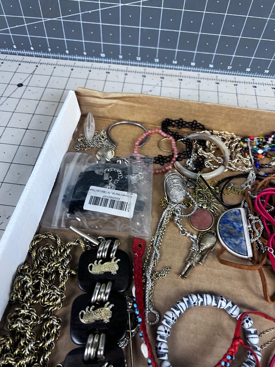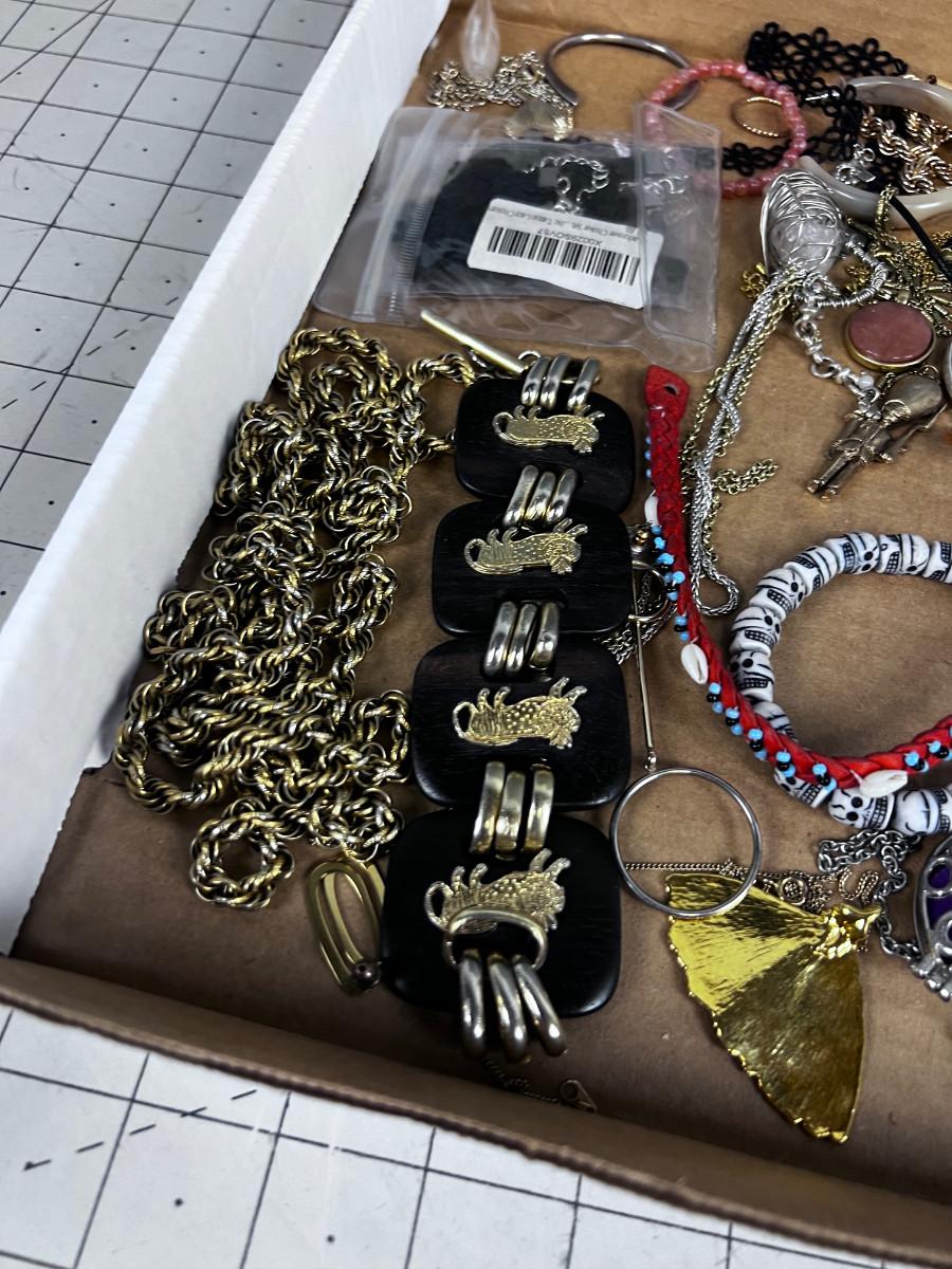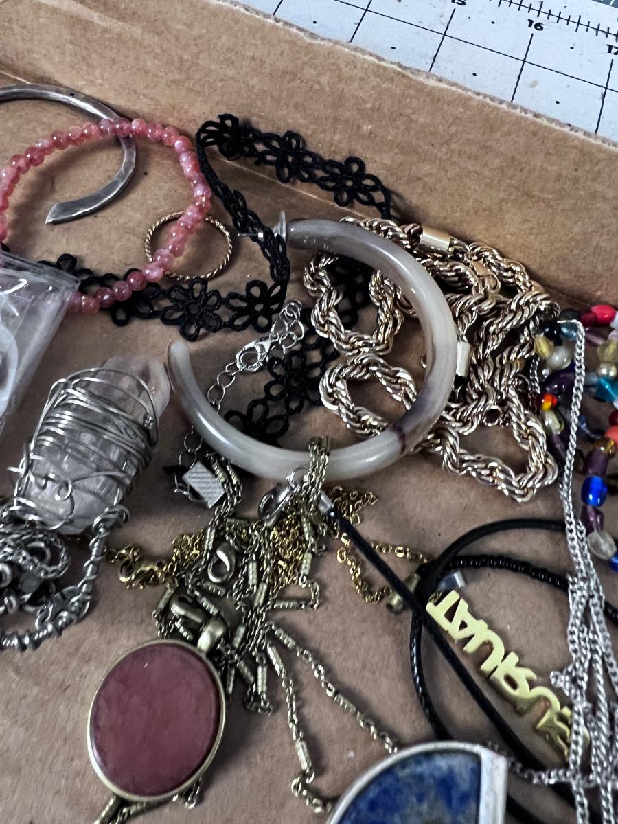 Used And mostly Wearable. Some single Earrings and some Clasps broken.