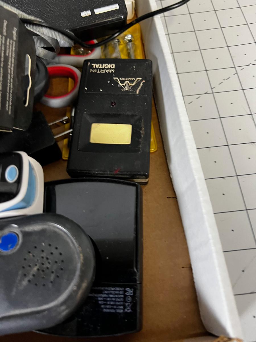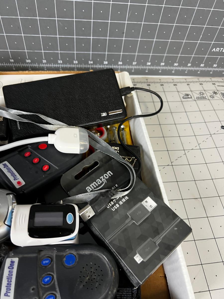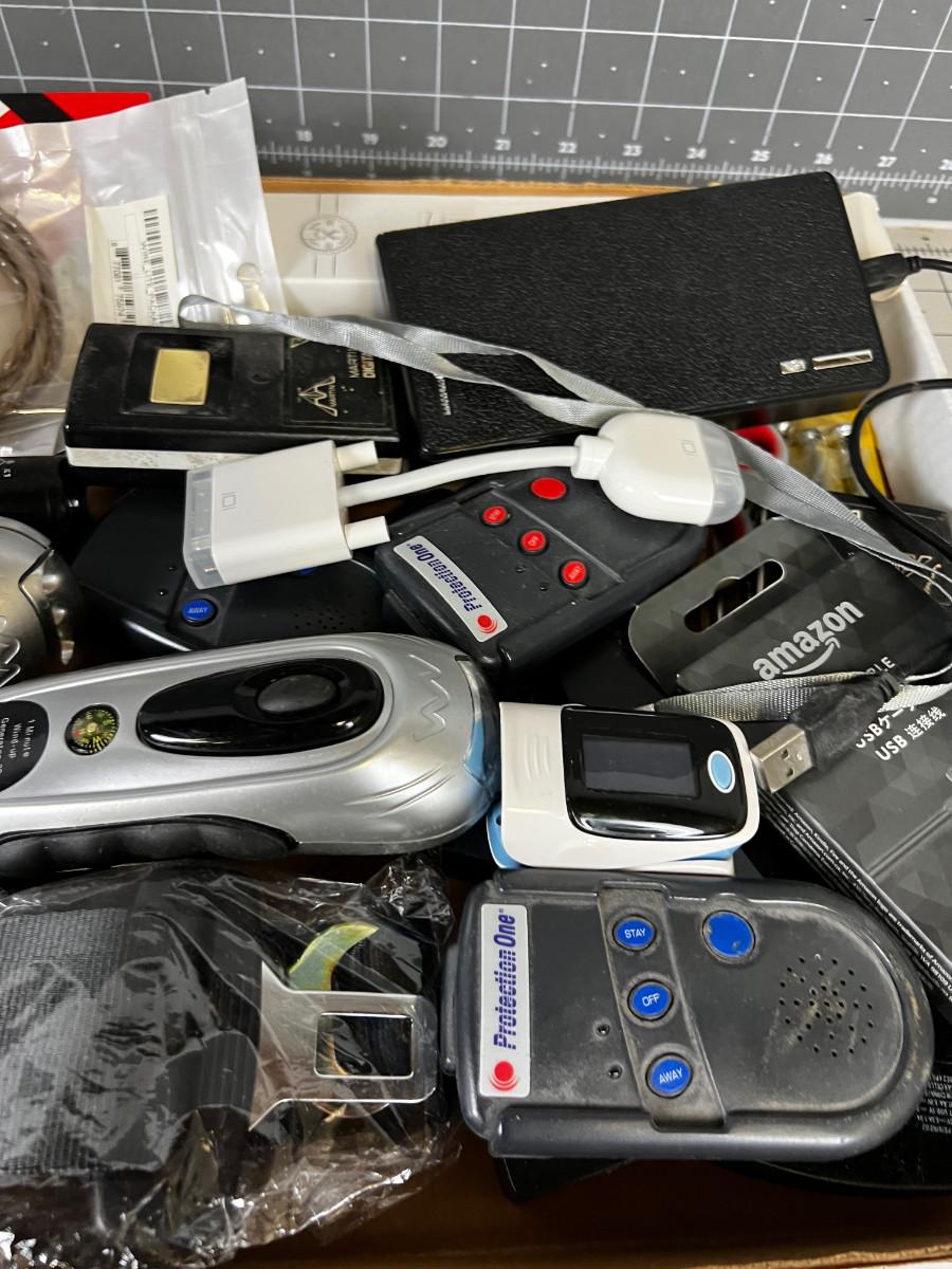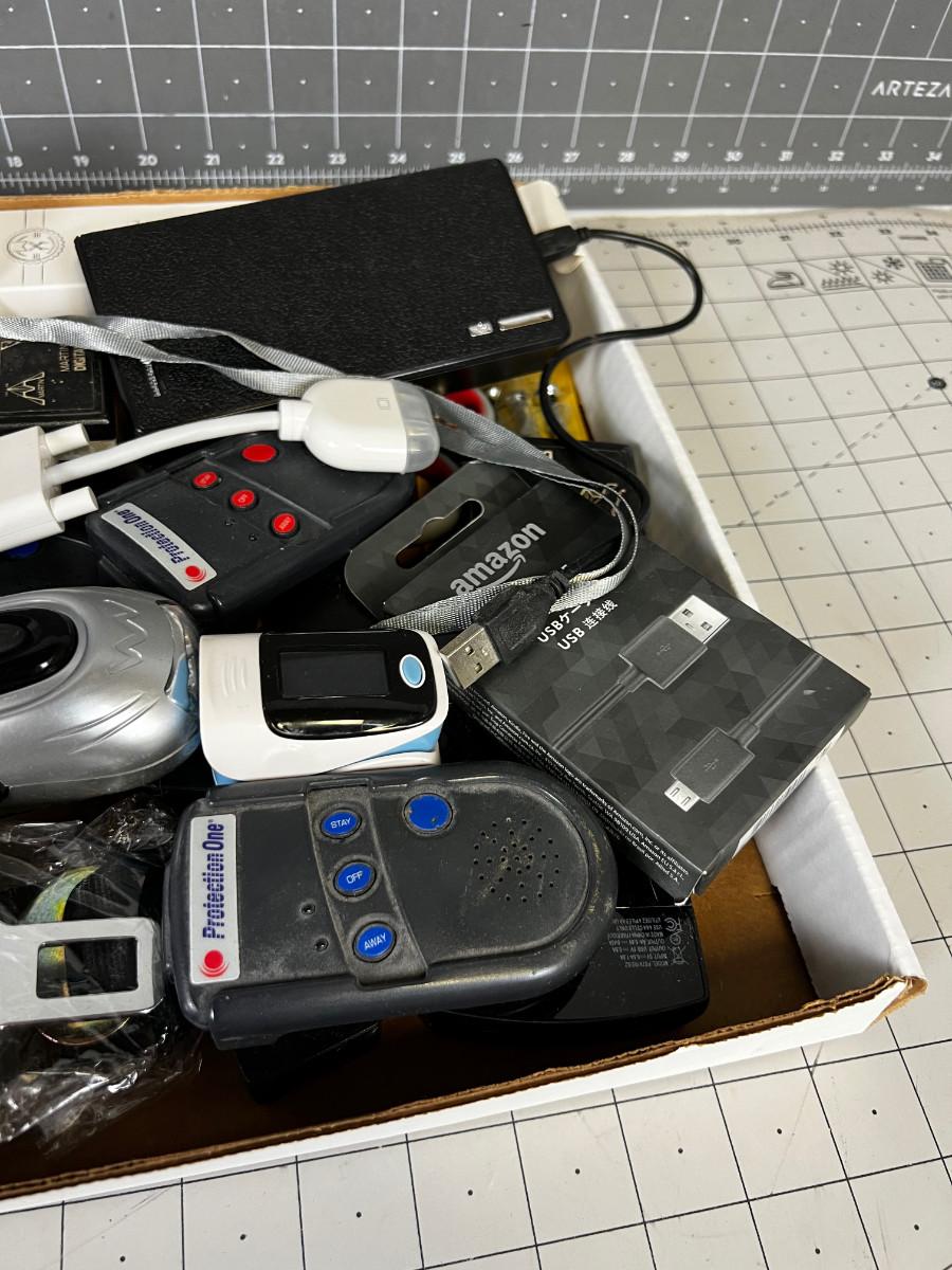 Tray of Electrical things; Cables, juice pack, garage Door openers, Alarms