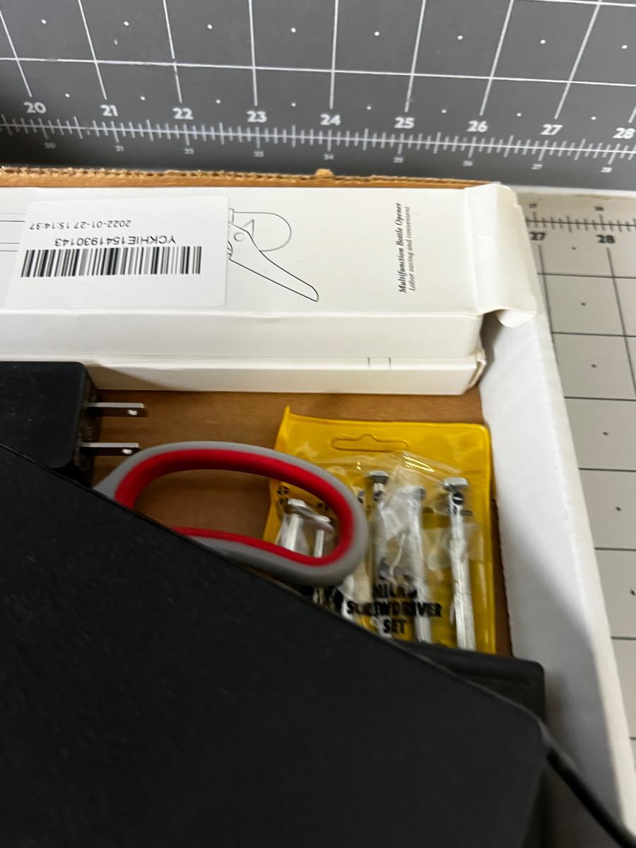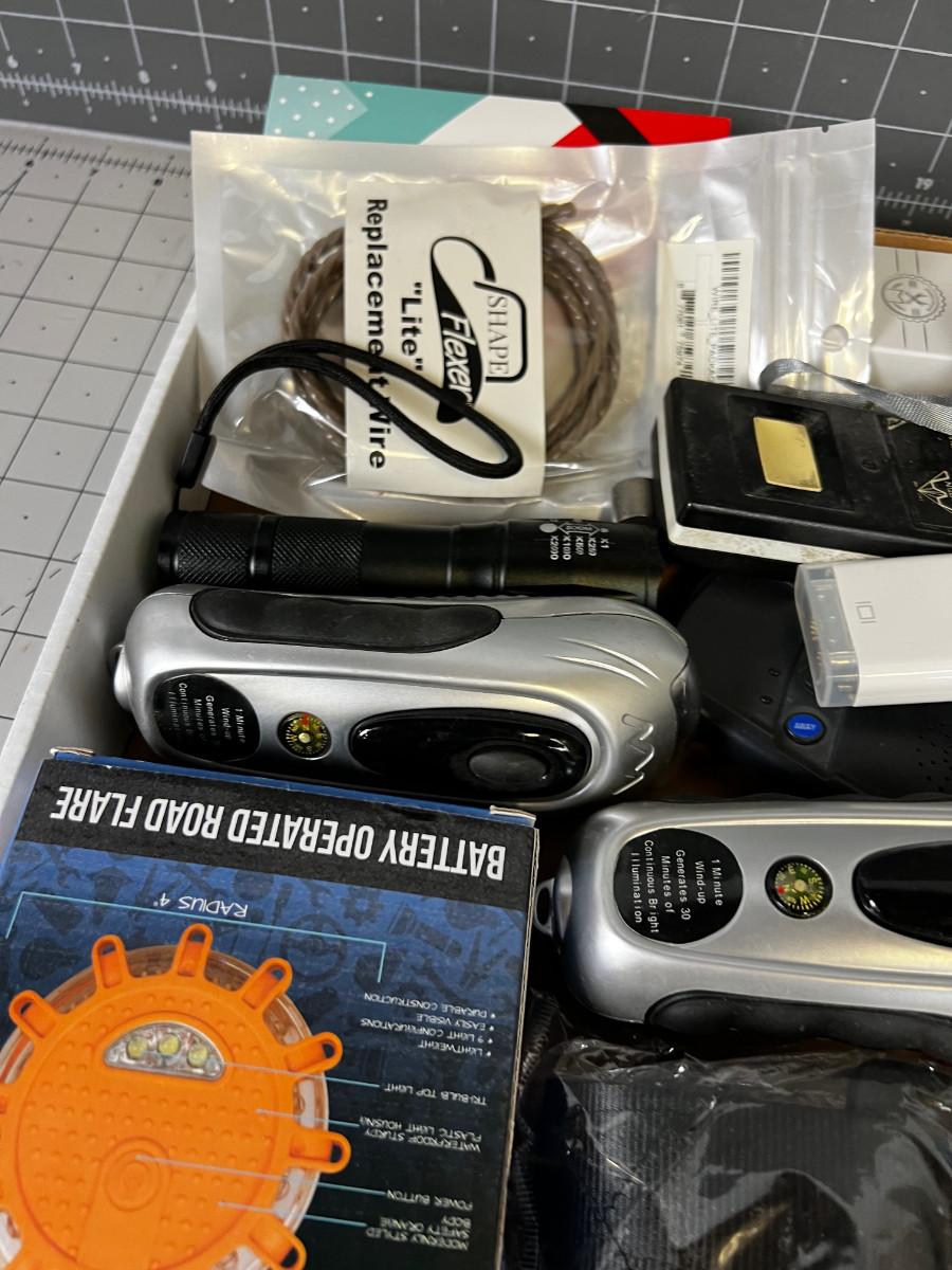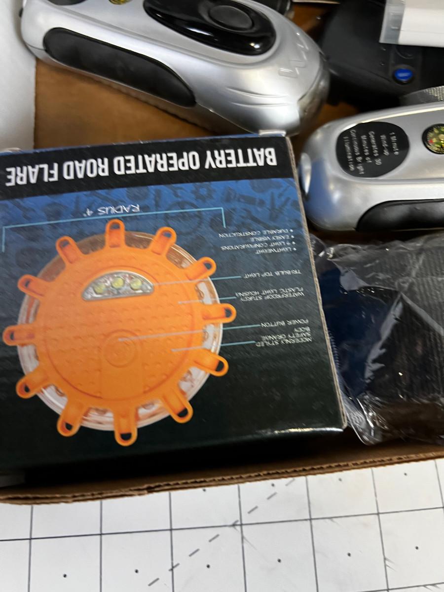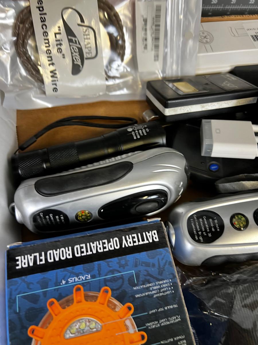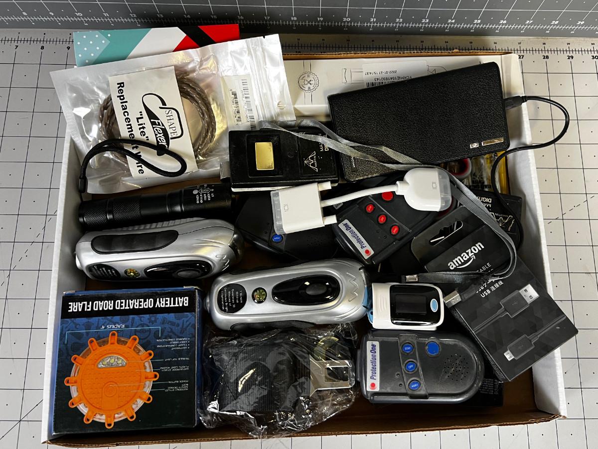 Tray of Electrical things; Cables, juice pack, garage Door openers, Alarms