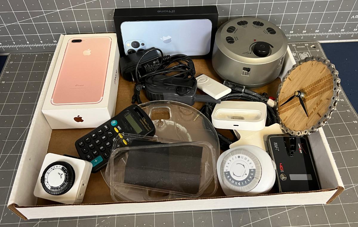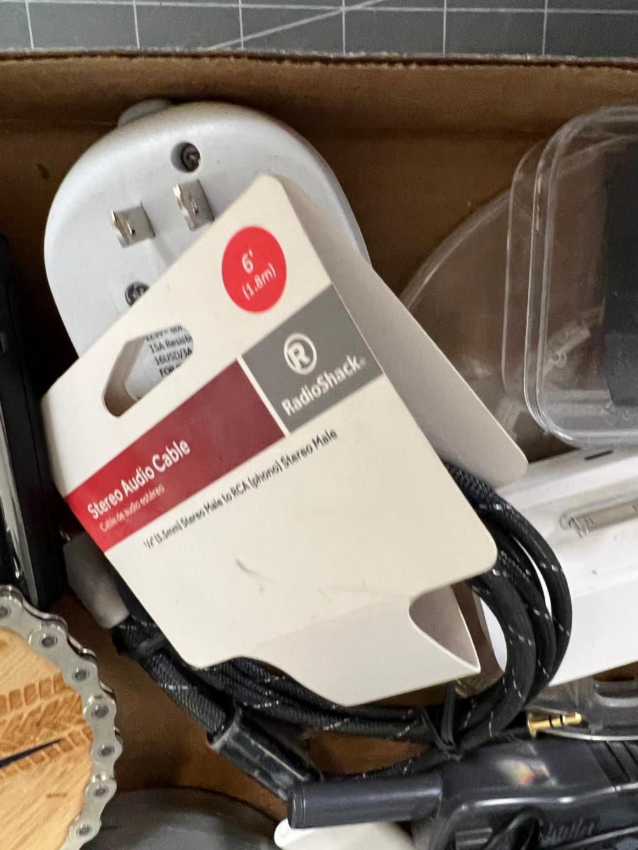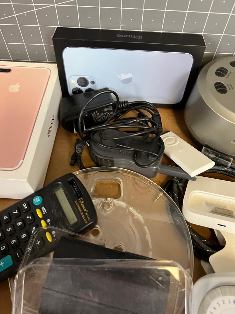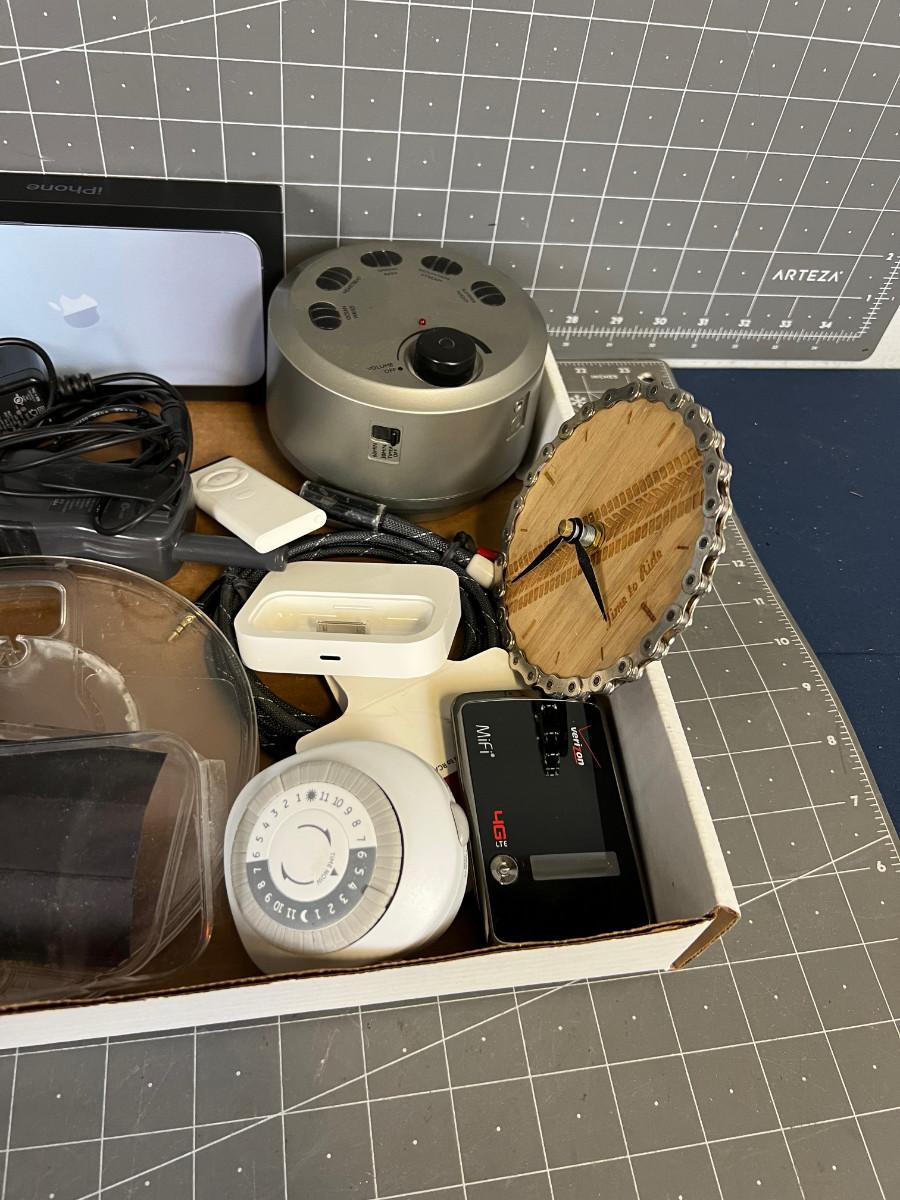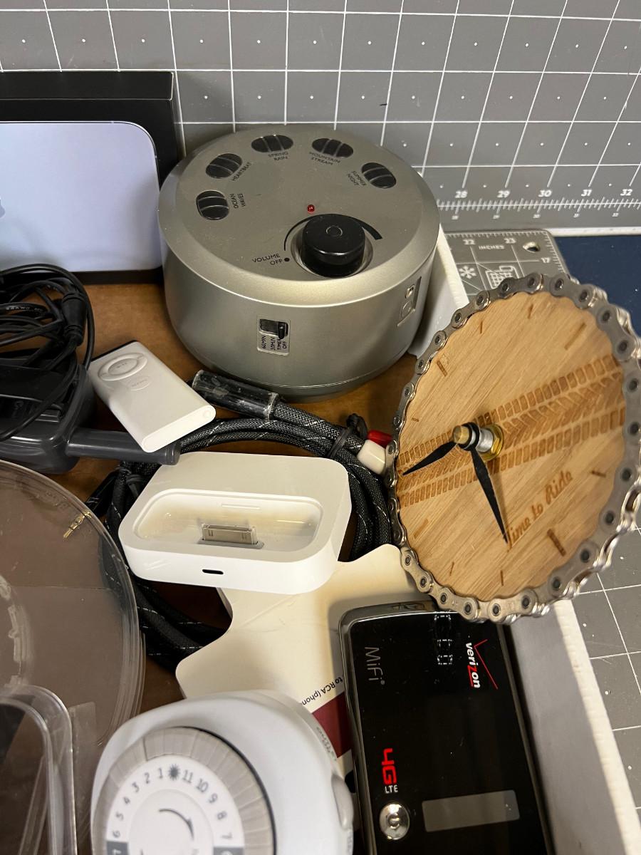 Tray of Electronics; MP3, Cables, Clock Sound Machine