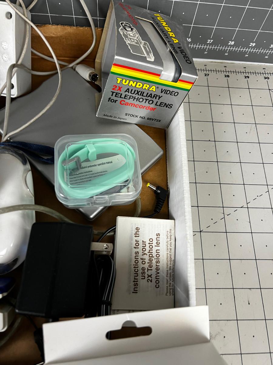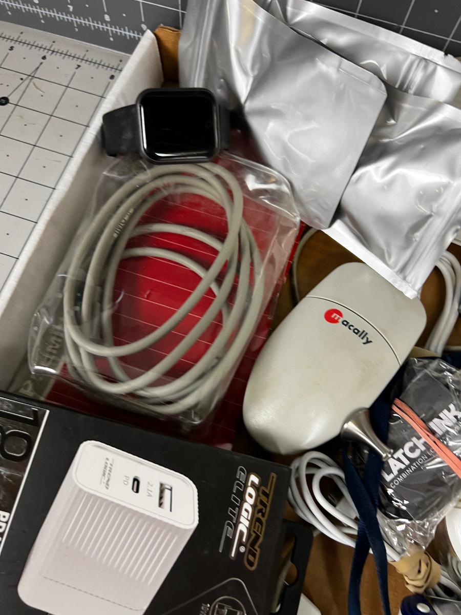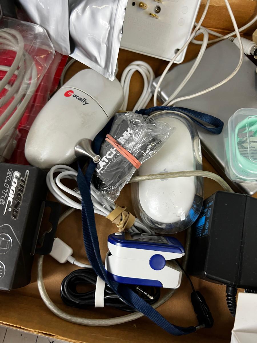 Tray of Electronics; Oximeter, Cables Computer Mouse Watch.