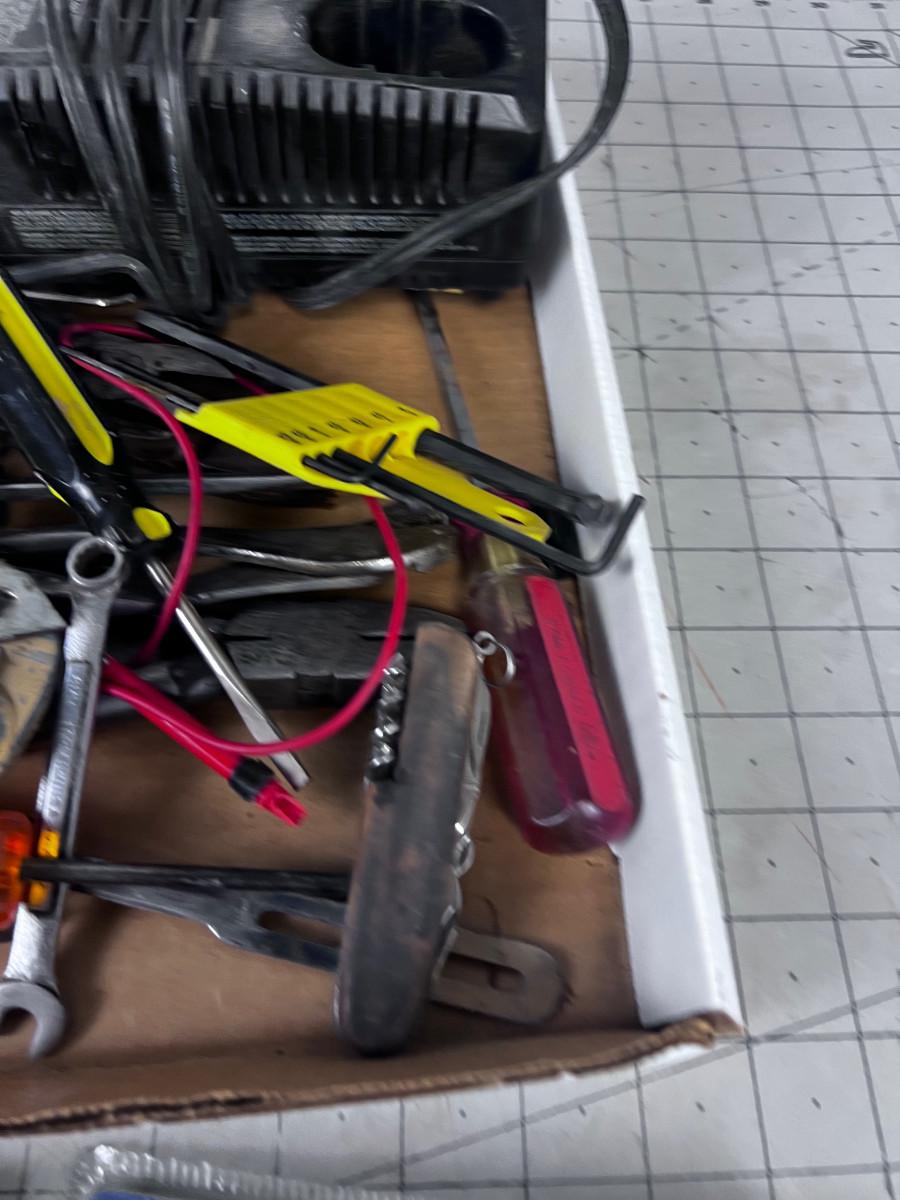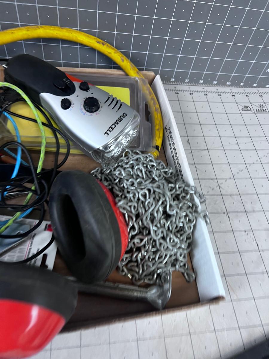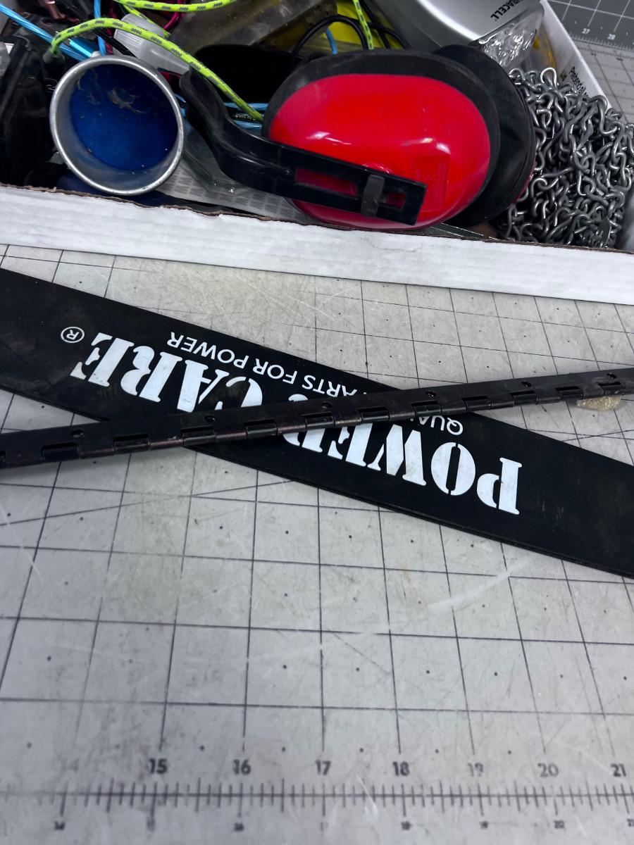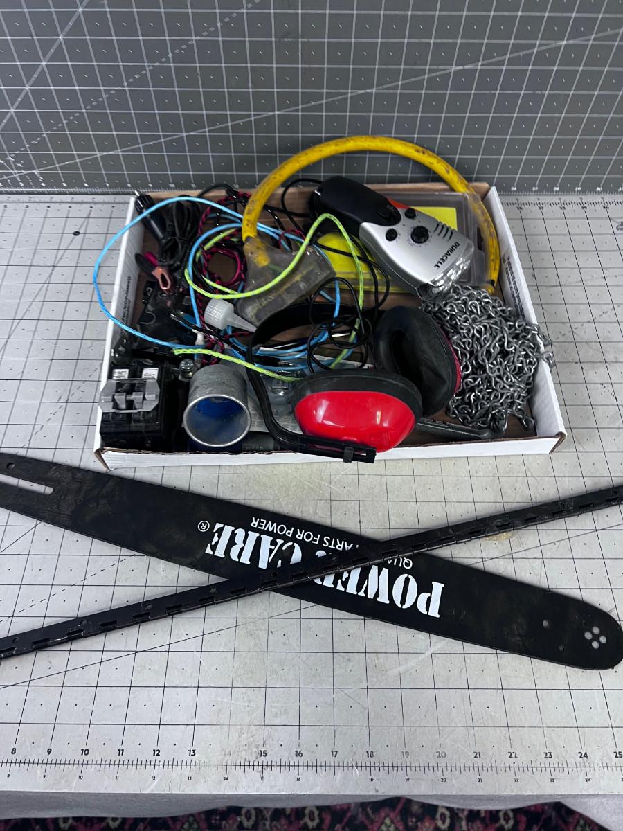 Tray of Garage Stuff; Chain Saw Bar, Cables, Hearing Protection.