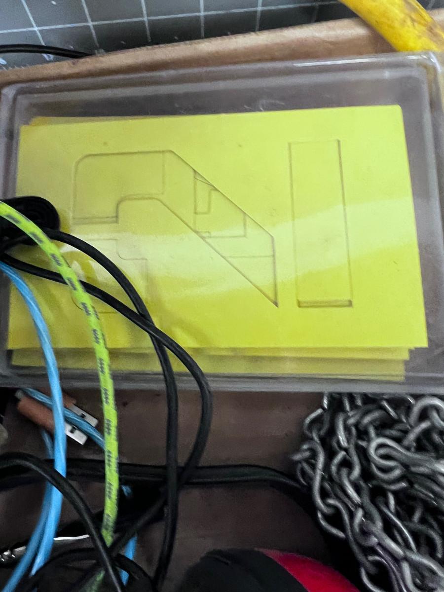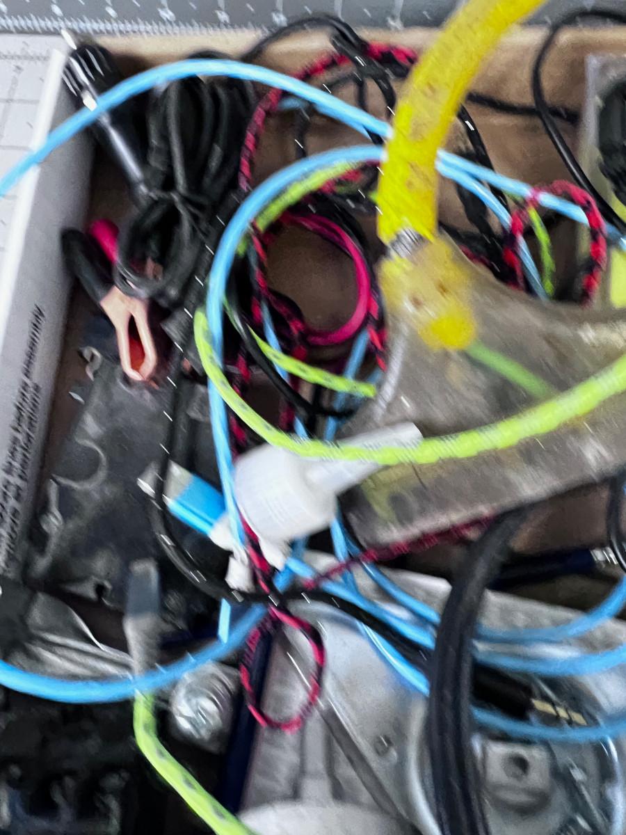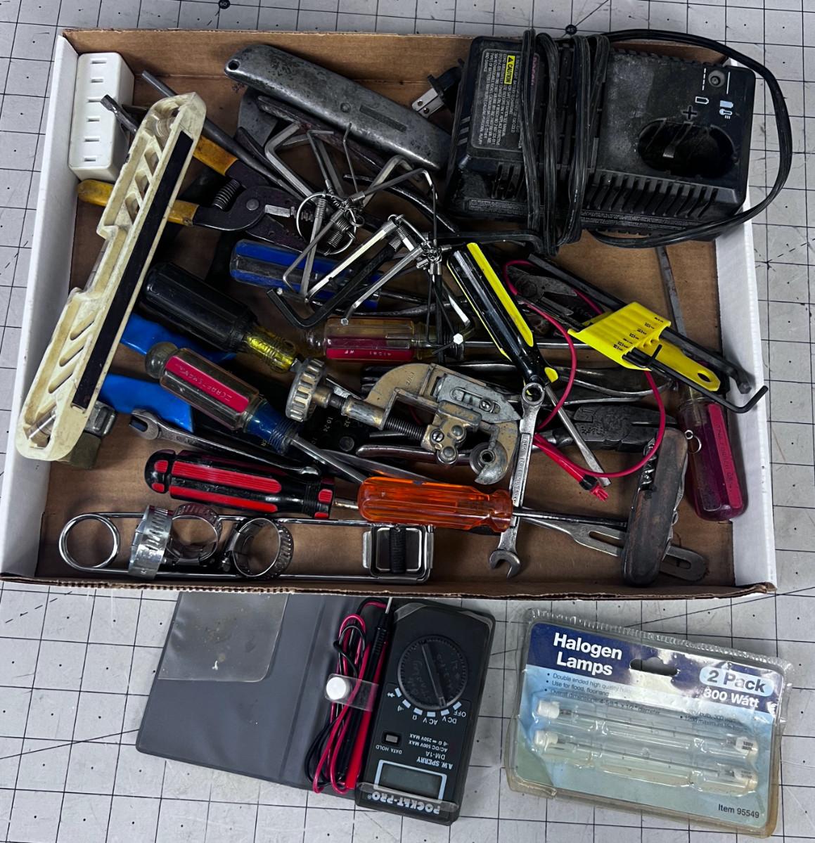 Tray of Garage Stuff; Chain Saw Bar, Cables, Hearing Protection.