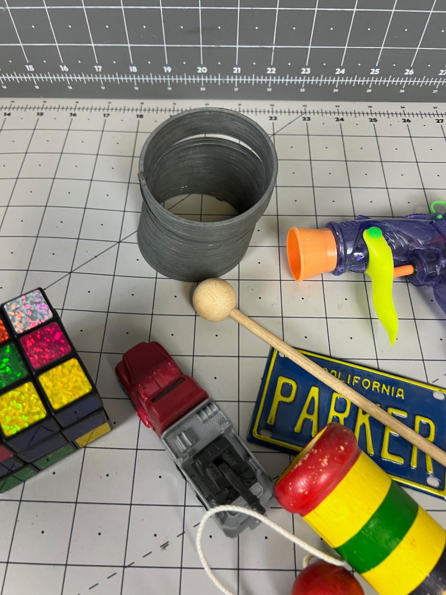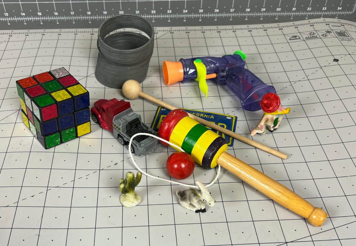 Tray of Great Classic Toys: Slinky, Rubik's Cube etc.