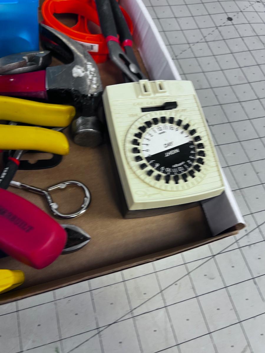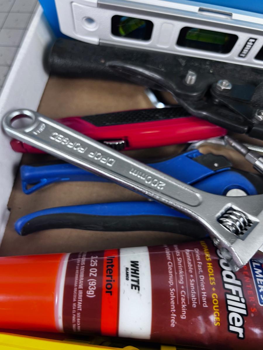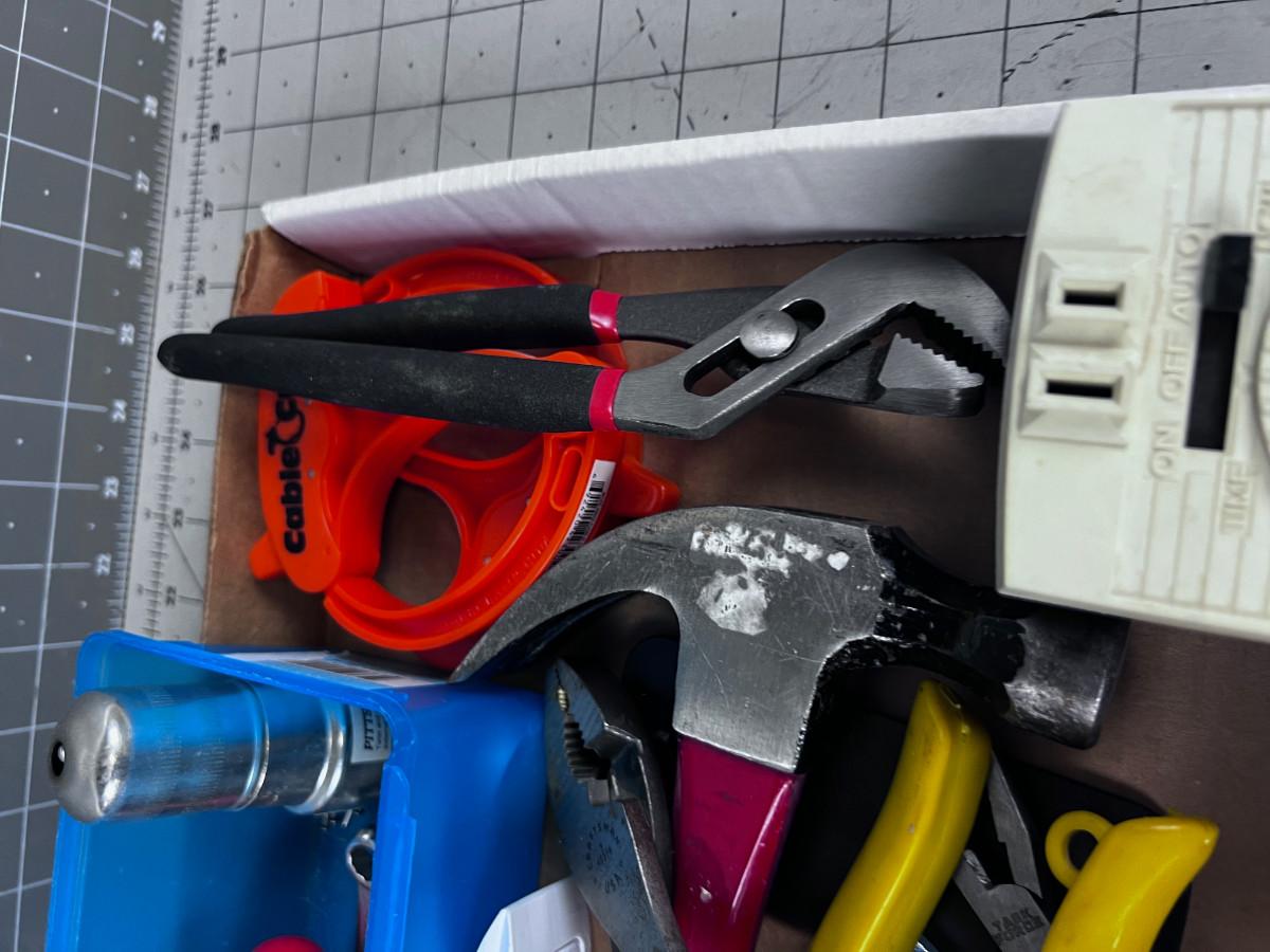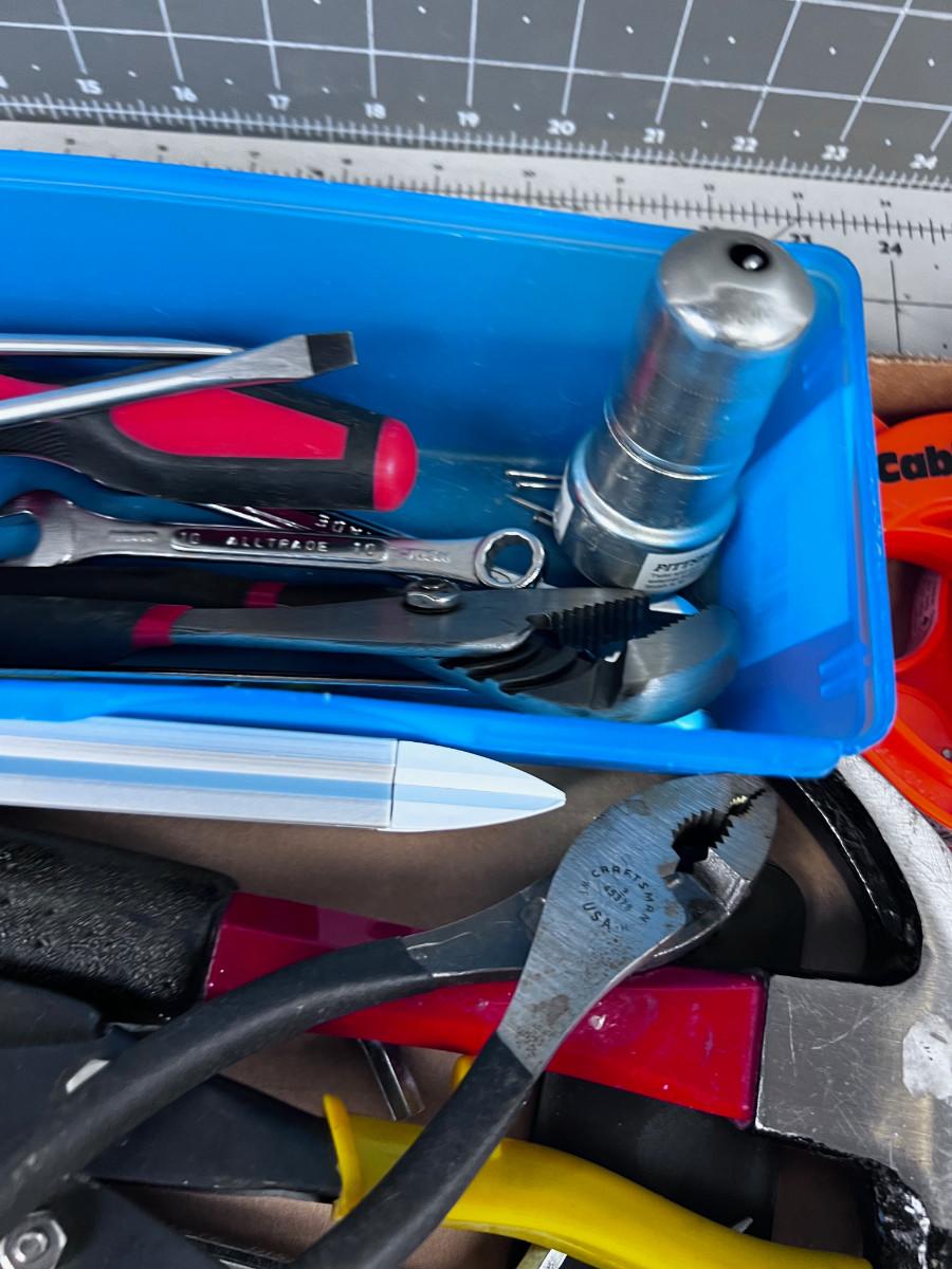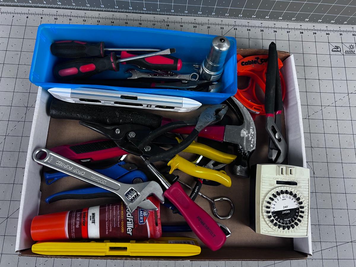 Tray of Hand Tools: Level, Tin Snips, Screw Drivers