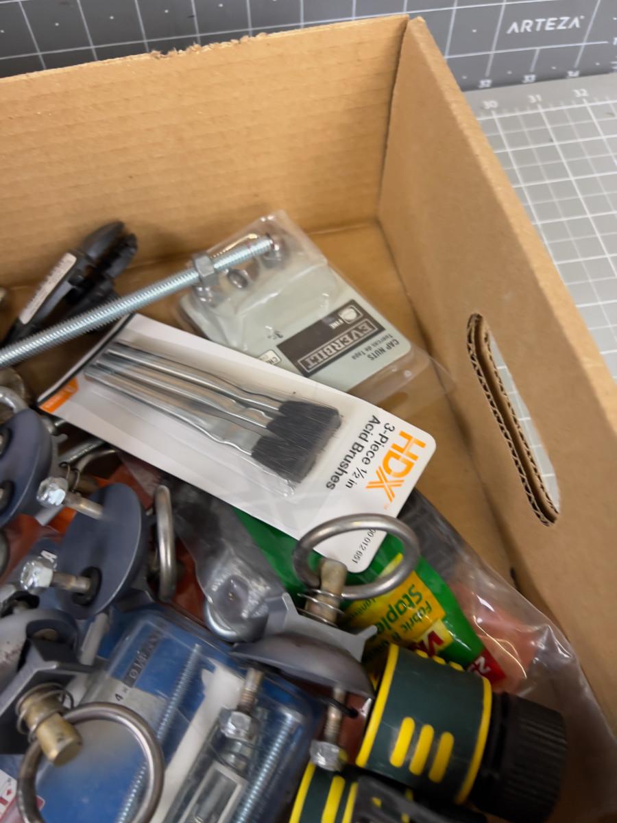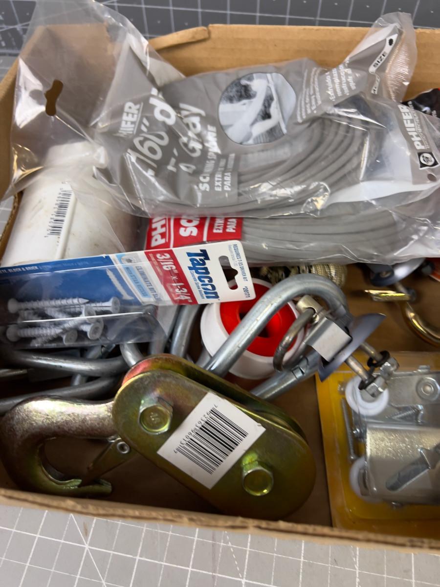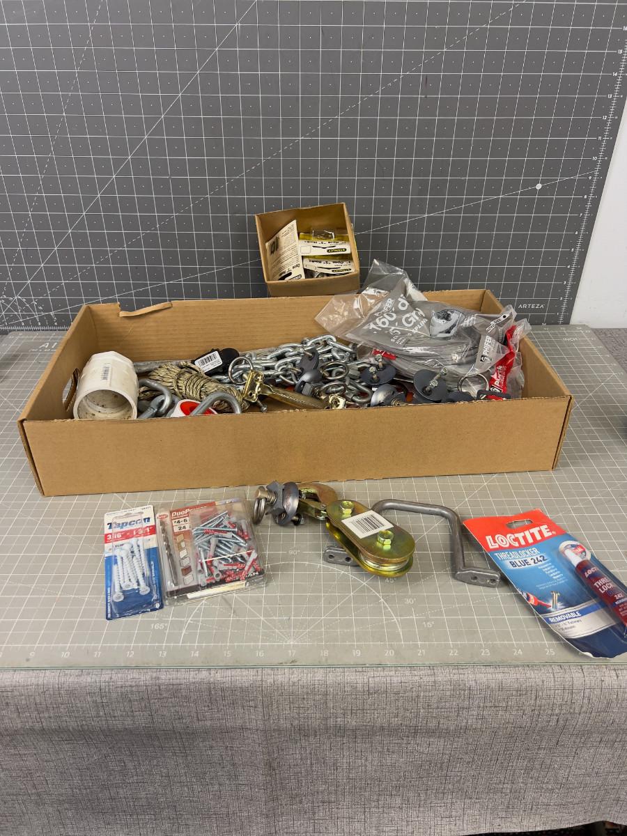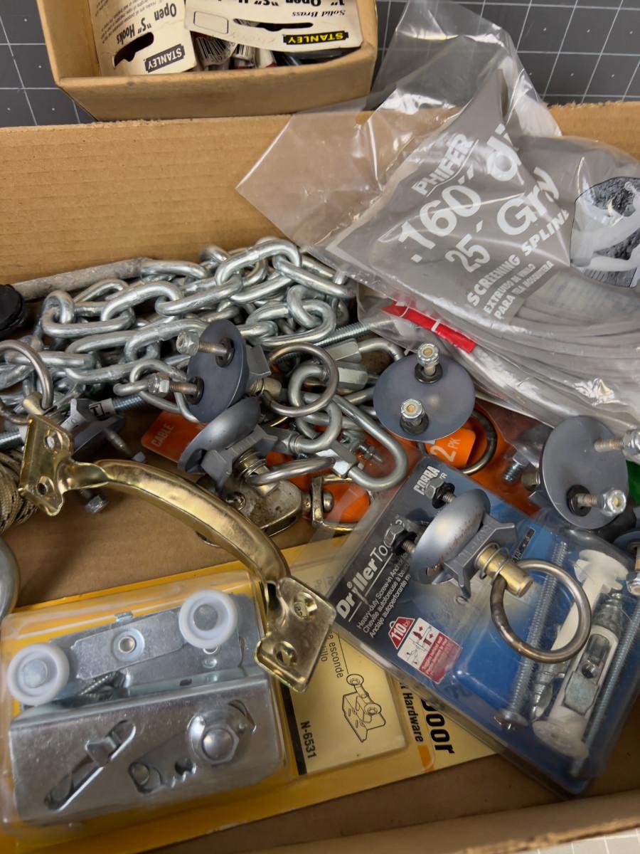 Tray of Hardware; Hooks, Chain, Screws
