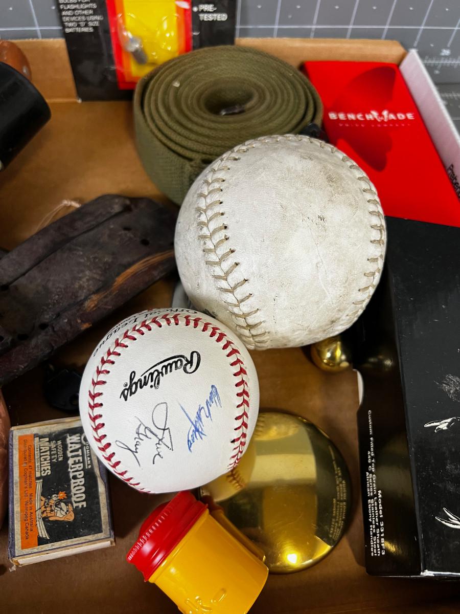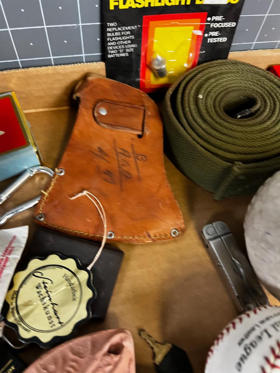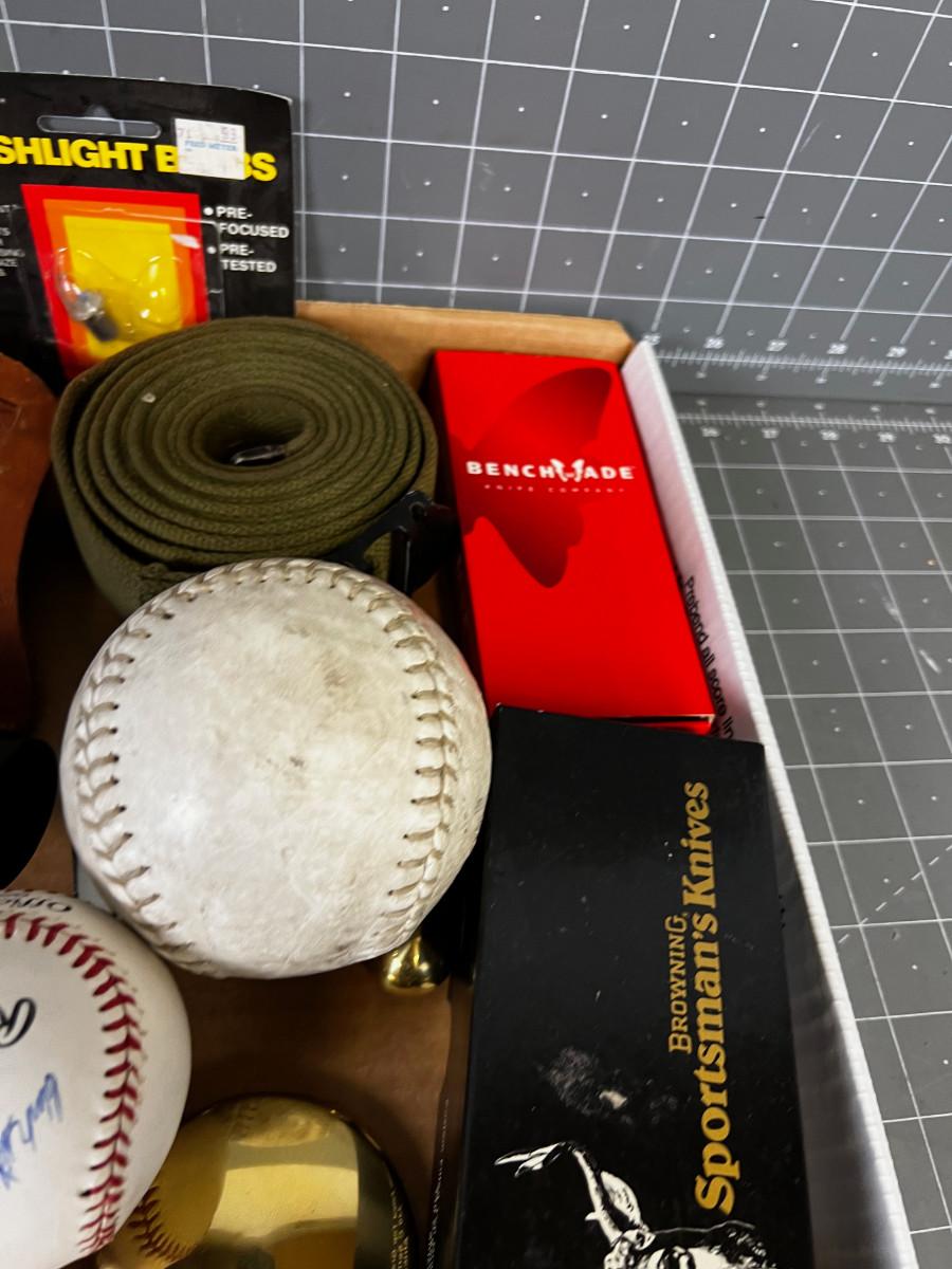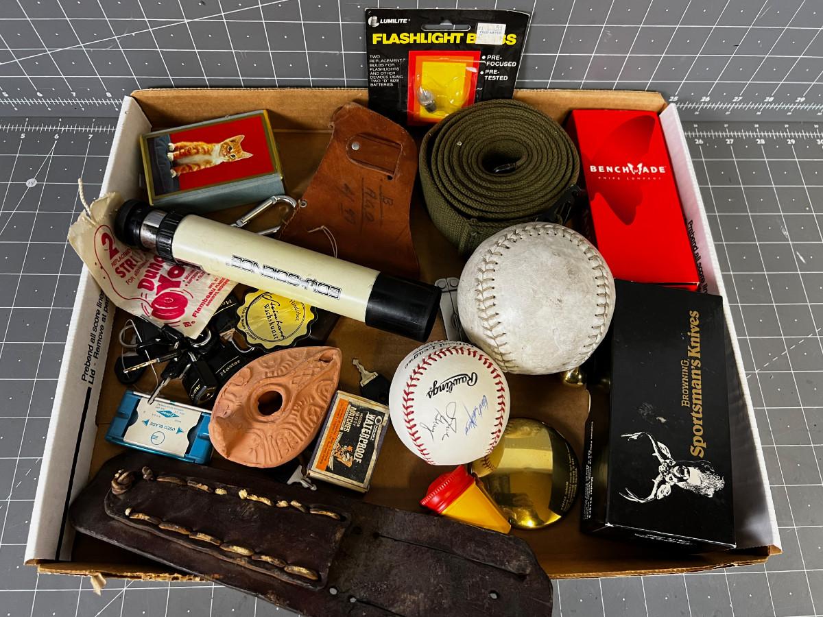 Tray of Interesting Masculine Items: Sheath, Baseball, Knife Boxes (Empty)